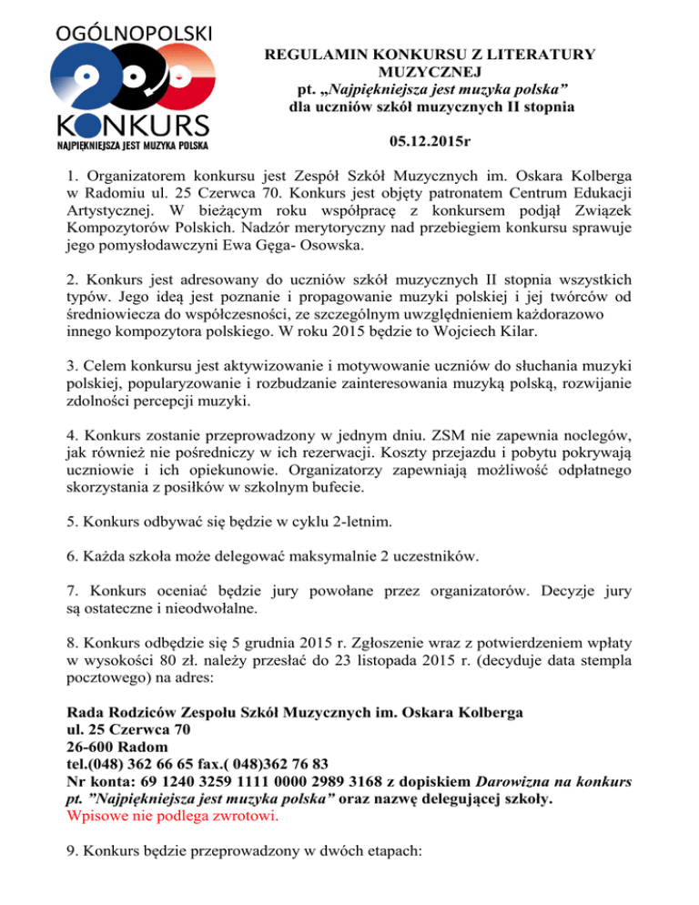 REGULAMIN KONKURSU Z LITERATURY MUZYCZNEJ pt. „Najpiękniejsza jest muzyka polska” dla uczniów szkół muzycznych II stopnia 05.12.2015r 1. Organizatorem konkursu jest Zespół Szkół Muzycznych im. Oskara Kolberga w Radomiu ul. 25 Czerwca 70. Konkurs jest objęty patronatem Centrum Edukacji Artystycznej. W bieżącym roku współpracę z konkursem podjął Związek Kompozytorów Polskich. Nadzór merytoryczny nad przebiegiem konkursu sprawuje jego pomysłodawczyni Ewa Gęga- Osowska. 2. Konkurs jest adresowany do uczniów szkół muzycznych II stopnia wszystkich typów. Jego ideą jest poznanie i propagowanie muzyki polskiej i jej twórców od średniowiecza do współczesności, ze szczególnym uwzględnieniem każdorazowo innego kompozytora polskiego. W roku 2015 będzie to Wojciech Kilar. 3. Celem konkursu jest aktywizowanie i motywowanie uczniów do słuchania muzyki polskiej, popularyzowanie i rozbudzanie zainteresowania muzyką polską, rozwijanie zdolności percepcji muzyki. 4. Konkurs zostanie przeprowadzony w jednym dniu. ZSM nie zapewnia noclegów, jak również nie pośredniczy w ich rezerwacji. Koszty przejazdu i pobytu pokrywają uczniowie i ich opiekunowie. Organizatorzy zapewniają możliwość odpłatnego skorzystania z posiłków w szkolnym bufecie. 5. Konkurs odbywać się będzie w cyklu 2-letnim. 6. Każda szkoła może delegować maksymalnie 2 uczestników. 7. Konkurs oceniać będzie jury powołane przez organizatorów. Decyzje jury są ostateczne i nieodwołalne. 8. Konkurs odbędzie się 5 grudnia 2015 r. Zgłoszenie wraz z potwierdzeniem wpłaty w wysokości 80 zł. należy przesłać do 23 listopada 2015 r. (decyduje data stempla pocztowego) na adres: Rada Rodziców Zespołu Szkół Muzycznych im. Oskara Kolberga ul. 25 Czerwca 70 26-600 Radom tel.(048) 362 66 65 fax.( 048)362 76 83 Nr konta: 69 1240 3259 1111 0000 2989 3168 z dopiskiem Darowizna na konkurs pt. ”Najpiękniejsza jest muzyka polska” oraz nazwę delegującej szkoły. Wpisowe nie podlega zwrotowi. 9. Konkurs będzie przeprowadzony w dwóch etapach: I etap - test pisemny znajomości utworów polskiej literatury muzycznej (prezentowane będą 1,5-minutowe fragmenty utworów z dołączonej listy 20 przykładów-patrz załącznik do I etapu). W tym etapie mogą pojawić się opracowania i transkrypcje obowiązkowych utworów. Zadaniem uczestników jest rozpoznanie pierwowzoru. II etap –składa się z dwóch części A i B. Część A to test pisemny znajomości utworów Wojciecha Kilara (prezentowane będą 2-minutowe fragmenty utworów z dołączonej listy 10 przykładów –patrz załącznik do części A). W tej części mogą pojawić się fragmenty partytur obowiązkowych utworów Wojciecha Kilara. Zadaniem uczestników jest ich rozpoznanie. Część B została przygotowana przez Związek Kompozytorów Polskich i jej tematem jest polska muzyka współczesna. Warunkiem uczestnictwa w II etapie konkursu jest uzyskanie minimum 70% właściwych odpowiedzi w teście I-go etapu. Uczestnicy drugiego etapu konkursu mogą brać udział w części A lub B lub A i B. O kolejności miejsc w konkursie decyduje suma punktów zdobytych w I i II etapie. Ogłoszenie wyników II-go etapu nastąpi w dniu konkursu. 10. Laureaci części A otrzymują nagrody rzeczowe i dyplomy ufundowane przez ZSM im. O. Kolberga w Radomiu. Laureaci części B zostaną nagrodzeni przez Związek Kompozytorów Polskich (patrz załącznik do części B). Wszyscy uczestnicy i ich nauczyciele dostają pamiątkowe dyplomy. 11. Udział w konkursie jest równoważny z akceptacją niniejszego regulaminu. 12. Zamierzeniem organizatorów jest także, aby konkursowi towarzyszył występ artysty lub zespołu wykonującego utwory muzyki polskiej. 13. Załącznik do I etapu. Lista utworów 1. Adam Jarzębski -Chromatica 2. Andrzej Rohaczewski -Canzona a 3. Andrzej Panufnik -Sinfonia sacra 4. Andrzej Panufnik -Koncert na skrzypce i orkiestrę smyczkową 5. Andrzej Panufnik -Sinfonia votiva 6. Anonim -Omnia beneficia 7. Anonim -Pieśń o Wiklefie 8. Bartłomiej Pękiel -Missa Paschalis – Kyrie 9. Feliks Janiewicz -V Koncert skrzypcowy e-moll 10. Feliks Nowowiejski -Uwertura Legenda Bałtyku 11. Fryderyk Chopin -3 Mazurki z op. 33 ( gis, D, C) 12. Fryderyk Chopin -4 Ballady (op.23, 38, 47, 52) 13. Fryderyk Chopin -I Koncert fortepianowy e-moll op.11 14. Fryderyk Chopin -II Koncert fortepianowy f-moll op.21 15. Fryderyk Chopin -Rondo a’la Krakowiak op.14 16. Fryderyk Chopin -Sonata wiolonczelowa g-moll op.65 17. Grażyna Bacewicz -Koncert na orkiestrę smyczkową 18. Grażyna Bacewicz -IV Kwartet smyczkowy 19. Grażyna Bacewicz -Muzyka na smyczki, trąbkę i perkusję. 20. Grzegorz Gerwazy Gorczycki -Laetatus sum 21. Henryk Wieniawski -II Koncert skrzypcowy d-moll op.22 22. Henryk Wieniawski -Legenda op.17 23. Henryk Mikołaj Górecki -III Symfonia pieśni żałosnych op.36 24. Henryk Mikołaj Górecki -Pieśni maryjne op.54 25. Henryk Mikołaj Górecki -Już się zmierzcha, muzyka na kwartet smyczkowy op.62 26. Ignacy Jan Paderewski -Fantazja polska gis-moll op.19 27. Jan Wański -Symfonia D-dur 28. Józef Elsner -Uwertura do opery Leszek Biały 29. Józef Zeidler -Veni creator 30. Juliusz Zarębski -Kwintet fortepianowy g-moll op.34 cz. I 31. Karol Kurpiński -Warszawianka 32. Karol Lipiński -Koncert skrzypcowy II „Wojskowy” op.21 33. Karol Szymanowski -Etiuda b-moll op. 4 nr 3 34. Karol Szymanowski - I koncert skrzypcowy op. 35 35. Karol Szymanowski - Stabat Mater op. 53 36. Karola Szymanowski - IV Symfonia koncertująca op.60 37. Kazimierz Serocki -Oberek 38. Krzysztof Penderecki -Requiem Polskie - Lacrimosa, Agnus Dei, 39. Krzysztof Klabon -V Pieśń Kaliopy Słowieńskiej 40. Ludomir Różycki -Balet „Pan Twardowski” 41. Marcin Mielczewski -Deus in Nomine Tuo 42. Marcin Leopolita -Missa Paschalis – Credo 43. Mieczysław Karłowicz -Koncert skrzypcowy A – dur op.8 44. Mieczysław Karłowicz -Stanisław i Anna Oświecimo