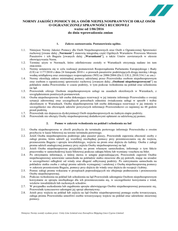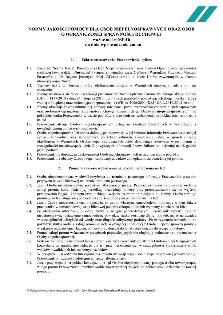 NORMY JAKOŚCI POMOCY DLA OSÓB NIEPEŁNOSPRAWNYCH ORAZ OSÓB O OGRANICZONEJ SPRAWNOŚCI RUCHOWEJ ważne od 1/06/2016 do dnia wprowadzenia zmian 1. 1.1. 1.2. 1.3. 1.4. 1.5. 1.6. 1.7. 1.8. Niniejsze Normy Jakości Pomocy dla Osób Niepełnosprawnych oraz Osób o Ograniczonej Sprawności ruchowej [zwane dalej „Normami”] stanowią integralną część Ogólnych Warunków Przewozu Morzem Pasażerów i ich Bagażu [zwanych dalej „Warunkami”], a także Umów zawieranych w okresie obowiązywania Norm. Terminy użyte w Normach, które zdefiniowane zostały w Warunkach otrzymują nadane im tam znaczenie. Normy ustanawia się w celu realizacji postanowień Rozporządzenia Parlamentu Europejskiego i Rady (UE) nr 1177/2010 z dnia 24 listopada 2010 r. o prawach pasażerów podróżujących drogą morską i drogą wodną sródlądową oraz zmieniające rozporządzenie (WE) nr 2006/2004 (Dz.U.UE.L.2010.334.1 ze zm.) Normy określają zakres minimalnej pomocy udzielanej przez Przewoźnika osobom niepełnosprawnym oraz osobom o ograniczonej sprawności ruchowej [zwanym dalej „Osobami niepełnosprawnymi”] na pokładzie statku Przewoźnika w czasie podróży, w tym podczas wchodzenia na pokład oraz schodzenia na ląd. Przewoźnik oferuje Osobom niepełnosprawnym usługi na zasadach określonych w Warunkach, z uwzględnieniem poniższych postanowień. Osoba niepełnosprawna lub osoba dokonująca rezerwacji w jej imieniu informuje Przewoźnika o swojej sytuacji zdrowotnej oraz szczególnych potrzebach odnośnie świadczenia usługi w sposób i trybie określonym w Warunkach. Osoba niepełnosprawna lub osoba dokonująca rezerwacji w jej imieniu w szczególności ma obowiązek udzielić powyższych informacji Przewoźnikowi co najmniej na 48 godzin przed podróżą. Przewoźnik nie dopuszcza dyskryminacji Osób niepełnosprawnych na żadnym etapie podróży. Przewoźnik nie obciąży Osoby niepełnosprawnej dodatkowymi opłatami za udzieloną jej pomoc. 2. 2.1. 2.2. 2.3. 2.4. 2.5. 2.6. 2.7. 2.8. Zakres zastosowania. Postanowienia ogólne. Pomoc w zakresie wchodzenia na pokład i schodzenia na lad Osoba niepełnosprawna w chwili przybycia do terminalu portowego informuje Przewoźnika o swoim przybyciu w kasie biletowej na terenie terminalu portowego. Jeżeli Osoba niepełnosprawna podróżuje jako pasażer pieszy, Przewoźnik zapewnia obecność osoby z załogi promu, która udzieli jej wszelkiej niezbędnej pomocy przy przemieszczaniu się do wejścia, przenoszeniu Bagażu i sprzętu inwalidzkiego, wejściu na prom oraz dojściu do kabiny. Osoba z załogi promu udzieli analogicznej pomocy przy zejściu Osoby niepełnosprawnej na ląd. Jeżeli Osoba niepełnosprawna przyjeżdża na prom własnym samochodem, informuje o tym fakcie pracownika w samochodowej kasie biletowej podczas zakupu biletu lub wymiany vouchera na bilet. Po otrzymaniu informacji, o której mowa w ustępie poprzedzającym, Przewoźnik zapewni Osobie niepełnosprawnej ustawienie samochodu na pokładzie statku stosowne dla jej potrzeb, mając na uwadze w szczególności odległość od windy oraz długość odbywanej podróży. Po zatrzymaniu samochodu na pokładzie statku osoba z załogi promu udziela wymaganej i ustalonej z Osobą niepełnosprawną pomocy w zakresie przeniesienia Bagażu, pomocy przy dojściu do windy oraz dojściu do recepcji i kabiny. Pomoc załogi promu wskazana w przepisach poprzedzających nie obejmuje podnoszenia i przenoszenia Osoby niepełnosprawnej. Podczas wchodzenia na pokład lub schodzenia na ląd Przewoźnik udostępnia Osobom niepełnosprawnym korzystanie ze sprzętu niezbędnego dla ich przemieszczania się, w szczególności korzystania z wind, wózków inwalidzkich lub ruchomych schodów. W przypadku uszkodzenia lub zagubienia sprzętu ułatwiającego Osobie niepełnosprawnej poruszanie się, Przewoźnik tymczasowo udostępni jej sprzęt alternatywny. Jeżeli przy wejściu na pokład lub zejściu na ląd Osobie niepełnosprawnej pomaga osoba towarzysząca, załoga promu Przewoźnika umożliwi osobie towarzyszącej wejście na pokład oraz udzielenie stosownej pomocy. Niniejsze Normy zostały wydane przez: Unity Line Limited oraz Euroafrica Shipping Lines Cyprus Limited. 2.9. Informacje niezbędne dla Osoby niepełnosprawnej dotyczące wejścia na pokład oraz zejścia na ląd Przewoźnik udostępnia na stronie internetowej oraz w formie ogłoszenia w kasie na terenie terminalu portowego. Wszelkie niezbędne informacje będą również udzielane ustnie przez załogę promu. 3. 3.1. 3.2. 3.3. 3.4. 3.5. 3.6. 3.7. 3.8. 3.9. Pomoc na pokładzie statku. Załoga promu w czasie podróży zapewni Osobie niepełnosprawnej wszelką możliwą pomoc w zakresie jej funkcjonowania na statku, w szczególności zapewni jej pomoc przy przemieszczaniu się do kabiny oraz, na życzenie, w obrębie powierzchni pasażerskich (toalety, restauracje, caffeterie, sklepy, kasyna, bary itp.). Wszystkie punkty usługowe i handlowe wraz z restauracjami oraz inne usługi oferowane na pokładzie promu są dostępne dla Osób niepełnosprawnych. Przewoźnik zapewni Osobie niepełnosprawnej kabinę przystosowaną do jej potrzeb, z zastrzeżeniem ograniczeń wynikających z dostępności. Kabiny przeznaczone dla Osób niepełnosprawnych umiejscowione są możliwie najbliżej wind oraz recepcji, jak również wyposażone są w odpowiednią sygnalizację dla osób niepełnosprawnych. Jeżeli w czasie podróży Osobie niepełnosprawnej pomaga osoba towarzysząca, Przewoźnik zapewnia ich zakwaterowanie w kabinie wspólnie lub w kabinach położonych wobec siebie możliwe najbliżej. Wszystkie istotne informacje dotyczące przebiegu trasy Przewoźnik udostępnia w kasie biletowej na terenie terminalu portowego oraz w recepcji na promie. Wszelkie istotne informacje będą również przekazywane przez załogę promu. Na prośbę Osoby niepełnosprawnej, Przewoźnik przechowuje jej Bagaż w przechowalni. Przewoźnik dopuszcza przewóz sp