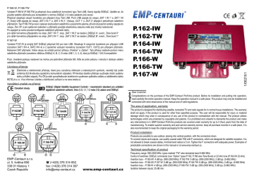P.162-IW P.162-TW P.164-IW P.164-TW P.166-W P.166-TW P.167-W P.167-W Výrobek P.167-W je dvojitý SAT DiSEqC přepínač 8/2 pro twin LNB. Obsahuje 8 vstupních konektorů pro připojení LNB (označení SAT1 IN1-4, SAT2 IN1-4) a 2 společné výstupní konektory (označení OUT1, OUT2) pro připojení přijímače. Nastavení SAT přijímače: Volba vstupu se ovládá pomocí příkazu „Position“ a „Option“. Tyto příkazy nastavte pomocí menu satelitního přijímače (označeno většinou DiSEqC A, B, C, D nebo LNB 1, 2, 3, 4), který je DiSEqC 1.0/2.0 kompatibilní. Pozn. Uvedené postupy nastavení se mohou pro jednotlivé přijímače lišit, řiďte se proto pokyny v návodu k obsluze vašeho satelitního přijímače. Likvidace přístroje Elektrické a elektronické přístroje, které jsou označeny některým z následujících symbolů, nesmějí být podle směrnice EU likvidovány společně s komunálním odpadem. Při likvidaci starého přístroje využívejte místní systémy sběru a třídění odpadů. Pro ČR je sběr zprostředkován kolektivním systémem zpětného odběru a odděleného sběru RETELA s.r.o. Více informací získáte u distributorů zařízení a na www.retela.cz Vysvětlení značek na přístroji DiSEqC (Digital Satellite Equipment Control) – mezinárodní standard pro ovládání digitálních satelitních zařízení, číslo (1.0, 1.1, 1.2 nebo 2.0) udává verzi DiSEqC Dear Customer Congratulations on the purchase of the EMP-Centauri Profi-line product. Before its installation and putting into operation, read carefully the entire operation manual. Keep the operation manual in a safe place. The product may only be installed and connected with strict observance of the manual and of valid regulations. English Označení shody 1/002151 P.166-W, P.166-TW Výrobek P.166-W (P.166-TW) je přepínač dvou satelitních konvertorů typu Twin LNB, řízený signály DiSEqC. Ujistěte se, že použité satelitní přijímače jsou kompatibilní s normou DiSEqC (1.0 nebo jakákoliv jiná verze). Přepínač obsahuje vstupní konektory pro připojení dvou Twin LNB. První LNB zapojte do vstupů „SAT 1 IN 1“ a „SAT 1 IN 2“; Druhý LNB zapojte do vstupů „SAT 2 IN 1“ a „SAT 2 IN 2“. Výstupy „OUT 1“ a „OUT 2“ připojte k jednotlivým satelitním přijímačům. Typ P.166-TW je navíc vybaven slučovačem satelitního a pozemního pásma, přívod od pozemní antény zapojte do vstupu „Terr. IN“ a pro opětovné rozbočení u přijímačů použijte účastnickou zásuvku nebo jiný vhodný rozbočovač. Po zapojení je nutno provést konfiguraci satelitních přijímačů takto: pro výběr konvertoru připojeného na vstup „SAT 1 IN 1“, resp. „SAT 1 IN 2“ se nastaví „DiSEqC A“, event. „Tone burst 0“ pro výběr konvertoru připojeného na vstup „SAT 2 IN 1“, resp. „SAT 2 IN 2“ se nastaví „DiSEqC B“, event. „Tone burst 1“ The area of application, warranty The product is designed for distributing satellite, terrestrial TV and radio signals for in normal house installations. The warranty shall not apply, if the product is used for other than specified purpose. The user will be responsible for injury or material damage which may arise in consequence of any use of the product in contradiction with the manual. The product utilizes technologies which are protected by copyrights and patents. It is prohibited and unlawful to dismantle the product and make any interventions in it. EMP-Centauri Profi-line products are covered under warranty for up to 4 (four) years from the date of manufacturing. To enable superior warranty and post service warranty service, keep all purchase records in a safe place. It is also recommended to keep the original packaging for the warranty period. Product installation Products are possible to use outdoor, placing into vertical position, with the connectors down. To connect inputs and outputs, use quality coaxial cable 75Ω with F connectors, which are designed for satellite reception. It is not allowed to break coaxial cables, minimal bend radius is 5 cm. Tighten the F connectors with adequate power. Examples of practicable connections are shown in this manual or at www.emp-centauri.cz. EMP-Centauri s.r.o. ul. 5. května 690 339 01 Klatovy 1 Czech Republic ( (+420) 376 314 852 fax: (+420) 376 314 367 [email protected] www.emp-centauri.cz Technical specification of product Frequency range: 950-2300 MHz, types marked “TW” also terrestrial band 5-862 MHz Control of switches: DiSEqC commands (non “Option” types P.162, P.166 also Tone Burst) or 22 kHz tone (P.162-IW 22 kHz) Insertion loss – P.162-IW: 4 dB typ. (950-2300 MHz); P.162-TW: 5 dB typ. (950-2300 MHz), 2 dB typ. (5-862 MHz) Insertion loss – P.164-IW, P.167-W: 5 dB typ. (950-2300 MHz); P.164-TW: 6 dB typ. (950-2300 MHz), 2 dB typ. (5-862 MHz) Insertion loss – P.166-W: 4 dB typ. (950-2300 MHz); P.166-TW: 5 dB typ. (950-2300 MHz), 5 dB typ. (5-862 MHz) Isolation between inputs: 25 dB min. P.162-IW, P.162-TW Product P.162-IW (P.162-TW) is switch for two satellite converters (LNBs), controlled by DiSEqC commands. Make sure that Your satellite receiver is either compatible with standard DiSEqC 1.0 (or higher), or is able to generate command “Tone burst”. (Warning: command “Tone burst” cannot be used for models P.162-IW “Option” and P.162-TW “Option”.) Switch marked “22 kHz” is controlled by tone 22 kHz. The switch includes input connectors for LNBs (“SAT IN 1”, “SAT IN 2”) and output connector for receiver (“OUT”). Model P.162-TW is further equipped with built-in combiner of satellite and terrestrial bands. Connect cable from terrestrial antenna to input “Terr. IN” and use appropriate wall socket or another suitable frequency splitter for feeding sat. receiver and TV set. After completing the instalation, it is necessary to set up Your satellite receiver: for selec