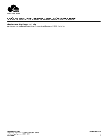 OGÓLNE WARUNKI UBEZPIECZENIA „MÓJ SAMOCHÓD” obowiązują od dnia 1 lutego 2017 roku zatwierdzone przez Zarząd Sopockiego Towarzystwa Ubezpieczeń ERGO Hestia SA. Skontaktuj się z nami: obsługa polis, zgłoszenie szkód 58 555 62 22, 801 107 108 obsługa zaległych płatności 58 555 63 00 www.mtu.pl D/OWU/MS/1701 1 Poniższa tabela informuje, które z zawartych w niniejszych Ogólnych Warunkach Ubezpieczenia „Mój Samochód” postanowień regulują zagadnienia wymienione w art. 17 ust. 1 ustawy z dnia 11 września 2015 r. o działalności ubezpieczeniowej i reasekuracyjnej. Numer jednostki redakcyjnej wzorca Nazwa ubezpieczenia Wspólne dla wszystkich ubezpieczeń Autocasco Assistance Następstwa nieszczęśliwych wypadków kierowcy i pasażerów Ochrona utraty zniżki AC, OC Ubezpieczenie szyb Zielona Karta Przesłanki wypłaty odszkodowania i innych świadczeń lub wartości wykupu ubezpieczenia: Ograniczenia oraz wyłączenia odpowiedzialności zakładu ubezpieczeń uprawniające do odmowy wypłaty odszkodowania i innych świadczeń lub ich obniżenia: — § 3, § 10 ust. 4, § 12 ust. 2-3, § 16 § 32 ,§ 33 ust. 1-2, § 34, § 35, § 38 ust. 1-2, § 39, § 40, § 41 § 14 ust. 4, § 33 ust. 3, § 36 ust. 1-2, § 37, § 38 ust. 3-4, § 44, § 45 § 62, § 65 ust. 1-2, § 66, § 63 ust. 5 § 64, § 65 ust. 3-5, § 63 ust. 3, § 66 ust. 3, § 67 ust. 1-2 § 60 ust. 2 § 61 ust. 3-4 § 47 ust. 1-4, § 48 ust. 1-2, § 51, § 52 ust. 1 § 47 ust. 5, § 48 ust. 3, § 50, § 51, § 52 ust. 2-3 § 53 ust. 1-3, § 54 ust. 2, § 59 ust. 1 § 30 ust. 1 § 53 ust. 4, § 54, § 57, § 59 ust. 2-3 — POSTANOWIENIA WSPÓLNE §1 1. 1. Informujemy, że Sopockie Towarzystwo Ubezpieczeń ERGO Hestia SA, zwane dalej „zakładem ubezpieczeń”, z siedzibą w Sopocie przy ul. Hestii 1, jest administratorem Pani/Pana danych osobowych, które zakład ubezpieczeń będzie przetwarzał w celu wywiązania się z umowy ubezpieczenia oraz dla wypełnienia prawnie usprawiedliwionych celów, którymi są marketing bezpośredni własnych produktów i usług oraz dochodzenie roszczeń z tytułu zawartej umowy ubezpieczenia. 2. Osoby, których dane osobowe są przetwarzane przez zakład ubezpieczeń, mają prawo wglądu do nich i mogą je poprawiać. Przetwarzanie tych danych w innych celach niż wskazane powyżej, wymaga uzyskania wcześniejszej zgody osoby, której dane dotyczą. 3. Na podstawie niniejszych Ogólnych Warunków Ubezpieczenia „Mój Samochód” zakład ubezpieczeń zawiera z osobami fizycznymi, osobami prawnymi i jednostkami organizacyjnymi niebędącymi osobami prawnymi, którym ustawa przyznaje zdolność prawną, zwanymi dalej „Ubezpieczającymi”, umowy ubezpieczenia: odpowiedzialności cywilnej posiadaczy pojazdów mechanicznych w ruchu zagranicznym (Zielona Karta), pojazdów mechanicznych od utraty, zniszczenia lub uszkodzenia (autocasco), szyb samochodowych, assistance, utraty zniżek oraz następstw nieszczęśliwych wypadków. DEFINICJE §2 Określenia użyte w dalszej części Ogólnych Warunków Ubezpieczenia przyjmują znaczenie określone w definicjach zamieszczonych poniżej: 1. AUDATEX to stosowany przez warsztaty samochodowe i firmy ubezpieczeniowe system komputerowy przeznaczony do tworzenia kalkulacji naprawy pojazdu powypadkowego; 2. AWARIA to wadliwe funkcjonowanie pojazdu spowodowane uszkodzeniami mechanicznymi, elektrycznymi, elektronicznymi lub hydraulicznymi, uniemożliwiające poruszanie się pojazdem; 3. CENTRUM ALARMOWE to jednostka organizacyjna wskazana przez zakład ubezpieczeń, która przyjmuje telefonicznie zgłoszenia szkód w ubezpieczonym pojeździe; 4. CIĄGNIK SAMOCHODOWY to pojazd samochodowy przeznaczony konstrukcyjnie wyłącznie do ciągnięcia przyczepy; określenie to obejmuje ciągnik siodłowy i ciągnik balastowy; 5. CZĘŚCI ALTERNATYWNE to części, których producent zaświadcza, że są one tej samej jakości, co oryginalne komponenty dla danego typu pojazdu; 6. DOKUMENTY POJAZDU to dowód rejestracyjny, karta pojazdu, świadectwo dopuszczenia pojazdu do ruchu (w przypadku pojazdów niepodlegających rejestracji), pozwolenie czasowe wydane przez właściwy organ dokonujący rejestracji; 7. DROGA to wydzielony pas terenu składający się z jezdni, pobocza, chodnika, drogi dla pieszych lub drogi dla rowerów, łącznie z torowiskiem pojazdów szynowych znajdującym się w obrębie tego pasa, przeznaczony do ruchu lub postoju pojazdów, ruchu pieszych, jazdy wierzchem lub pędzenia zwierząt; 8. DROGA PUBLICZNA to droga, z której może korzystać każdy, zgodnie z jej przeznaczeniem, z ograniczeniami i wyjątkami określonymi w przepisach prawa. Drogi publiczne ze względu na funkcje w sieci drogowej dzielą się na następujące kategorie: drogi krajowe, drogi wojewódzkie, drogi powiatowe i drogi gminne; 9. EUROTAX to przeznaczony do wyceny wartości rynkowej pojazdów system komputerowy; Skontaktuj się z nami: obsługa polis, zgłoszenie szkód 58 555 62 22, 801 107 108 obsługa zaległych płatności 58 555 63 00 www.mtu.pl 10. KOSZTY LECZENIA to udokumentowane i niezbędne z medycznego punktu widzenia koszty poniesione w związku z nieszczęśliwym wypadkiem, z którego należne było świadczenie, do 30% sumy ubezpieczenia, pod warunkiem, że zostały one poniesione w okresie nie dłuższym niż 2 lata od daty wypadku. Koszty te obejmują: a) badania, zabiegi ambulatoryjne oraz operacyjne, pobyt w placówce służby zdrowia; b) zakup niezbędnych lekarstw, środków opatrunkowych; Koszty leczenia nie obejmują kosztów rehabilitacji, opieki i transportu. 11. KRADZIEŻ POJAZDU to czyn określony w Kodeksie karnym, polegający na bezprawnym zaborze cudzego mienia w celu przywłaszczenia (art. 278 Kodeksu karnego - kradzież, art. 279 k.k. - kradzież z włamaniem, art. 280 k.k. - rozbój). Za kradzież pojazdu nie uważa się przywłaszczenia, o którym mowa w art. 284 k.k.; 12. LOKAUT to stałe lub czasowe zamknięcie cało