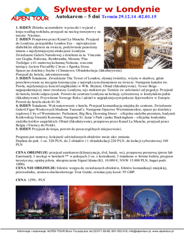Sylwester w Londynie Autokarem – 5 dni Termin 29.12.14 -02.01.15 1. DZIEŃ Zbiórka uczestników wycieczki i wyjazd z kraju według rozkładu, przejazd na nocleg tranzytowy na terenie Niemiec. 2. DZIEŃ Przeprawa przez Kanał La Manche. Przyjazd do Londynu, przejażdżka London Eye – największym diabelskim młynem na świecie, podziwianie panoramy miasta z najsłynniejszymi atrakcjami Londynu. Zwiedzanie Galerii Narodowej z dziełami m.in. Vincenta van Gogha, Rubensa, Rembrandta, Moneta. Plac Trafalgar z 61-metrową kolumną Nelsona, wiecznie tętniący życiem Piccadilly Circus z figurką Erosa. Spacer po dzielnicy Socho i Chinatown. Obiadokolacja (fakultatywnie). Przejazd do hotelu, zakwaterowanie. 3. DZIEŃ Śniadanie. Zwiedzanie The Tower of London, słynnej twierdzy, wizyta w skarbcu, gdzie przechowywane są insygnia koronacyjne z największym diamentem na świecie. Następnie katedra św. Pawła, najsłynniejszy kościół anglikański w Wlk. Brytani. Obiad (fakultatywnie). Tower Brige – najpopularniejszy most zwodzony Londynu, rejs statkiem po Tamizie (w zależności od pogody). Przejazd do hotelu, krótki odpoczynek. Powrót do centrum Londynu na kolację sylwestrową w londyńskim pubie (fakultatywnie). Przywitanie Nowego Roku i udział w najpiękniejszym pokazie fajerwerków w Europie. Powrót do hotelu około 01:30. 4. DZIEŃ Śniadanie. Wykwaterowanie z hotelu. Przejazd komunikacją miejską do centrum. Zwiedzanie Galerii Figur Woskowych Madame Tussaud’s. Następnie Opactwo Westminsterskie, spacer po dzielnicy rządowej City of Westminster: Parlament, Big Ben, Downing Street – oficjalna siedziba premiera, budynek Królewskiej Gwardii Koronnej. Następnie St. Jame’s Park i pałac Buckingham – oficjalna londyńska siedziba królów angielskich. Obiad (fakultatywnie), przeprawa przez Kanał La Manche, przejazd przez Belgię i Niemcy do Polski. 5. DZIEŃ Przyjazd do kraju, powrót do poszczególnych miejscowości. Program jest ramowy, kolejność odwiedzanych obiektów może ulec zmianie. Dopłata do pok. 1-os. 320 PLN, do 2 obiadów i 1 obiadokolacji 220 PLN, do kolacji sylwestrowej 160 PLN CENA OBEJMUJE: przejazd autokarem (klimatyzacja, dvd, barek, wc), przeprawę promową (prom lub Eurotunel), 3 noclegi w hotelach ** w pokojach 2-os. z łazienkami, 3 śniadania w formie bufetu, program turystyczny, opiekę pilota, ubezpieczenie Signal Iduna (KL 10.000 €, NNW 15.000 PLN, bagaż podr. 1000). CENA NIE OBEJMUJE: biletów wstępu do zwiedzanych obiektów, biletów komunikacji miejskiej, przewodnika, zestawu słuchawkowego Tour Guide, orientacyjny koszt: 95 GBP. CENA 1299,- PLN Informacje i rezerwacje: ALPEN TOUR Biuro Turystyczne, tel.22/371-59-60, 691-032-018, [email protected], www.alpentour.pl