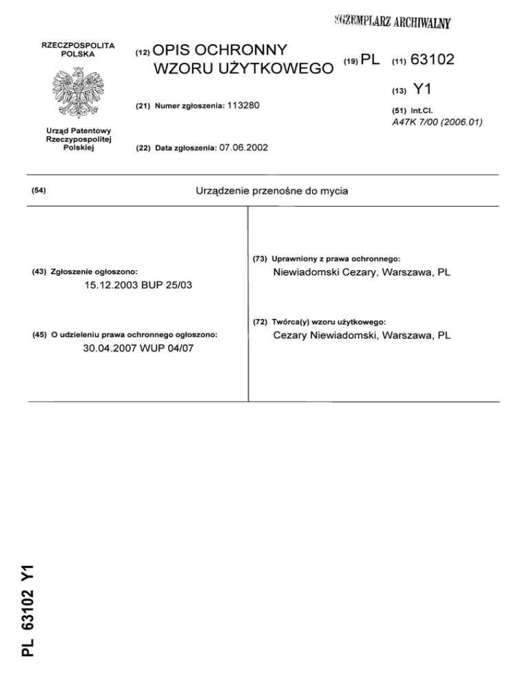 mimwwmtm RZECZPOSPOLITA POLSKA d2)OPIS OCHRONNY (19) PL (11)63102 WZORU UŻYTKOWEGO (13) (21) Numer zgłoszenia: 113280 Y1 (51) Int.CI. A47K 7/00 (2006.01) Urząd Patentowy Rzeczypospolitej Polskiej (22) Data zgłoszenia: 07.06.2002 Urządzenie przenośne do mycia (54) (73) Uprawniony z prawa ochronnego: (43) Zgłoszenie ogłoszono: Niewiadomski Cezary, Warszawa, PL 15.12.2003 BUP 25/03 (72) Twórca(y) wzoru użytkowego: (45) O udzieleniu prawa ochronnego ogłoszono: 30.04.2007 WUP 04/07 >CM CO (O Cezary Niewiadomski, Warszawa, PL 1 13280 Urządzenie przenośne do mycia Przedmiotem wzoru użytkowego jest urządzenie przenośne do mycia, zwłaszcza do użytkowania w podróży. Znane jest urządzenie przenośne do mycia w postaci bańki z zamykanym otworem wlewowym i otworem wylotowym zaopatrzonym w zawór. Bańka zaopatrzona jest także w uchwyt do jej noszenia. Środki czystości jak mydło ręczniki znajdują się w innym miejscu. Znane bańki do mycia mają słabo regulowany strumień wody, podczas regulowania zaworem wypływa dużo cennej wody i charakteryzują się niewygodnym usytuowaniem środków czystości. Istota rozwiązania według wzoru użytkowego polega na tym, że zawór na jednym końcu na ściance ma otwór i ten jeden koniec osadzony jest w obejmie, której jedna ścianka połączona jest ze ścianką bańki w miejscu gdzie obie łączone ścianki mają naprzeciwko siebie otwory. Boczne ścianki zaopatrzone są we wnękę na zawór, we wnękę na pojemnik z mydłem i we wnękę na ręcznik. Zawór ma postać rurki zgiętej na obu końcach. Wnęka na zawór i wnęka na pojemnik z mydłem usytuowane sana jednej ściance obok siebie, a wnęka na ręcznik jest na ściance sąsiedniej. Brzegi ścianki banki przy wnęce na pojemnik z mydłem są wygięte w kierunku pomniejszenia otworu tej wnęki. Wnęka na ręcznik ma wymiary standardowych ręczników papierowych, a jej 2 ścianki przeciwległe naprzeciwko siebie mają zaczepy w kształcie wypustów. Rozwiązanie według wzoru użytkowego umożliwia łatwą i szybką regulację strumienia wody i wygodny dostęp do mydła i ręcznika. Wszystkie elementy, zwłaszcza dołączone środki czystości, mieszczą się w obrębie bańki i są stabilne. Przedmiot wzoru użytkowego jest przedstawiony na rysunku, na którym fig.l przedstawia urządzenie przenośne do mycia w częściowym widoku częściowym przekroju, fig.2 przedstawia to urządzenie w przekroju A-A, fig.3 przedstawia urządzenie w widoku K, a fig.4 - to urządzenie w przekroju B - B. Urządzenie ma postać bańki 3, która ma na ściance wierzchniej w środku uchwyt 8, a obok otwór wlewowy 9 z gwintowaną pokrywką. Na ściance bocznej T_ jest wnęka na zawór 4, która ma na ściance centralnej otwór 2^, wylotowy bańki, o brzegach połączonych z cylindryczną obejmą 2\ Jeden koniec Lb zaworu i, który ma postać rurki zgiętej na obu końcach LąJ_b, osadzony jest w obejmie 2 i może być swobodnie obracany w obejmie 2 przez pociągnięcie ręki. Na ściance jednego końca Ib zaworu i jest otwór lc_w takiej odległości od swego końca, że zachodzi na otwór 2\ wylotowy bańki 3. Na ściance bocznej T_ bańki 3 obok wnęki na zawór 4 jest wnęka na pojemnik z mydłem 5. Ma ona wymiary dostosowane do standardowych butelek z mydłem płynnym, brzegi ścianki banki 3 przy wnęce na pojemnik z mydłem 5 są wygięte w kierunku pomniejszenia otworu tej wnęki. Na sąsiedniej ściance bocznej 3^ jest wnęka na ręcznik 6, która ma wymiary standardowych ręczników papierowych, a jej ścianki 3 przeciwległe naprzeciwko siebie mają zaczepy 6a w kształcie wypustów, na których osadzone są rolki 7 ręczników papierowych 7a. Przez obrót zaworu l w obejmie 2 otwór j_a? wylotowy zaworu, jest pochylany ku dołowi i w pewnym położeniu ? kiedy zostanie częściowo odsłonięty otwór T_ bańki zaczyna wypływać woda z bańki 3. Strumień wody się zwiększa do momentu odsłonięcia całego otworu 27 i następnie przy dalszym obrocie zaworu strumień jest zmniejszany aż do zaniku. Usytuowane we wnęce na pojemnik z mydłem 5 i we wnęce na ręcznik 6 środki czystości mieszczą się w obrębie bańki i są stabilne. RZECZNIK PATENTOWY mgr tnL Krystyna Lewińska 1 13280 Zastrzeżenia ochronne 1.Urządzenie przenośne do mycia w postaci bańki z zamykanym otworem wlewowym i otworem wylotowym zaopatrzonym w zawór oraz zaopatrzonej w uchwyt do jej noszenia znamienny tym, że zawór (J_) na jednym końcu (J_b) na ściance ma otwór Qc) i ten jeden koniec (Ib) osadzony jest w obejmie (2), której jedna ścianka połączona jest ze ścianką bańki (3) w miejscu gdzie obie łączone ścianki mają naprzeciwko siebie otwory (lc, 2') zaś boczne ścianki zaopatrzone są we wnękę na zawór (4), we wnękę na pojemnik z mydłem (5) i we wnękę na ręcznik (6). 2.Urządzenie według zastrz.l znamienne tym, że zawór (J_) ma postać rurki zgiętej na obu końcach (la,Ib). 3. Urządzenie według zastrz.l znamienne tym, że wnęka na zawór (4) i wnęka na pojemnik z mydłem (5) usytuowane są na jednej ściance (3^) obok siebie, a wnęka na ręcznik (6) jest na ściance sąsiedniej (3^), zaś brzegi ścianki banki (3) przy wnęce na pojemnik z mydłem (5) są wygięte w kierunku pomniejszenia otworu tej wnęki. 4. Urządzenie według zastrz.l albo 2, albo 3 znamienne tym, że wnęka na ręcznik (6) ma wymiary standardowych ręczników papierowych, a jej ścianki przeciwległe naprzeciwko siebie mają zaczepy (6a) w kształcie wypustów. RZECZNIK PATENTOWY mgr inz. Krystyno Lewińsko RZECZNIK P*TENTOWI ^ 20 0 K 3- B-B ZECZNlf- .».<•. fc^TOW^ #f .jfcS Ąf*i?(Vf>' ' '-wińsko