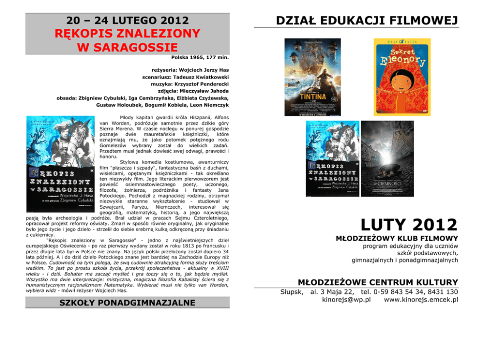 20 – 24 LUTEGO 2012 RĘKOPIS ZNALEZIONY W SARAGOSSIE DZIAŁ EDUKACJI FILMOWEJ Polska 1965, 177 min. reżyseria: Wojciech Jerzy Has scenariusz: Tadeusz Kwiatkowski muzyka: Krzysztof Penderecki zdjęcia: Mieczysław Jahoda obsada: Zbigniew Cybulski, Iga Cembrzyńska, Elżbieta Czyżewska, Gustaw Holoubek, Bogumił Kobiela, Leon Niemczyk Młody kapitan gwardii króla Hiszpanii, Alfons van Worden, podróżuje samotnie przez dzikie góry Sierra Morena. W czasie noclegu w ponurej gospodzie poznaje dwie mauretańskie księżniczki, które oznajmiają mu, że jako potomek potężnego rodu Gomelezów wybrany został do wielkich zadań. Przedtem musi jednak dowieść swej odwagi, prawości i honoru. Stylowa komedia kostiumowa, awanturniczy film "płaszcza i szpady", fantastyczna baśń z duchami, wisielcami, opętanymi księżniczkami - tak określano ten niezwykły film. Jego literackim pierwowzorem jest powieść osiemnastowiecznego poety, uczonego, filozofa, żołnierza, podróżnika i fantasty Jana Potockiego. Pochodził z magnackiej rodziny, otrzymał niezwykle staranne wykształcenie - studiował w Szwajcarii, Paryżu, Niemczech, interesował się geografią, matematyką, historią, a jego największą pasją była archeologia i podróże. Brał udział w pracach Sejmu Czteroletniego, opracował projekt reformy oświaty. Zmarł w sposób równie oryginalny, jak oryginalne było jego życie i jego dzieło - strzelił do siebie srebrną kulką odkręconą przy śniadaniu z cukiernicy. "Rękopis znaleziony w Saragossie" - jedno z najświetniejszych dzieł europejskiego Oświecenia - po raz pierwszy wydany został w roku 1813 po francusku i przez długie lata był w Polsce nie znany. Na język polski przełożony został dopiero 34 lata później. A i do dziś dzieło Potockiego znane jest bardziej na Zachodzie Europy niż w Polsce. Cudowność na tym polega, że swą cudownie atrakcyjną formą służy treściom ważkim. To jest po prostu szkoła życia, przekrój społeczeństwa - aktualny w XVIII wieku - i dziś. Bohater ma zacząć myśleć i gra toczy się o to, jak będzie myślał. Wszystko ma dwie interpretacje: mistyczna, magiczna filozofia Kabalisty ściera się z humanistycznym racjonalizmem Matematyka. Wybierać musi nie tylko van Worden, wybiera widz - mówił reżyser Wojciech Has. SZKOŁY PONADGIMNAZJALNE LUTY 2012 MŁODZIEŻOWY KLUB FILMOWY program edukacyjny dla uczniów szkół podstawowych, gimnazjalnych i ponadgimnazjalnych MŁODZIEŻOWE CENTRUM KULTURY Słupsk, al. 3 Maja 22, tel. 0-59 843 54 34, 8431 130 [email protected] www.kinorejs.emcek.pl 8 – 19 LUTEGO 2012 PRZYGODY TINTINA 20 LUTEGO – 4 MARCA 3D The Adventures of Tintin Nowa Zelandia, USA 2011, 107 min. reżyseria: Steven Spielberg scenariusz: Joe Cornish, Edgar Wright muzyka: John Williams zdjęcia: Janusz Kamiński Film zrealizowany na podstawie klasycznego komiksu belgijskiego pisarza-artysty Hergé, wydrukowanego w ponad 200 milionów egzemplarzy, tłumaczonego na 50 języków. Nic nie jest w stanie powstrzymać śmiałego reportera śledczego TINTINA, młodego bohatera ponadczasowego komiksu, przed rozwiązaniem tajemnic świata. W pierwszym z trzech planowanych filmów ten nieustraszony reporter, jego niesforny, ale oddany pies Snowy oraz skłonny do bijatyk kapitan Haddock wyruszają, aby odnaleźć od dawna zaginiony statek, który kryje tajemnicę starożytnego skarbu... i klucz do odwiecznej klątwy. "Tintin" ma wszystko, co potrzeba kinu „nowej przygody”: tajemnicę, zgrabnie wplecione w intrygę energetyczne sceny akcji, humor, lekkość i wdzięk. W samej tylko scenie pościgu na motorach po zatłoczonym arabskim mieście Spielbergowi i scenarzystom udało się napakować tyle pomysłów i gagów, że można by nimi obdzielić pół tuzina produkcji przygodowych. A to tylko ułamek atrakcji czekających na widza. "Przygody Tintina" to krok w przód – ba, skok w dal! – w dziedzinie komputerowej animacji. Wszystkie elementy scenografii zostały dopieszczone przez procesory i karty graficzne do tego stopnia, że ciężko je odróżnić od rzeczywistości. Każdy kadr dosłownie głaszcze oko. U Spielberga nawet brud wydaje się estetyczny. "Tintin" to nie tylko bardzo dobra rozrywka, ale i zbiór mądrych porad przeznaczonych dla młodego człowieka (warto odwiedzać bibliotekę, pijaństwo nie popłaca itd.). Na "Tintinie" nie uświadczycie romansów i lukru. Będzie za to przygoda i szorstka męska przyjaźń. SZKOŁY PODSTAWOWE (KLASY 4-6) I GIMNAZJALNE SEKRET ELEONORY Kerity, la maison des contes Francja, Włochy 2009, 76 min. reżyseria: Dominique Monfery scenariusz: Anik Leray, Alexandre Reverend muzyka: Christophe Heral „Sekret Eleonory” to animowana podróż do świata, w którym czytanie jest umiejętnością na wagę złota. Okazuje się bowiem, że tylko dzięki niej ożywają postaci znane każdemu młodemu czytelnikowi. Rodzina małego Nathaniela dostaje w spadku po cioci Eleonorze dom wraz z bogatą biblioteką. Problemy finansowe rodziców chłopca sprawiają, że bezcenne książki, a w tym pierwsze wydania bajek Perraulta i baśni braci Grimm, mają zostać sprzedane. W chwili kiedy Nathaniel odkrywa, że biblioteka cioci Eleonory ma niezwykłą moc, zaczyna szukać sposobu, by ocalić książki oraz ich bohaterów dla kolejnych pokoleń. Pomagają mu w tym m.in. Alicja z Krainy Czarów, Piotruś Pan oraz Pinokio. Czy uda mu się przejąć rolę Wielkiego Czytelnika po cioci Eleonorze i pomóc ulubionym postaciom? Doskonała animacja oraz niezwykła tematyka sprawiają, że film przeznaczony jest nie tylko dla dzieci. Poruszany w nim problem czytania książek oraz klasycznego zwycięstwa dobra nad złem połączony z najznakomitszymi bajkowymi postaciami powodują, że "Sekret Eleonory" to wyjątkowa zabawa, a jednocześnie nauka dla najmłodszych. SZKOŁY PODSTAWOWE LUTY – MARZEC 2012 LUTY – MARZEC 2012 W CIEMNOŚCI W CIEMNOŚCI Kanada, Niemcy, Polska 2011, 145 min. K