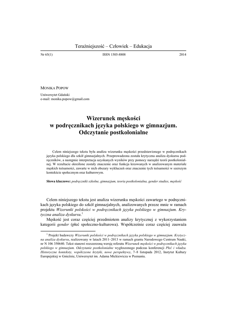 Teraźniejszość – Człowiek – Edukacja Nr 65(1) ISSN 1505-8808 2014 MONIKA POPOW Uniwersytet Gdański e-mail: [email protected] Wizerunek męskości w podręcznikach języka polskiego w gimnazjum. Odczytanie postkolonialne Celem niniejszego tekstu była analiza wizerunku męskości przedstawionego w podręcznikach języka polskiego dla szkół gimnazjalnych. Przeprowadzona została krytyczna analiza dyskursu podręczników, a następnie interpretacja uzyskanych wyników przy pomocy narzędzi teorii postkolonialnej. W rezultacie określone zostały znaczenie oraz funkcja kreowanych w analizowanym materiale męskich tożsamości, zawarte w nich obszary wykluczeń oraz znaczenie tych tożsamości w szerszym kontekście społecznym oraz kulturowym. Słowa kluczowe: podręczniki szkolne, gimnazjum, teoria postkolonialna, gender studies, męskość Celem niniejszego tekstu jest analiza wizerunku męskości zawartego w podręcznikach języka polskiego do szkół gimnazjalnych, analizowanych przeze mnie w ramach projektu Wizerunki polskości w podręcznikach języka polskiego w gimnazjum. Krytyczna analiza dyskursu.1 Męskość jest coraz częściej przedmiotem analizy krytycznej z wykorzystaniem kategorii gender (płeć społeczno-kulturowa). Współcześnie coraz częściej zauważa 1 Projekt badawczy Wizerunki polskości w podręcznikach języka polskiego w gimnazjum. Krytyczna analiza dyskursu, realizowany w latach 2011–2013 w ramach grantu Narodowego Centrum Nauki, nr N 106 350640. Tekst stanowi rozszerzoną wersję referatu Wizerunek męskości w podręcznikach języka polskiego w gimnazjum. Odczytanie postkolonialne wygłoszonego podczas konferencji Płeć i władza. Historyczne konteksty, współczesne krytyki, nowe perspektywy, 7–8 listopada 2012, Instytut Kultury Europejskiej w Gnieźnie, Uniwersytet im. Adama Mickiewicza w Poznaniu. 74 Monika POPOW się, że męskość, podobnie jak kobiecość, to zmienny historycznie i społecznie konstrukt. Z. Melosik zauważa, że w przeszłości pozycja społeczna mężczyzny była niemożliwa do podważenia już choćby przez fakt, iż podejmował on w życiu działania «poważne» i «decydujące»; wchodził w rolę polityka, przedsiębiorcy czy właściciela ziemskiego, względnie pracownika-wytwórcę, dostarczającego rodzinie środków do życia. Role te dawały mu niezaprzeczalną przewagę nad kobietą, która prowadziła dom (pranie, prasowanie, sprzątanie, obiady), stroiła się (dla niego) i dokonywała zakupów (jeśli mężczyzna kupował, to dom lub posiadłość bądź nowego Mercedesa). Dziś sytuacja radykalnie się zmieniła (Melosik 2010, s. 141). Analizy wizerunków mężczyzn w kulturze pokazują, że powszechnie dostępne wzorce męskości oparte na modelu patriarchalnym, mogą być nie tylko nośnikami władzy, ale również zawierać szereg restrykcyjnych i dyscyplinujących norm adresowanych do mężczyzn. Ich dekonstrukcja jest jednym z obszarów zainteresowań krytyki feministycznej (Fuszara 2008; Dąbrowska, Radomski 2010). Dekonstruowanie dominujących wizerunków męskości leży również w obszarze zainteresowania teorii postkolonialnej. Postkolonializm jako interdyscyplinarna krytyka społeczna koncentruje się na relacjach władzy, wszelkiego rodzaju formach kolonizacji i ich konsekwencjach. Pierwotnie wychodzący z antykolonialnej krytyki dominacji w obrębie stosunków rasowych, współczesny postkolonializm zwraca uwagę na stosunki władzy wynikające z oddziaływania w obrębie społeczeństw takich przesłanek jak rasa, płeć, klasa społeczna i inne. Teoria postkolonialna jest współcześnie jedną z najbardziej prężnie rozwijających się perspektyw, pokazujących złożone relacje władzy we współczesnych społeczeństwach kapitalistycznych. Męskość w perspektywie postkolonialnej W teorii postkolonialnej obszerne miejsce zajmują relacje władzy między płciami. Według postkolonialnych krytyków patriarchalizm jest jednym z fundamentów imperializmu. Z tego też powodu tak silną pozycję w obrębie krytyk postkolonialnych zajęła teoria feministyczna. Temat ten poruszała między innymi G. Spivak w klasycznym już tekście Can subaltern speak? (Czy podporządkowani inni mogą przemówić?), w którym autorka opisywała sytuację wielokrotnego wykluczenia Hindusek, poddawanych opresji z powodu swojej płci, koloru skóry i pozycji społecznej w skolonizowanych Indiach (Spivak 1988). Postkolonialni krytycy zwracali również uwagę, że poprzez feminizację podbitych terenów artykułowała się męskość imperium, czego najbardziej wymowny przykład znaleźć można w dyskursie orientalistycznym, na przykład w mających seksualny podtekst wyrażeniach mówiących o zdobywaniu dziewiczych krain (Ghandi 2008, s. 92). Wizerunek męskości w podręcznikach języka polskiego w gimnazjum... 75 Męskość, jako kategoria kojarząca się z dominacją, ma w teorii postkolonialnej szczególne znaczenie. Już w początkach funkcjonowania krytyki postkolonialnej zwrócono uwagę, że kulturowy kolonializm ma charakter płciowy. W napisanej w roku 1952 książce Black skin, white mask F. Fanon poruszył temat ekonomii seksualnej leżącej u podłoża kolonializmu w Algierii. Doszedł wówczas do wniosku, że skolonizowany czarny mężczyzna jest prawdziwym Innym dla kolonizującego białego mężczyzny. F. Fanon pokazał, w jaki sposób aspekt rywalizacji seksualnej towarzyszy sytuacji postkolonialnej (Ghandi 2008, s. 93). Podbicie kraju, prezentowane w dyskursie kolonialnym jako naturalna cywilizacyjna przewaga ludzi białych, ma w sobie podtekst dominacji płci. Jak ujmuje to L. Ghandi: dyskurs kolonialny obstając przy rasowej zniewieściałości (...) wyraża związek kolonialny w kategoriach „naturalnej” przewagi mężczyzn nad kobietami (tamże). Kobiecość staje się tutaj narzędziem podporządkowania, rodzajem piętna, które przydawane jest skolonizowanym mężczyznom w celu 