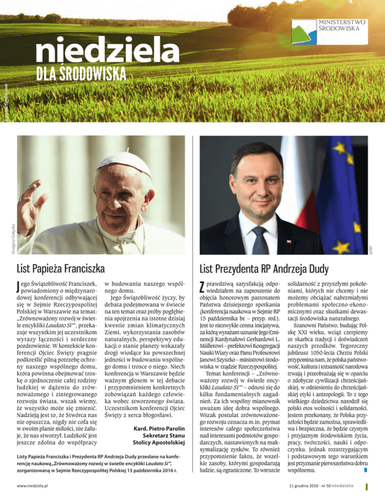 niedziela KPRP Grzegorz Gałązka barytek/fotolia.com dla środowiska List Papieża Franciszka List Prezydenta RP Andrzeja Dudy J Z ego Świątobliwość Franciszek, powiadomiony o międzynarodowej konferencji odbywającej się w Sejmie Rzeczypospolitej Polskiej w Warszawie na temat: „Zrównoważony rozwój w świetle encykliki Laudato Si’”, przekazuje wszystkim jej uczestnikom wyrazy łączności i serdeczne pozdrowienie. W kontekście konferencji Ojciec Święty pragnie podkreślić pilną potrzebę ochrony naszego wspólnego domu, która powinna obejmować troskę o zjednoczenie całej rodziny ludzkiej w dążeniu do zrównoważonego i zintegrowanego rozwoju świata, wszak wiemy, że wszystko może się zmienić. Nadzieją jest to, że Stwórca nas nie opuszcza, nigdy nie cofa się w swoim planie miłości, nie żałuje, że nas stworzył. Ludzkość jest jeszcze zdolna do współpracy w budowaniu naszego wspólnego domu. Jego Świątobliwość życzy, by debata podejmowana w świecie na ten temat oraz próby pogłębienia spojrzenia na istotne dzisiaj kwestie zmian klimatycznych Ziemi, wykorzystania zasobów naturalnych, perspektywy edukacji o stanie planety wskazały drogi wiodące ku powszechnej jedności w budowaniu wspólnego domu i trosce o niego. Niech konferencja w Warszawie będzie ważnym głosem w tej debacie i przypomnieniem konkretnych zobowiązań każdego człowieka wobec stworzonego świata. Uczestnikom konferencji Ojciec Święty z serca błogosławi. Kard. Pietro Parolin Sekretarz Stanu Stolicy Apostolskiej Listy Papieża Franciszka i Prezydenta RP Andrzeja Dudy przesłane na konferencję naukową „Zrównoważony rozwój w świetle encykliki Laudato Si’”, zorganizowaną w Sejmie Rzeczypospolitej Polskiej 15 października 2016 r. www.niedziela.pl prawdziwą satysfakcją odpowiedziałem na zaproszenie do objęcia honorowym patronatem Państwa dzisiejszego spotkania (konferencja naukowa w Sejmie RP 15 października br. – przyp. red.). Jest to niezwykle cenna inicjatywa, za którą wyrażam uznanie Jego Eminencji Kardynałowi Gerhardowi L. Müllerowi – prefektowi Kongregacji Nauki Wiary oraz Panu Profesorowi Janowi Szyszko – ministrowi środowiska w rządzie Rzeczypospolitej. Temat konferencji – „Zrównoważony rozwój w świetle encykliki Laudato Si’” – odnosi się do kilku fundamentalnych zagadnień. Za ich wspólny mianownik uważam ideę dobra wspólnego. Wszak postulat zrównoważonego rozwoju oznacza m.in. prymat interesów całego społeczeństwa nad interesami podmiotów gospodarczych, nastawionych na maksymalizację zysków. To również przypomnienie faktu, że wszelkie zasoby, którymi gospodarują ludzie, są ograniczone. To wreszcie solidarność z przyszłymi pokoleniami, których nie chcemy i nie możemy obciążać nabrzmiałymi problemami społeczno-ekonomicznymi oraz skutkami dewastacji środowiska naturalnego. Szanowni Państwo, budując Polskę XXI wieku, wciąż czerpiemy ze skarbca tradycji i doświadczeń naszych przodków. Tegoroczny jubileusz 1050-lecia Chrztu Polski przypomina nam, że polska państwowość, kultura i tożsamość narodowa trwają i przeobrażają się w oparciu o zdobycze cywilizacji chrześcijańskiej, w odniesieniu do chrześcijańskiej etyki i antropologii. To z tego wielkiego dziedzictwa narodził się polski etos wolności i solidarności. Jestem przekonany, że Polska przyszłości będzie zamożna, sprawiedliwa i bezpieczna, że będzie czystym i przyjaznym środowiskiem życia, pracy, twórczości, nauki i odpoczynku. Jednak rozstrzygającym i podstawowym tego warunkiem jest przyznanie pierwszeństwa dobru wspólnemu. I 11 grudnia 2016 . nr 50 niedziela I „Niedziela” dla środowiska Pierwsza taka konferencja na świecie Pełna sala plenarna Sejmu, setki zaproszonych gości i naukowcy z różnych stron świata – tak wyglądała konferencja naukowa pt. „Zrównoważony rozwój w świetle encykliki Laudato Si’”. Polska jest pierwszym krajem, który zajął się tematem ekologii na tak wysokim szczeblu Artur Stelmasiak Dar Papieża dla świata Uczestnicy konferencji podjęli temat najważniejszych problemów współczesnego świata, II niedziela nr 50 . 11 grudnia 2016 Artur Stelmasiak Z organizowanie konferencji naukowej w Sejmie Rzeczypospolitej Polskiej było wspólnym przedsięwzięciem ministra środowiska prof. Jana Szyszko oraz prefekta Kongregacji Nauki Wiary kard. Gerharda Ludwiga Müllera. Rozwój gospodarczy, który jednocześnie będzie szanował dziedzictwo narodowe, którym jest nasze środowisko naturalne, to wspólny cel inżynierów zajmujących się ekologią i teologów. – Bardzo się cieszę, że mogłem być współorganizatorem tej wielkiej konferencji w Sejmie Rzeczypospolitej – powiedział kard. Müller. Wśród prelegentów byli profesorowie m.in. z USA, Rosji, Niemiec i Włoch. Wielu z nich nie kryło swojego zdumienia, że Polska na tak wysokim państwowym poziomie podjęła dyskusję o ekologii. – Jesteście pierwszym państwem, które na poważnie zajęło się tym problemem w parlamencie – podkreślił prof. Antonino Zichichi, prezydent Światowej Federacji Naukowców. – To historyczna konferencja i cieszę się, że w kraju św. Jana Pawła II Sejm zajął się tematem, który inne parlamenty ignorują. Powinni was, Polaków, słuchać i naśladować, bo robicie coś, o czym mówi nauka. Okazją do debaty w parlamencie, który jest sercem polskiej demokracji, była 1050. rocznica Chrztu Polski. Przyjęcie chrześcijaństwa przez Mieszka I z jednej strony oznacza początek naszego państwa, ale z drugiej – także rozpoczęcie procesu eksploatacji środowiska naturalnego przez państwo polskie. – Po tych 1050 latach nie mamy się czego wstydzić. Zachowaliśmy bogactwo naturalne na dużo wyższym poziomie niż większość krajów. Pod względem bioróżnorodności jesteśmy europejską potęgą – powiedział „Niedzieli” minister Jan Szy