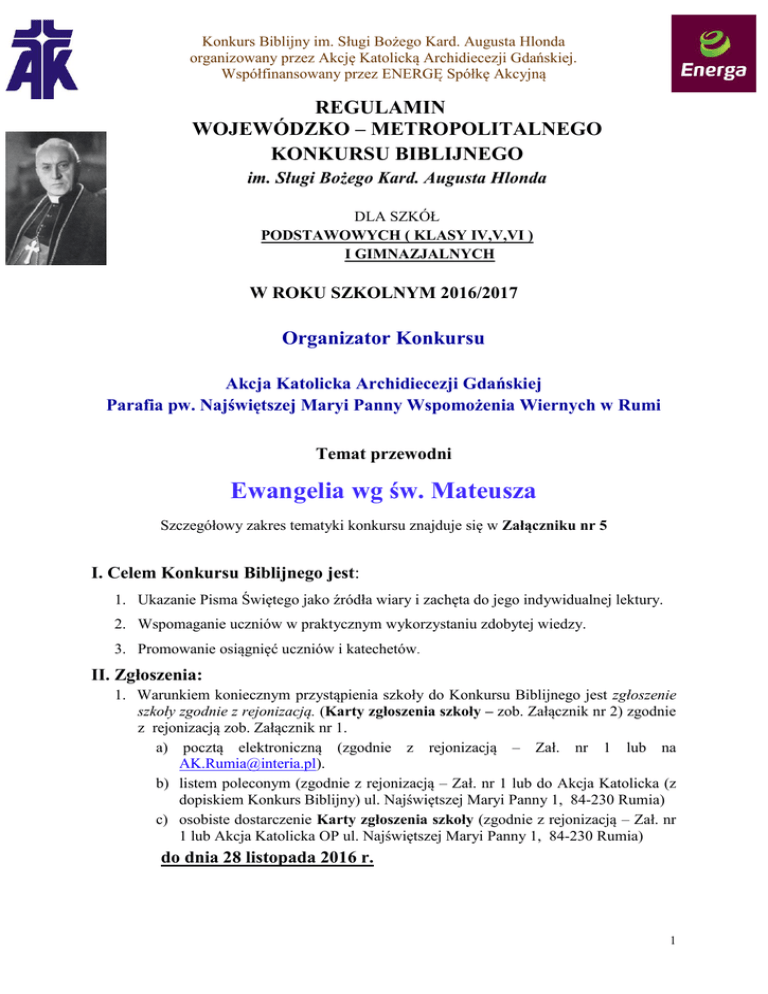 Konkurs Biblijny im. Sługi Bożego Kard. Augusta Hlonda organizowany przez Akcję Katolicką Archidiecezji Gdańskiej. Współfinansowany przez ENERGĘ Spółkę Akcyjną REGULAMIN WOJEWÓDZKO – METROPOLITALNEGO KONKURSU BIBLIJNEGO im. Sługi Bożego Kard. Augusta Hlonda DLA SZKÓŁ PODSTAWOWYCH ( KLASY IV,V,VI ) I GIMNAZJALNYCH W ROKU SZKOLNYM 2016/2017 Organizator Konkursu Akcja Katolicka Archidiecezji Gdańskiej Parafia pw. Najświętszej Maryi Panny Wspomożenia Wiernych w Rumi Temat przewodni Ewangelia wg św. Mateusza Szczegółowy zakres tematyki konkursu znajduje się w Załączniku nr 5 I. Celem Konkursu Biblijnego jest: 1. Ukazanie Pisma Świętego jako źródła wiary i zachęta do jego indywidualnej lektury. 2. Wspomaganie uczniów w praktycznym wykorzystaniu zdobytej wiedzy. 3. Promowanie osiągnięć uczniów i katechetów. II. Zgłoszenia: 1. Warunkiem koniecznym przystąpienia szkoły do Konkursu Biblijnego jest zgłoszenie szkoły zgodnie z rejonizacją. (Karty zgłoszenia szkoły – zob. Załącznik nr 2) zgodnie z rejonizacją zob. Załącznik nr 1. a) pocztą elektroniczną (zgodnie z rejonizacją – Zał. nr 1 lub na [email protected]). b) listem poleconym (zgodnie z rejonizacją – Zał. nr 1 lub do Akcja Katolicka (z dopiskiem Konkurs Biblijny) ul. Najświętszej Maryi Panny 1, 84-230 Rumia) c) osobiste dostarczenie Karty zgłoszenia szkoły (zgodnie z rejonizacją – Zał. nr 1 lub Akcja Katolicka OP ul. Najświętszej Maryi Panny 1, 84-230 Rumia) do dnia 28 listopada 2016 r. 1 Konkurs Biblijny im. Sługi Bożego Kard. Augusta Hlonda organizowany przez Akcję Katolicką Archidiecezji Gdańskiej. Współfinansowany przez ENERGĘ Spółkę Akcyjną Uwaga! Szkoły znajdujące się na terenach diecezji poza województwem pomorskim zgłaszają udział w konkursie w swojej diecezji wg regulaminu tam przygotowanego. Przebieg eliminacji: Stopień Eliminacje Etap wstępny Najpóźniej do 21 grudnia 2016 r. (środa) I – szkolny 12 stycznia 2017 r. (czwartek), godz. 13.00 II – rejonowy 10 marca 2017 r. (piątek), godz. 13.30 III-wojewódzko-metropolitalny 13 maja 2017 r. (sobota), godz. 10.00 - RUMIA III. Konkurs Biblijny przebiega czterostopniowo: (etap wstępny, stopień I, II, III) Etap wstępny Katecheci przygotowują pytania i przeprowadzają w formie pisemnej etap klasowy, z którego wyłaniają uczestników etapu szkolnego. Stopień I - szkolny Eliminacje przeprowadza na terenie szkoły Szkolna Komisja Konkursowa (SKK) powołana przez dyrektora szkoły. Przewodniczący SKK odpowiada za stronę merytoryczną zgodną z wymaganiami regulaminowymi. 2. Przygotowane przez Wojewódzką Komisję Konkursową (WKK) arkusze zadań uczniowie rozwiązują w czasie 45 minut. 3. Z odbytych eliminacji I stopnia SKK sporządza protokół zob. Załącznik nr 3 potwierdzony przez dyrektora szkoły – uwzględniający wszystkich uczestników. Przesyła go wraz z pracami konkursowymi uczniów, którzy zakwalifikowali się do II stopnia (rejonowego) na adres odpowiedniej Rejonowej Komisji Konkursowej – zob. Załącznik nr 1, w terminie do 11 lutego 2017 roku. 4. Spośród uczestników I stopnia (szkolnego) Konkursu Biblijnego SKK typuje najlepszych uczniów do II stopnia (rejonowego). 1. 2 Konkurs Biblijny im. Sługi Bożego Kard. Augusta Hlonda organizowany przez Akcję Katolicką Archidiecezji Gdańskiej. Współfinansowany przez ENERGĘ Spółkę Akcyjną Kryterium 1. Do następnego etapu kwalifikują się uczniowie w ilości wyznaczonej w poniższej tabeli. do 100 uczniów Liczba uczniów awansujących do II stopnia 1 do 300 uczniów 2 od 301 uczniów do 400 uczniów 3 od 401 uczniów do 600 uczniów 4 powyżej 600 uczniów 5 Liczba uczniów w szkole 2. Szkoły, które przeprowadziły etap wstępny we wszystkich klasach, mogą wprowadzić do etapu rejonowego jednego ucznia więcej, niż to wynika z tabeli. 3. Jeżeli zdarzy się, że jeden uczeń lub kilku uczniów otrzymało tę samą liczbę punktów jak ostatni z awansujących, to również ci uczniowie uzyskują awans do następnego etapu. 4. Dodatkowo do etapu rejonowego kwalifikują się również uczniowie, którzy otrzymali minimum 80% punktów (nawet jeśli ich liczba przekracza limit przedstawiony w powyższej tabeli). Stopień II – rejonowy 1. Eliminacje przeprowadza Rejonowa Komisja Konkursowa (RKK) powołana przez przewodniczącego RKK. 2. Uczestnicy rejonowych eliminacji rozwiązują arkusz zadań przygotowany przez przewodniczącego WKK w czasie 60 minut. 3. Z odbytych eliminacji II stopnia RKK sporządza protokół zob. Załącznik nr 4 uwzględniający 15 uczestników o najwyższej punktacji i przesyła go najpóźniej do 18 marca 2017 roku w wersji elektronicznej i drukowanej przesyłką poleconą wraz ze sprawdzonymi pracami uczestników lub dostarcza je osobiście na adres Wojewódzkiej Komisji Konkursowej: Akcja Katolicka Konkurs Biblijny im. Sługi Bożego kard. Augusta Hlonda ul. Najśw. Maryi Panny1, 84-230 Rumia Fax (58) 771-31-13 E-mail: [email protected] Tel. 696-333-089 ; 601-638-283 3 Konkurs Biblijny im. Sługi Bożego Kard. Augusta Hlonda organizowany przez Akcję Katolicką Archidiecezji Gdańskiej. Współfinansowany przez ENERGĘ Spółkę Akcyjną 4. Do udziału w eliminacjach III stopnia konkursu WKK zaprasza 100 uczniów. Trzech najlepszych uczniów z każdego rejonu, oraz trzech najlepszych z każdej diecezji zgłoszonej do konkursu oraz kolejnych uczniów z najwyższą punktacją. 5. Jeżeli zdarzy się, że jeden uczeń lub kilku uczniów otrzymało tę samą liczbę punktów jaką otrzymała ostatnia - trzecia osoba awansująca, to również ci uczniowie uzyskują awans do następnego etapu. Stopień III – wojewódzko – metropolitalny 1. Eliminacje uczestników III stopnia przeprowadza Wojewódzka Komisja Konkursowa (WKK) powołana przez Przewodniczącego WKK. 2. Uczestnicy wojewódzkich eliminacji rozwiązują w czasie 60 minut zadania z arkusza przygotowane przez przewodnic