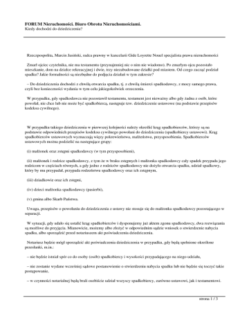 FORUM Nieruchomości. Biuro Obrotu Nieruchomościami. Kiedy dochodzi do dziedziczenia? Rzeczpospolita, Marcin Jasiński, radca prawny w kancelarii Gide Loyrette Nouel specjalista prawa nieruchomości Zmarł ojciec czytelnika, nie ma testamentu (przynajmniej nic o nim nie wiadomo). Po zmarłym ojcu pozostało mieszkanie, dom na działce rekreacyjnej i dwie, trzy niezabudowane działki pod miastem. Od czego zacząć podział spadku? Jakie formalności są niezbędne do podjęcia działań w tym zakresie? – Do dziedziczenia dochodzi z chwilą otwarcia spadku, tj. z chwilą śmierci spadkodawcy, z mocy samego prawa, czyli bez konieczności wydania w tym celu jakiegokolwiek orzeczenia. W przypadku, gdy spadkodawca nie pozostawił testamentu, testament jest nieważny albo gdy żadna z osób, które powołał, nie chce lub nie może być spadkobiercą, następuje tzw. dziedziczenie ustawowe (na podstawie przepisów kodeksu cywilnego). W przypadku takiego dziedziczenia w pierwszej kolejności należy określić krąg spadkobierców, którzy są na podstawie odpowiednich przepisów kodeksu cywilnego powołani do dziedziczenia (spadkobiercy ustawowi). Krąg spadkobierców ustawowych wyznaczają więzy pokrewieństwa, małżeństwa, przysposobienia. Spadkobierców ustawowych można podzielić na następujące grupy: (i) małżonek oraz zstępni spadkodawcy (w tym przysposobieni), (ii) małżonek i rodzice spadkodawcy, z tym że w braku zstępnych i małżonka spadkodawcy cały spadek przypada jego rodzicom w częściach równych, a gdy jedno z rodziców spadkodawcy nie dożyło otwarcia spadku, udział spadkowy, który by mu przypadał, przypada rodzeństwu spadkodawcy oraz ich zstępnym, (iii) dziadkowie oraz ich zstępni, (iv) dzieci małżonka spadkodawcy (pasierbi), (v) gmina albo Skarb Państwa. Uwaga, przepisów o powołaniu do dziedziczenia z ustawy nie stosuje się do małżonka spadkodawcy pozostającego w separacji. W sytuacji, gdy udało się ustalić krąg spadkobierców i dysponujemy już aktem zgonu spadkodawcy, dwa rozwiązania są możliwe do przyjęcia. Mianowicie, możemy albo złożyć w odpowiednim sądzie wniosek o stwierdzenie nabycia spadku, albo sporządzić przed notariuszem akt poświadczenia dziedziczenia. Notariusz będzie mógł sporządzić akt poświadczenia dziedziczenia w przypadku, gdy będą spełnione określone przesłanki, m.in.: – nie będzie istniał spór co do osoby (osób) spadkobiercy i wysokości przypadającego na niego udziału, – nie zostanie wydane wcześniej sądowe postanowienie o stwierdzeniu nabycia spadku lub nie będzie się toczyć takie postępowanie, – w czynności notarialnej będą brali osobiście udział wszyscy spadkobiercy, zarówno ustawowi, jak i testamentowi. strona 1 / 3 FORUM Nieruchomości. Biuro Obrotu Nieruchomościami. Kiedy dochodzi do dziedziczenia? Niezwłocznie po sporządzeniu aktu poświadczenia dziedziczenia notariusz dokonuje jego wpisu do rejestru aktów poświadczenia dziedziczenia utworzonego przez Krajową Radę Notarialną. W celu sądowego stwierdzenia nabycia spadku należy złożyć odpowiedni wniosek w sądzie właściwym ze względu na ostatnie miejsce zamieszkania spadkodawcy, a jeżeli jego miejsca zamieszkania w Polsce nie da się ustalić, sąd właściwy dla miejsca, w którym znajduje się majątek spadkowy lub jego część (sąd spadku). W przypadku gdy właściwego sądu spadku nie można ustalić w sposób wskazany powyżej – właściwym sądem do stwierdzenia nabycia spadku będzie Sąd Rejonowy dla m.st. Warszawy (art. 628 kodeksu postępowania cywilnego). Po złożeniu wniosku sąd wyznacza rozprawę, na którą wzywa wnioskodawcę oraz osoby, którym może przysługiwać status spadkobierców ustawowych. W postanowieniu o stwierdzeniu nabycia spadku sąd wskazuje spadkobierców oraz przysługujące im udziały w spadku. Uwaga, stwierdzenie nabycia spadku przez sąd nie może nastąpić przed upływem sześciu miesięcy od otwarcia spadku, chyba że wszyscy znani spadkobiercy złożyli już oświadczenia o przyjęciu lub o odrzuceniu spadku. Po uzyskaniu aktu poświadczenia dziedziczenia lub postanowienia sądu o stwierdzeniu nabycia spadku można przystąpić do działu spadku. Dział spadku może być przeprowadzony w dwojaki sposób, albo sądownie, w tym celu należy złożyć odpowiedni wniosek do sądu o dział spadku, albo w drodze umownego działu spadku, czyli umowy zawartej pomiędzy spadkobiercami przewidującej, jakie składniki majątkowe, wchodzące w skład całości spadku, mają przypaść poszczególnym osobom w ramach przyznanych im udziałów. W przypadku, gdy którykolwiek ze spadkobierców sprzeciwia się przeprowadzeniu podziału spadku w sposób ustalony przez pozostałe osoby, wówczas jedyną możliwością jest sądowy dział spadku. Odnośnie do formy, w jakiej powinna zostać sporządzona umowa o dział spadku, należy wskazać, iż w przypadku, gdy w skład spadku wchodzi nieruchomość, umowa taka powinna zostać sporządzona w formie aktu notarialnego. W pozostałych przypadkach umowa taka może zostać zawarta w zwykłej formie pisemnej. W przypadku sądowego działu spadku do wniosku skierowanego do sądu należy powołać postanowienie o stwierdzeniu nabycia spadku albo akt poświadczenia dziedziczenia oraz dołączyć spis inwentarza (w jego braku należy wskazać majątek, który ma być przedmiotem działu). Sąd będzie przede wszystkim dążył do jak najbardziej sprawiedliwego podziału masy spadkowej w stosunku do udziałów przypadających każdemu ze spadkobierców, co może się wiązać z wyrównywaniem poprzez spłaty pieniężne między spadkobiercami. Podstawą wpisu nowego właściciela nieruchomości (spadkobiercy) do księgi wieczystej prowadzonej dla nieruchomości będzie akt notarialny obejmujący umowę o dziale spadku albo postanowienie sądu o dziale spadku. Spadek w kredycie Co robić, jeśli nieruchomość należąca do masy sp