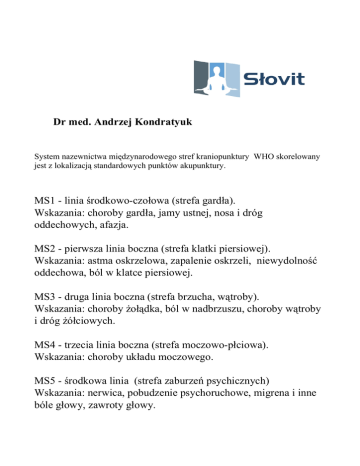 Dr med. Andrzej Kondratyuk System nazewnictwa międzynarodowego stref kraniopunktury WHO skorelowany jest z lokalizacją standardowych punktów akupunktury. MS1 linia środkowoczołowa (strefa gardła). Wskazania: choroby gardła, jamy ustnej, nosa i dróg oddechowych, afazja. MS2 pierwsza linia boczna (strefa klatki piersiowej). Wskazania: astma oskrzelowa, zapalenie oskrzeli, niewydolność oddechowa, ból w klatce piersiowej. MS3 druga linia boczna (strefa brzucha, wątroby). Wskazania: choroby żołądka, ból w nadbrzuszu, choroby wątroby i dróg żółciowych. MS4 trzecia linia boczna (strefa moczowopłciowa). Wskazania: choroby układu moczowego. MS5 środkowa linia (strefa zaburzeń psychicznych) Wskazania: nerwica, pobudzenie psychoruchowe, migrena i inne bóle głowy, zawroty głowy. MS6 przednia skośna linia (strefa ruchowa) Górna 1/5 linii odpowiada strefom kończyn dolnych i miednicy, środkowe 2/5 kończynom górnym i górnej części tułowia, dolne 2/5 linii głowa, szyja, mięśnie twarzy. Wskazania: niedowład i spastyczność po udarze, porażenie nerwu twarzowego, afazja. MS7 tylna skośna linia (strefa czuciowa) Górna 1/5 linii odpowiada strefom kończyn dolnych i miednicy, środkowe 2/5 kończynom górnym i górnej części tułowia, dolne 2/5 linii głowa, szyja, mięśnie twarzy. Wskazania: ból ośrodkowy, zaburzenia czucia, ból kręgosłupa, zębów, neuralgia nerwu trójdzielnego, ból żuchwy, zaburzenia czucia w obrębie twarzy. MS8 pierwsza linia boczna wierzchołka (strefa miednicy). Wskazania: lumbalgia, zaburzenia oddawania moczu. MS9 druga linia boczna (strefa apraksji). Wskazania: upośledzenie precyzyjnych celowych ruchów, zaburzenia koordynacji ruchowej. MS10 linia przednia skroniowa (strefa mowy 1). Wskazania: zaburzenia słuchu i mowy, ból głowy, migrena, zawroty głowy, szum w uszach; neuralgia nerwu trójdzielnego, neuropatia nerwów twarzy, ból zębów, obrzęk twarzy. MS11 linia boczna skroniowa (strefa słuchu i mowy 2). Wskazania: utrata słuchu, szum w uszach, zespół Meniere'a, afazja czuciowa. MS12 średnia linia potylicy (strefa głowy). Wskazania: bóle głowy, bóle i napięcie mięśniowe szyi; ból oka, zaburzenia wzroku; neurastenia, drgawki, niepokój, zawroty głowy, wymioty. MS13 linia boczna górna potylicy (strefa wzroku). Wskazania: zaburzenia wzroku pochodzenia ośrodkowego. MS14 linia boczna dolna potylicy (strefa równowagi). Wskazania: ataksja móżdżkowa.