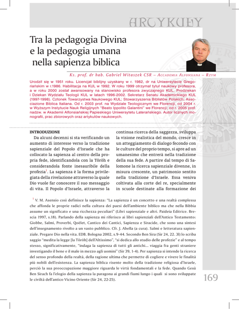 ARTYKUŁY Tra la pedagogia Divina e la pedagogia umana nella sapienza biblica K s. prof. dr hab. G abr iel W it aszek CSR – A c c a d e m i a A l f o n s i a n a – R z y m Urodził się w 1951 roku. Licencjat biblijny uzyskany w r. 1982, dr na Uniwersytecie Gregoriańskim w r.1986. Habilitacja na KUL w 1992. W roku 1999 otrzymał tytuł naukowy profesora, a w roku 2000 został awansowany na stanowisko profesora zwyczajnego KUL. Prodziekan i Dziekan Wydziału Teologii KUL w latach 1996-2002. Sekretarz Senatu Akademickiego KUL (1997-1998). Członek Towarzystwa Naukowego KUL; Stowarzyszenia Biblistów Polskich; Associazione Biblica Italiana. Od r. 2003 prof. na Wydziale Teologicznym we Florencji, od 2004 r. w Wyższym Instytucie Nauk Religijnych “Beato Ippolito Galantini” we Florencji; od r. 2005 prof. nadzw. w Akademii Alfonsiańskiej Papieskiego Uniwersytetu Laterańskiego. Autor licznych monografii, prac zbiorowych oraz artykułów naukowych. Introduzione Da alcuni decenni si sta verificando un aumento di interesse verso la tradizione sapienziale del Popolo d’Israele che ha collocato la sapienza al centro della propria fede, identificandola con la Tôrõh e considerandola fonte inesauribile della profezia1. La sapienza è la forma privilegiata della rivelazione attraverso la quale Dio vuole far conoscere il suo messaggio di vita. Il Popolo d’Israele, attraverso la 1 continua ricerca della saggezza, sviluppa la visione realistica del mondo, cresce in un atteggiamento di dialogo fecondo con le culture del proprio tempo, si apre ad un umanesimo che entrerà nella tradizione della sua fede. A partire dal tempo di Salomone la ricerca sapienziale divenne, in misura crescente, un patrimonio sentito nella tradizione d’Israele. Essa veniva coltivata alla corte del re, specialmente in scuole destinate alla formazione dei V. M. Asensio così definisce la sapienza: “La sapienza è un concetto e una realtà complessa che affonda le proprie radici nella cultura dei paesi dell’ambiente biblico ma che nella Bibbia assume un significato e una ricchezza peculiari” (Libri sapienziale e altri. Paideia Editrice. Brescia 1997, s.18). Parlando della sapienza mi riferisco ai libri sapienziali dell’Antico Testamento: Giobbe, Salmi, Proverbi, Qoèlet, Cantico dei Cantici, Sapienza e Siracide, che sono una sintesi dell’insegnamento rivolto a un vasto pubblico. Cfr. J. Abella (a cura). Salmi e letteratura sapienziale. Pregare Dio nella vita. EDB. Bologna 2002, s.9-44. Secondo Ben Sira (Sir 24, 22. 3l) lo scriba saggio “medita la legge [la Tôrõh] dell’Altissimo”, “si dedica allo studio delle profezie” e al tempo stesso, significativamente, “indaga la sapienza di tutti gli antichi... viaggia fra genti straniere investigando il bene e il male in mezzo agli uomini” (Sir 39, 1-4). Per sapienza si intende la ricerca del senso profondo della realtà, della ragione ultima che permette di cogliere e vivere le finalità più nobili dell’esistenza. La sapienza biblica risente molto della tradizione religiosa d’Israele, perciò la sua preoccupazione maggiore riguarda le virtù fondamentali e la fede. Quando Gesù Ben Sirach fa l’elogio della sapienza la paragona ai grandi fiumi lungo i quali si sono sviluppate le civiltà dell’antico Vicino Oriente (Sir 24, 22-25). 169 ARTICLES funzionari e degli scribi. La sapienza ha una chiara destinazione pedagogica, formare i giovani a un vero umanesimo che potremmo definire religioso, che consiste nel comprendere il senso della vita umana, nell’acquistare buon senso, prudenza, cautela, penetrazione, affabilità e pazienza, autocontrollo e ottimismo, fino ad arrivare attraverso una riflessione sull’esperienza a capire che il principio della vera sapienza è il timore di Dio. 1. La pedagogia della salvezza Le diverse potenzialità che l’uomo ha dalla nascita diventano virtù stabili e si concretizzano in opere costruttive attraverso l’educazione. Fra i vari campi dell’educazione il più importante riguarda le potenzialità morali e religiose dell’uomo, quelle che sviluppano le sue capacità di conoscere, amare e servire Dio, di unirsi con lui, vivendo nella giustizia, nella pietà religiosa e nella sobrietà 2. Questa educazione è necessaria, sappiamo infatti, dalla rivelazione di Dio, che ogni uomo nasce peccatore, per cui, lasciato a se stesso, può diventare facilmente prigioniero del male. Col peccato originale la natura umana si è corrotta. Non solo si è rovinata la bontà del rapporto uomo-donna, ma si è rovinato il naturale sviluppo che porta l’uomo dalla nascita alla maturità. L’uomo, infatti, per natura raggiunge il suo pieno sviluppo solo attraverso un 2 processo di graduale maturazione delle sue potenzialità. Se la natura umana si fosse mantenuta intatta, nella bontà originaria, questo processo si sarebbe svolto in modo naturale con l’acquisizione di verità e virtù sempre più alte3. La natura umana, dalla nascita è corrotta a livello, fisico, psicologico, spirituale e inquinata dal contatto col male. Questa contraddizione è spiegata soltanto dalla rivelazione di Dio, che parla di una creazione all’origine buona, ma corrotta in seguito dal peccato: dall’albero della conoscenza del bene e del male, Dio proibì all’uomo di toccare perché non muoia (Gen 2, 16-17). L’uomo muore perché, essendo ad immagine di Dio, è veramente se stesso quando compie sempre e soltanto il bene e mai il male. Con il peccato originale, archetipo di ogni genere di peccato, l’uomo scelse di fare il male, mischiandolo alla sua natura originaria, che era molto buona (Gen 1, 31) e tendente come fine ultimo al possesso del sommo bene, che è Dio, per unione d’amore. Mentre Dio si realizza solo nel bene, l’uomo cominciò a realizzarsi nel bene e nel male, mischiando alla sua natura buona il male delle sue scelte. Divenne così difforme rispetto al suo archetipo, che è Dio. L’uomo, uscito dalle mani di Dio, partecipa