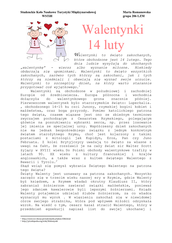 Studenckie Koło Naukowe Turystyki Międzynarodowej WSTiH Marta Romanowska grupa 206 LZM Walentynki 14 luty Walentynki to święto zakochanych, które obchodzone jest 14 lutego. Tego dnia ludzie wysyłają do ukochanych „walentynkę” wiersz albo wyznanie miłosne. Niekiedy obdarzają się upominkami. Walentynki to święto wszystkich zakochanych, zarówno tych którzy są zakochani, jak i tych którzy są nieśmiali i obawiają się wyznać swoje uczucie. Walentynki to szczególny dzień, na który warto starannie przygotować coś wyjątkowego.1 Walentynki są obchodzone w południowej i zachodniej średniowiecza. Europa północna i wschodnia Europie od dołączyła do walentynkowego grona znacznie później. Pierwowzorem walentynek było starorzymskie święto: Luperkalia. , obchodzonego 14-15 ku czci Junony, rzymskiej bogini kobiet i małżeństwa, oraz boga przyrody. Pomimo katolickiego patrona tego święta, czasem wiązane jest ono ze zbieżnym terminowo zwyczajem pochodzącym z Cesarstwa Rzymskiego, polegającym głównie na poszukiwaniu wybranki serca, np. przez losowanie jej imienia ze specjalnej urny. Współczesny dzień zakochanych nie ma jednak bezpośredniego związku z jednym konkretnym świętem starożytnego Rzymu, choć jest kojarzony z takimi postaciami z mitologii jak Kupidyn, Eros, Pan czy Juno Februata. Z kolei Brytyjczycy uważają to święto za własne z uwagi na fakt, że rozsławił je na cały świat sir Walter Scott żyjący w XVIII wieku. Do Polski obchody walentynkowe trafiły w latach 90. XX wieku z kultury francuskiej i krajów anglosaskich, a także wraz z kultem świętego Walentego z Bawarii i Tyrolu.2 Skąd wziął się pomysł wybrania Świętego Walentego na patrona tego święta? Święty Walenty jest uznawany za patrona zakochanych. Wszystko zaczęło się w trzecim wieku naszej ery w Rzymie, gdzie Walenty był księdzem, a Rzymem władał okrutny Klaudiusz II, który zabraniał żołnierzom zawierać związki małżeńskie, ponieważ jego zdaniem kawalerowie byli lepszymi żołnierzami. Ksiądz Walenty potajemnie udzielał ślubów żołnierzom, za co władca wyznaczył mu wyrok . W więzieniu zakochał się w niewidomej córce swojego strażnika, która pod wpływem miłości odzyskała wzrok. Na wieść o tym, cesarz kazał stracić Walentego, który w przeddzień egzekucji napisał list do swojej ukochanej i 1 2 http://www.we-dwoje.pl/walentynki,artykul,1586.html http://pl.wikipedia.org/wiki/Walentynki Studenckie Koło Naukowe Turystyki Międzynarodowej WSTiH Marta Romanowska grupa 206 LZM podpisał go: „Od Twojego Walentego”. Wyrok został wykonany 14 lutego 270 roku. Ludzie, których uszczęśliwił zaczęli obchodzić dzień jego śmierci jako Dzień Zakochanych. Inna wersja mówi o tym, że Walenty pomagał prześladowanym chrześcijanom na czym został przyłapany i skazany na śmierć. Pierwsze Walentynki zaczęto powszechnie obchodzić w średniowieczu, a pierwszym krajem do którego trafiły była Anglia. Wzmianka o świecie zakochanych pochodzi ze średniowiecznej angielskiej literatury. Umieścił ją w XIV wieku Geoffrey Chaucer w swych "Opowieściach Cantenberyjskich". O zwyczaju tym wspomina również w „Hamlecie” Szekspir. Z Anglii pochodzi też pierwsza zachowana kartka walentynkowa, a wysłał ją do swojej żony w 1415 Karol, książę Orleanu, gdy przebywał w więzieniu w londyńskim Tower. Za pierwszą nadawczynię walentynki uważa się rycerską córkę, Margery Brews, która w lutym 1477 roku pisząc do narzeczonego list, dołączyła do niego krótki wiersz miłosny własnego autorstwa. Na skalę masową kartki walentynkowe zaczęła produkować Amerykanka Esther Howland na początku XIX wieku. Od XVI wieku ofiarowywano w ten dzień kobietom kwiaty. Wtedy to, podczas balu walentynkowego zorganizowanego przez jedną z córek króla Francji Henryka IV, każda z obecnych na nim dziewcząt otrzymała wówczas od swojego partnera bukiet 3 kwiatów. Obecnie stałym niemalże elementem walentynek jest wzajemnie wręczanie 3 http://horoskop.wp.pl/kat,1015979,page,2,title,Tradycja-Walentynek,wid,11917434,wiadomosc.html