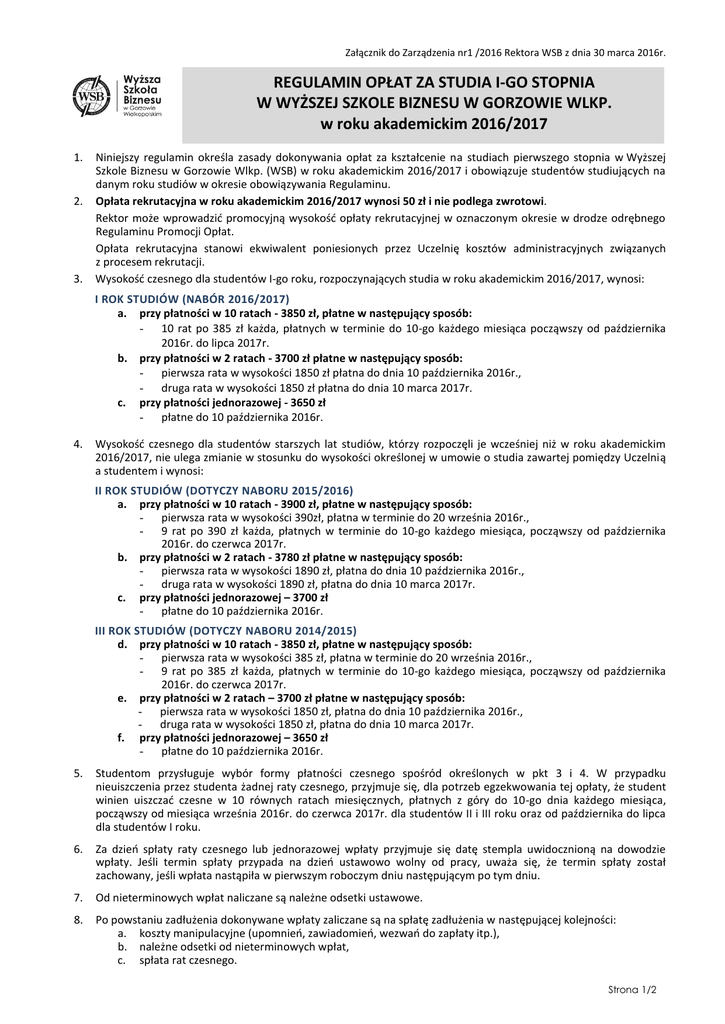 Załącznik do Zarządzenia nr1 /2016 Rektora WSB z dnia 30 marca 2016r. REGULAMIN OPŁAT ZA STUDIA I-GO STOPNIA W WYŻSZEJ SZKOLE BIZNESU W GORZOWIE WLKP. w roku akademickim 2016/2017 1. 2. 3. Niniejszy regulamin określa zasady dokonywania opłat za kształcenie na studiach pierwszego stopnia w Wyższej Szkole Biznesu w Gorzowie Wlkp. (WSB) w roku akademickim 2016/2017 i obowiązuje studentów studiujących na danym roku studiów w okresie obowiązywania Regulaminu. Opłata rekrutacyjna w roku akademickim 2016/2017 wynosi 50 zł i nie podlega zwrotowi. Rektor może wprowadzić promocyjną wysokość opłaty rekrutacyjnej w oznaczonym okresie w drodze odrębnego Regulaminu Promocji Opłat. Opłata rekrutacyjna stanowi ekwiwalent poniesionych przez Uczelnię kosztów administracyjnych związanych z procesem rekrutacji. Wysokość czesnego dla studentów I-go roku, rozpoczynających studia w roku akademickim 2016/2017, wynosi: I ROK STUDIÓW (NABÓR 2016/2017) a. przy płatności w 10 ratach - 3850 zł, płatne w następujący sposób: - 10 rat po 385 zł każda, płatnych w terminie do 10-go każdego miesiąca począwszy od października 2016r. do lipca 2017r. b. przy płatności w 2 ratach - 3700 zł płatne w następujący sposób: - pierwsza rata w wysokości 1850 zł płatna do dnia 10 października 2016r., - druga rata w wysokości 1850 zł płatna do dnia 10 marca 2017r. c. przy płatności jednorazowej - 3650 zł - płatne do 10 października 2016r. 4. Wysokość czesnego dla studentów starszych lat studiów, którzy rozpoczęli je wcześniej niż w roku akademickim 2016/2017, nie ulega zmianie w stosunku do wysokości określonej w umowie o studia zawartej pomiędzy Uczelnią a studentem i wynosi: II ROK STUDIÓW (DOTYCZY NABORU 2015/2016) a. przy płatności w 10 ratach - 3900 zł, płatne w następujący sposób: - pierwsza rata w wysokości 390zł, płatna w terminie do 20 września 2016r., - 9 rat po 390 zł każda, płatnych w terminie do 10-go każdego miesiąca, począwszy od października 2016r. do czerwca 2017r. b. przy płatności w 2 ratach - 3780 zł płatne w następujący sposób: - pierwsza rata w wysokości 1890 zł, płatna do dnia 10 października 2016r., - druga rata w wysokości 1890 zł, płatna do dnia 10 marca 2017r. c. przy płatności jednorazowej – 3700 zł - płatne do 10 października 2016r. III ROK STUDIÓW (DOTYCZY NABORU 2014/2015) d. przy płatności w 10 ratach - 3850 zł, płatne w następujący sposób: - pierwsza rata w wysokości 385 zł, płatna w terminie do 20 września 2016r., - 9 rat po 385 zł każda, płatnych w terminie do 10-go każdego miesiąca, począwszy od października 2016r. do czerwca 2017r. e. przy płatności w 2 ratach – 3700 zł płatne w następujący sposób: - pierwsza rata w wysokości 1850 zł, płatna do dnia 10 października 2016r., - druga rata w wysokości 1850 zł, płatna do dnia 10 marca 2017r. f. przy płatności jednorazowej – 3650 zł - płatne do 10 października 2016r. 5. Studentom przysługuje wybór formy płatności czesnego spośród określonych w pkt 3 i 4. W przypadku nieuiszczenia przez studenta żadnej raty czesnego, przyjmuje się, dla potrzeb egzekwowania tej opłaty, że student winien uiszczać czesne w 10 równych ratach miesięcznych, płatnych z góry do 10-go dnia każdego miesiąca, począwszy od miesiąca września 2016r. do czerwca 2017r. dla studentów II i III roku oraz od października do lipca dla studentów I roku. 6. Za dzień spłaty raty czesnego lub jednorazowej wpłaty przyjmuje się datę stempla uwidocznioną na dowodzie wpłaty. Jeśli termin spłaty przypada na dzień ustawowo wolny od pracy, uważa się, że termin spłaty został zachowany, jeśli wpłata nastąpiła w pierwszym roboczym dniu następującym po tym dniu. 7. Od nieterminowych wpłat naliczane są należne odsetki ustawowe. 8. Po powstaniu zadłużenia dokonywane wpłaty zaliczane są na spłatę zadłużenia w następującej kolejności: a. koszty manipulacyjne (upomnień, zawiadomień, wezwań do zapłaty itp.), b. należne odsetki od nieterminowych wpłat, c. spłata rat czesnego. Strona 1/2 9. Koszty manipulacyjne każdej z czynności wymienionych w pkt 8 lit. a wynoszą 20 zł. 10. Warunkiem otrzymania karty okresowych osiągnięć studenta dotyczącej danego semestru jest uiszczenie wszystkich wymaganych rat czesnego za dany semestr należnych do dnia wydania karty na konto wskazane przez Uczelnię w umowie zawartej między Uczelnią a studentem. 11. Dodatkowa opłata za powtarzane przez studenta przedmioty w przypadkach: - zezwolenia na powtarzanie semestru studiów, - zezwolenia na warunkowe wpisanie na wyższy semestr, wynosi 10% rocznego czesnego na danym trybie nauki określonego w pkt 3 lit. c, oraz w pkt. 4 lit c i f za każdy przedmiot w zaokrągleniu do pełnych złotych i płatna jest jednorazowo do 30 października w semestrze zimowym i do 28 lutego w semestrze letnim. Przepisy pkt 6 - 9 stosuje się odpowiednio. 12. Odpłatność za studiowanie według indywidualnego programu studiów (IPS) oraz indywidualnej organizacji zajęć (IOZ) jest iloczynem liczby realizowanych przez studenta w danym semestrze przedmiotów i 6% rocznego czesnego w danym roku akademickim określonego w pkt 3 lit. c oraz pkt.4 lit. c i f, z zastrzeżeniem pkt 14, w zaokrągleniu do pełnych złotych. Przepisy pkt 5 -9 stosuje się odpowiednio. 13. W przypadku podjęcia nauki przez studenta na drugiej specjalności w ramach tego samego kierunku studiów w WSB, student zobowiązany jest do wniesienia dodatkowej opłaty w wysokości 50% rocznego czesnego w danym trybie studiów, określonego w pkt. 3 lit. c, oraz w pkt. 4 lit c i f, z zastrzeżeniem pkt 14, za każdy rok nauki, płatnej jednorazowo do 31 października w semestrze zimowym i do 28 lutego w semestrze letnim. 14. Opłata za uzupełnienie różnic programowych wynosi 100 zł za każdy przedmiot i jest płatna jednorazowo do 31 października w semestr