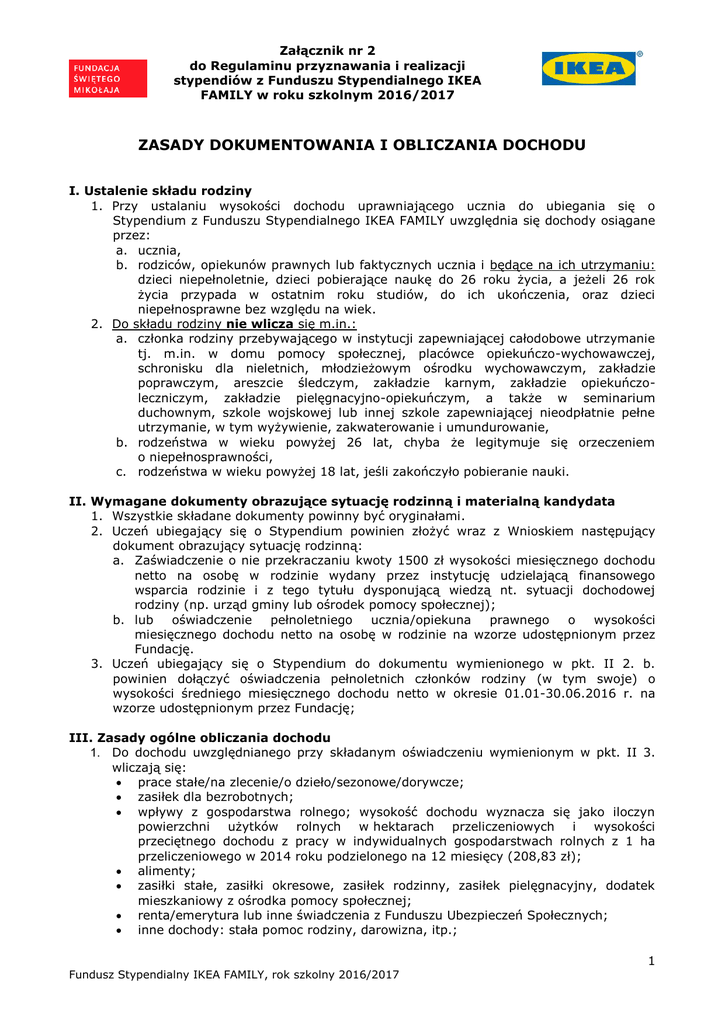 Załącznik nr 2 do Regulaminu przyznawania i realizacji stypendiów z Funduszu Stypendialnego IKEA FAMILY w roku szkolnym 2016/2017 ZASADY DOKUMENTOWANIA I OBLICZANIA DOCHODU I. Ustalenie składu rodziny 1. Przy ustalaniu wysokości dochodu uprawniającego ucznia do ubiegania się o Stypendium z Funduszu Stypendialnego IKEA FAMILY uwzględnia się dochody osiągane przez: a. ucznia, b. rodziców, opiekunów prawnych lub faktycznych ucznia i będące na ich utrzymaniu: dzieci niepełnoletnie, dzieci pobierające naukę do 26 roku życia, a jeżeli 26 rok życia przypada w ostatnim roku studiów, do ich ukończenia, oraz dzieci niepełnosprawne bez względu na wiek. 2. Do składu rodziny nie wlicza się m.in.: a. członka rodziny przebywającego w instytucji zapewniającej całodobowe utrzymanie tj. m.in. w domu pomocy społecznej, placówce opiekuńczo-wychowawczej, schronisku dla nieletnich, młodzieżowym ośrodku wychowawczym, zakładzie poprawczym, areszcie śledczym, zakładzie karnym, zakładzie opiekuńczoleczniczym, zakładzie pielęgnacyjno-opiekuńczym, a także w seminarium duchownym, szkole wojskowej lub innej szkole zapewniającej nieodpłatnie pełne utrzymanie, w tym wyżywienie, zakwaterowanie i umundurowanie, b. rodzeństwa w wieku powyżej 26 lat, chyba że legitymuje się orzeczeniem o niepełnosprawności, c. rodzeństwa w wieku powyżej 18 lat, jeśli zakończyło pobieranie nauki. II. Wymagane dokumenty obrazujące sytuację rodzinną i materialną kandydata 1. Wszystkie składane dokumenty powinny być oryginałami. 2. Uczeń ubiegający się o Stypendium powinien złożyć wraz z Wnioskiem następujący dokument obrazujący sytuację rodzinną: a. Zaświadczenie o nie przekraczaniu kwoty 1500 zł wysokości miesięcznego dochodu netto na osobę w rodzinie wydany przez instytucję udzielającą finansowego wsparcia rodzinie i z tego tytułu dysponującą wiedzą nt. sytuacji dochodowej rodziny (np. urząd gminy lub ośrodek pomocy społecznej); b. lub oświadczenie pełnoletniego ucznia/opiekuna prawnego o wysokości miesięcznego dochodu netto na osobę w rodzinie na wzorze udostępnionym przez Fundację. 3. Uczeń ubiegający się o Stypendium do dokumentu wymienionego w pkt. II 2. b. powinien dołączyć oświadczenia pełnoletnich członków rodziny (w tym swoje) o wysokości średniego miesięcznego dochodu netto w okresie 01.01-30.06.2016 r. na wzorze udostępnionym przez Fundację; III. Zasady ogólne obliczania dochodu 1. Do dochodu uwzględnianego przy składanym oświadczeniu wymienionym w pkt. II 3. wliczają się: prace stałe/na zlecenie/o dzieło/sezonowe/dorywcze; zasiłek dla bezrobotnych; wpływy z gospodarstwa rolnego; wysokość dochodu wyznacza się jako iloczyn powierzchni użytków rolnych w hektarach przeliczeniowych i wysokości przeciętnego dochodu z pracy w indywidualnych gospodarstwach rolnych z 1 ha przeliczeniowego w 2014 roku podzielonego na 12 miesięcy (208,83 zł); alimenty; zasiłki stałe, zasiłki okresowe, zasiłek rodzinny, zasiłek pielęgnacyjny, dodatek mieszkaniowy z ośrodka pomocy społecznej; renta/emerytura lub inne świadczenia z Funduszu Ubezpieczeń Społecznych; inne dochody: stała pomoc rodziny, darowizna, itp.; 1 Fundusz Stypendialny IKEA FAMILY, rok szkolny 2016/2017 Załącznik nr 2 do Regulaminu przyznawania i realizacji stypendiów z Funduszu Stypendialnego IKEA FAMILY w roku szkolnym 2016/2017 2. 3. 4. 5. dochody uzyskiwane poza granicami kraju (dokonuje się ich przeliczenia na podstawie średniego kursu walut ogłaszanego przez Prezesa Narodowego Banku Polskiego w dn. wypełniania oświadczenia ucznia/członka rodziny o wysokości średniego miesięcznego dochodu netto). W przypadku, gdy dochód rodziny jest niższy niż 350 zł na osobę w rodzinie należy dołączyć stosowne oświadczenie wyjaśniające sytuację materialną rodziny (jak rodzina się utrzymuje mając tak niskie dochody). Do dochodu nie wlicza się stypendiów, zasiłków celowych (jednorazowego pieniężnego świadczenia socjalnego, obiadów) wypłacanych przez ośrodek pomocy społecznej, dopłat bezpośrednich dla rolników oraz świadczeń w ramach programu Rodzina 500 Plus. Zasiłki rodzinne, alimenty i renty po zmarłym rodzicu przypisuje się osobie, która je pobiera (czyli osobie pełnoletniej, najczęściej jest to jedno z rodziców). Jeśli osoba niepełnoletnia uzyskuje dochód z prac dorywczych w jej imieniu opiekun prawny powinien podpisać oświadczenie o dochodzie. IV. Zmiana sytuacji dochodowej rodziny 1. W przypadku znaczącej zmiany dochodu rodziny w stosunku do tego przedstawionego za okres od 01.01 do 31.06.2016 r. wynikającej z utraty dochodu przez jednego lub więcej członków rodziny, który wpływałby na obniżenie kwoty do wymaganej granicy 1500 zł miesięcznego dochodu netto na jednego członka rodziny pełnoletni uczeń/opiekun prawny może przedstawić stosowne oświadczenie wyjaśniające zaistniałą sytuację. Na podstawie tego oświadczenia Szkoła w konsultacji z Fundacją podejmie ostateczną decyzję o przyjęciu bądź nie Wniosku jako poprawnego pod względem formalnym. 2. W przypadku znaczącej zmiany dochodu rodziny w stosunku do tego przedstawionego za okres od 01.01 do 31.06.2016 r. wynikającej z uzyskania przez jednego lub więcej członków rodziny dochodu, który wpływałby na przekroczenie kwoty 1500 zł miesięcznego dochodu netto na jednego członka rodziny pełnoletni uczeń/opiekun prawny jest zobowiązany do powiadomienia o tym Fundacji. W tej sytuacji Wniosek nie może być brany pod uwagę przy kwalifikacji do stypendium. Jeśli sytuacja uległa zmianie w trakcie otrzymywania stypendium, zostaje ono wstrzymane. V. Załączniki 1. Załącznik nr 1 – Oświadczenie pełnoletniego ucznia/opiekuna prawnego o wysokości miesięcznego dochodu netto na osobę w rodzinie 2. Załącznik nr 2 - Oświadczenie pełnoletniego członka rodziny o wysokości średniego miesięcznego dochodu ne
