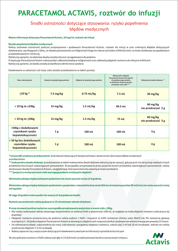 PARACETAMOL ACTAVIS, roztwór do infuzji Środki ostrożności dotyczące stosowania: ryzyko popełnienia błędów medycznych Ważne informacje dotyczące Paracetamol Actavis, 10 mg/ml, roztwór do infuzji Ryzyko popełnienia błędów medycznych Należy zachować ostrożność podczas przepisywania i podawania Paracetamol Actavis, roztwór do infuzji w celu uniknięcia błędów dotyczących dawkowania, wynikających z faktu, że dawka paracetamolu w miligramach (mg) nie równa się liczbie mililitrów (ml), co może skutkować przypadkowym przedawkowaniem i śmiercią. Należy się upewnić, że właściwa dawka została zlecona i przygotowana do podania. Przepisując Paracetamol Actavis należy podać całkowitą dawkę w miligramach oraz całkowitą objętość roztworu do infuzji w mililitrach. Należy się upewnić, że dawka została prawidłowo odmierzona i podana. Dawkowanie w zależności od masy ciała zostało przedstawione w tabeli poniżej: Masa ciała pacjenta Dawka do pojedynczego podania Objętość do pojedynczego podania Maksymalna objętość Paracetamol Actavis (10 mg/ml) do pojedynczego podania w zależności od górnej granicy przedziału masy ciała *** Maksymalna dawka dobowa ** <10 kg * 7.5 mg/kg 0.75 mL/kg 7.5 mL 30 mg/kg > 10 kg to <33kg 15 mg/kg 1.5 mL/kg 49.5 mL 60 mg/kg nie przekraczać 2 g > 33 kg to <50kg 15 mg/kg 1.5 mL/kg 75 mL 60 mg/kg nie przekraczać 3 g >50kg z dodatkowymi czynnikami ryzyka hepatotoksyczności 1g 100 mL 100 mL 3g > 50 kg bez dodatkowych czynników ryzyka hepatotoksyczności 1g 100 mL 100 mL 4g *noworodki urodzone przedwcześnie: brak danych dotyczących bezpieczeństwa i skuteczności dla noworodków urodzonych przedwcześnie **maksymalna dawka dobowa: przedstawione w tabeli maksymalne dawki dobowe odnoszą się do sytuacji, gdy pacjent nie otrzymuje żadnych innych produktów leczniczych zawierających paracetamol. W przypadku przyjmowania przez pacjenta innych produktów zawierających paracetamol, należy dostosować dawkę Paracetamol Actavis, uwzględniając ilość paracetamolu zawartą w innym produkcie. ***pacjenci o mniejszej masie ciała wymagają podania mniejszych objętości Minimalny odstęp między kolejnymi podaniami nie może wynosić mniej niż 4 godziny. Minimalny odstęp między kolejnymi podaniami u pacjentów z niewydolnością nerek (klirens kreatyniny poniżej 30 ml/min) nie może wynosić mniej niż 6 godzin. W ciągu 24 godzin można podać nie więcej niż 4 pojedyncze dawki. Roztwór paracetamolu należy podawać w 15 minutowym wlewie dożylnym. Proszę stosować poniższe wytyczne w przypadku przepisywania pacjentom o masie ciała <10kg: • Nie należy wykonywać wlewu dożylnego bezpośrednio ze szklanej fiolki o pojemności 100 ml, ze względu na małą objętość roztworu zalecaną w tej populacji • Objętość roztworu przeznaczoną do podania należy pobrać z fiolki i rozpuścić w 0,9% roztworze chlorku sodu (NaCl) lub 5% roztworze glukozy w proporcji 1: 10 (jedna objętość Paracetamol Actavis w dziewięciu objętościach rozpuszczalnika) i podawać we wlewie trwającym powyżej 15 minut. • Do odmierzenia dawki, odpowiedniej do masy ciała dziecka i pożądanej objętości roztworu, należy użyć 5 ml lub 10 ml strzykawki. Jednak nie należy przekraczać objętości 7,5 ml na dawkę. • Należy zapoznać się z wytycznymi dotyczącymi dawkowania zwartymi w informacji o produkcie leczniczym W celu pobrania roztworu z fiolki należy użyć igły nr 21 (0,8 mm) i przebić pionowo korek w zaznaczonym miejscu. Paracetamol Actavis 10mg/ml – dawkowanie Masa ciała pacjenta (kg) Pojedyncza dawka (mg) Pojedyncza objętość (ml) 1 2 3 4 5 6 7 8 9 10 11 12 14 16 18 20 22 24 26 28 30 32 33 34 36 38 40 42 44 46 48 50 > 50 7.50 15.00 22.50 30.00 37.50 45.00 52.50 60.00 67.50 75.00 165.00 180.00 210.00 240.00 270.00 300.00 330.00 360.00 390.00 420.00 450.00 480.00 495.00 510.00 540.00 570.00 600.00 630.00 660.00 690.00 720.00 750.00 1000.00 0.75 1.50 2.25 3.00 3.75 4.50 5.25 6.00 6.75 7.50 16.50 18.00 21.00 24.00 27.00 30.00 33.00 36.00 39.00 42.00 45.00 48.00 49.50 51.00 54.00 57.00 60.00 63.00 66.00 69.00 72.00 75.00 100.00 Dodatkowe informacje W celu uzyskania dodatkowych informacji należy skontaktować się z: Actavis Polska sp. z o.o., ul. Marynarska 15, 02-674 Warszawa, tel. (22) 512 2900. Zgłaszanie podejrzenia wystąpienia działania niepożądanego Należy zgłaszać wszelkie przypadki wystąpienia działania niepożądanego dotyczące tego produktu leczniczego. Osoby należące do fachowego personelu medycznego powinny zgłaszać wszelkie podejrzewane działania niepożądane za pośrednictwem Departamentu Monitorowania Niepożądanych Działań Produktów Leczniczych Urzędu Rejestracji Produktów Leczniczych, Wyrobów Medycznych i Produktów Biobójczych, ul. Ząbkowska 41, 03 736 Warszawa, tel.: + 48 22 49 21 301, faks: + 48 22 49 21 309, e-mail: [email protected]. Działania niepożądane należy zgłaszać także do firmy Actavis Polska sp. z o.o.: Anna Pintara-Batogowska, ul. Marynarska 15, 02-674 Warszawa tel. (22) 512 2954, fax (22) 512 2996, e –mail: [email protected]. Materiał edukacyjny dostępny jest na życzenie w Actavis Polska sp. z o.o., ul. Marynarska 15, 02 674 Warszawa, tel. (22) 512 2900 oraz na stronie internetowej www.actavispolska.pl.