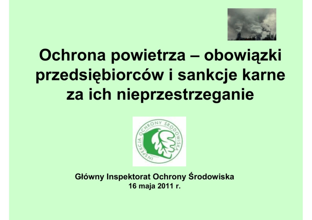Ochrona powietrza – obowiązki przedsiębiorców i sankcje karne za ich nieprzestrzeganie Główny Inspektorat Ochrony Środowiska 16 maja 2011 r. Wprowadzenie Ustawa z dnia 27 kwietnia 2001 r. Prawo ochrony środowiska (Poś) • Art. 1 – ustawa określa zasady ochrony środowiska oraz warunki korzystania z jego zasobów, z uwzględnieniem wymagań zrównoważonego rozwoju (warunki ochrony zasobów środowiska, wprowadzania substancji lub energii do środowiska, kosztów korzystania ze środowiska, obowiązki organów administracji, odpowiedzialność i sankcje) 2 Podstawowe zasady ochrony powietrza Tytuł III „Przeciwdziałanie zanieczyszczeniom” • Art. 141 – eksploatacja instalacji lub urządzenia nie powinna powodować przekroczenia standardów emisyjnych a jej oddziaływanie nie powinno powodować pogorszenia stanu środowiska w znacznych rozmiarach lub zdrowia ludzi • Art. 144 – eksploatacja instalacji nie powinna powodować przekroczenia standardów jakości środowiska 3 Podstawowe zasady ochrony powietrza • Rozporządzenie Ministra Środowiska z dnia 20 grudnia 2005 r. w sprawie standardów emisyjnych z instalacji (na podstawie art. 145 ust. 1 pkt 1 i 146 ust. 2 i 4 Poś) Standardy zróżnicowane w zależności od rodzaju działalności, procesu technologicznego lub operacji technicznej oraz terminu oddania instalacji do eksploatacji, terminu zakończenia jej eksploatacji lub dalszego łącznego czasu jej eksploatacji, Sytuacje uzasadniające przejściowe odstępstwa, granice odstępstw, warunki uznawania standardów za dotrzymane, rodzaje zakłóceń, gdy wymagane jest wstrzymanie użytkowania. 4 Podstawowe zasady ochrony powietrza • Rozporządzenie Ministra Środowiska z dnia 26 stycznia 2010 r. w sprawie wartości odniesienia dla niektórych substancji w powietrzu – przy braku standardów emisyjnych i dopuszczalnych poziomów substancji w powietrzu (na podstawie art. 222 ust. 2 Poś) Wartości odniesienia dla niektórych substancji zróżnicowane dla terenu kraju, z wyłączeniem obszarów ochrony uzdrowiskowej oraz dla obszarów ochrony uzdrowiskowej, Warunki, w jakich ustala się wartości odniesienia (temperatura, ciśnienie), Oznaczenie numeryczne substancji – jednoznaczna identyfikacja Okresy, dla których są uśrednione wartości odniesienia Warunki uznawania wartości odniesienia za dotrzymane Referencyjne metodyki modelowania poziomów substancji5 w powietrzu. Pomiary kontrola funkcjonowania instalacji • Art. 147 ust. 1 - prowadzący instalację oraz użytkownik urządzenia są obowiązani do okresowych pomiarów wielkości emisji • Art. 147 ust. 2 – prowadzący instalację oraz użytkownik urządzenia są obowiązani do ciągłych pomiarów wielkości emisji w razie wprowadzania do środowiska znacznych ilości substancji lub energii • Art. 147 ust. 3 – zakres obowiązku prowadzenia pomiarów (ust. 1 i 2) może być związany z parametrami charakteryzującymi wydajność lub moc instalacji albo urządzenia 6 Pomiary • Art. 147 ust. 4 – prowadzący instalację nowo zbudowaną lub zmienioną w istotny sposób, z której emisja wymaga pozwolenia, jest obowiązany do przeprowadzenia wstępnych pomiarów wielkości emisji z tej instalacji • Art. 147 ust 5 – wstępne pomiary (ust. 4) należy zrealizować najpóźniej w ciągu 14 dni od zakończenia rozruchu instalacji lub uruchomienia urządzenia, chyba że organ właściwy do wydania pozwolenia określił w pozwoleniu inny termin • Art. 147 ust. 6 – prowadzący instalację oraz użytkownik urządzenia są obowiązani do ewidencjonowania wyników przeprowadzonych pomiarów oraz ich przechowywania przez 5 lat od zakończenia roku kalendarzowego, którego dotyczą. 7 Pomiary • Art. 147a ust. 1 – prowadzący instalację oraz użytkownik urządzenia są obowiązani zapewnić wykonanie pomiarów wielkości emisji lub innych warunków korzystania ze środowiska przez: akredytowane laboratorium w rozumieniu ustawy z dnia 30 sierpnia 2002 r. o systemie oceny zgodności certyfikowane jednostki badawcze, o których mowa w art. 16 ust. 1 ustawy z dnia 25 lutego 2011 r. o substancjach chemicznych i ich mieszaninach w zakresie badań, do których wykonywania są obowiązani. 8 Pomiary • Art. 147a ust. 1a – Prowadzący instalację oraz użytkownik urządzenia, posiadający certyfikat systemu zarządzania jakością, mogą wykonywać pomiary wielkości emisji lub innych warunków korzystania ze środowiska, do których wykonywania są obowiązani, we własnym laboratorium, pod warunkiem że laboratorium to jest również objęte systemem zarządzania jakością. • Art. 147a ust. 2 - Jeżeli prowadzący instalację jest obowiązany do prowadzenia ciągłych pomiarów wielkości emisji, powinien zapewnić możliwość automatycznego ciągłego zapisu wyników przez przyrząd pomiarowy. 9 Pomiary • Rozporządzenie Ministra Środowiska z dnia 4 listopada 2008 r. w sprawie wymagań w zakresie prowadzenia pomiarów wielkości emisji oraz pomiarów ilości pobieranej wody określa: (na podstawie art. 148 ust. 1 Poś) przypadki, w których wymagany jest ciągły pomiar emisji z instalacji, przypadki, w których wymagane są okresowe pomiary emisji z instalacji albo urządzenia oraz częstotliwość prowadzenia tych pomiarów, referencyjne metodyki wykonywania pomiarów, sposób ewidencjonowania przeprowadzonych pomiarów. 10 Pomiary okresowe • Okresowe pomiary emisji do powietrza prowadzi się dwa razy w roku, raz w sezonie zimowym (październik-marzec) oraz raz w sezonie letnim (kwiecień-wrzesień) • W przypadku instalacji lub źródeł pracujących sezonowo w okresie nieprzekraczającym sześciu miesięcy, pomiary emisji do powietrza prowadzi się raz w roku w okresie pracy instalacji lub źródeł 11 Pomiary ciągłe Rozporządzenie Ministra Środowiska z dnia 4 listopada 2008 r. • Instalacje spalania paliw – o łącznej nominalnej mocy cieplnej nie mniejszej niż 100MW (łą