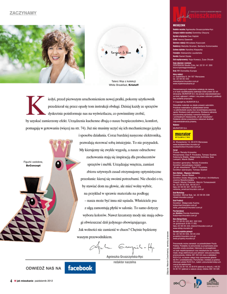 ZACZYNAMY NOWOCZESNY PORADNIK O U R Z Ą D Z A N I U W N Ę T R Z mieszkanie MIESIĘCZNIK Redaktor naczelna: Agnieszka Gruszczyńska-Hyc Zastępca redaktor naczelnej: Dominika Olszyna Dyrektor artystyczna: Ewa Hajduk Grafik: Hanna Gawerek Sekretarz redakcji: Mirosława Kopoczek Redaktorzy: Matylda Gruman, Barbara Komorowska Szefowa stylistów: Karolina Klepacka Fotoedytor: Aleksandra Laudańska Korekta: Daniel Działa Stali współpracownicy: Kaja Kowacz, Zuza Olczak Sesje zdjęciowe i aranżacje: PENTAGON Studio Foto, tel. 22 51 41 300 [email protected] Druk: RR Donnelley Europe Adres redakcji: ul. Dęblińska 6, 04-187 Warszawa tel. 22 59 05 443 [email protected] www.mjakmieszkanie.pl Talerz Wąs z kolekcji White Breakfast, Kristoff K Niezamówionych materiałów redakcja nie zwraca, a w razie opublikowania zastrzega sobie prawo do ich skracania. MURATOR S.A. nie ponosi odpowiedzialności za treść ogłoszeń i reklam i ma prawo odmówić publikacji bez podania przyczyny. iedyś, przed pierwszym uruchomieniem nowej pralki, pokorny użytkownik © Copyright by MURATOR S.A. przedzierał się przez opasły tom instrukcji obsługi. Dzisiaj każdy ze sprzętów by uzyskać zamierzony efekt. Urządzenia kuchenne dbają o nasze bezpieczeństwo, komfort, Wszystkie materiały są objęte prawem autorskim. Przedruk materiałów w jakiejkolwiek formie i w jakimkolwiek języku bez wcześniejszej pisemnej zgody Wydawcy jest zabroniony. Wydawca zabrania bezumownej sprzedaży numerów bieżących i archiwalnych miesięcznika „M jak mieszkanie”. Działanie wbrew powyższemu zakazowi skutkuje odpowiedzialnością prawną. pomagają w gotowaniu (więcej na str. 74). Już nie musimy uczyć się ich mechanicznego języka Wydawca MURATOR S.A. dyskretnie poinformuje nas na wyświetlaczu, co powinniśmy zrobić, i sposobu działania. Coraz bardziej nasycone elektroniką, pozwalają sterować sobą intuicyjnie. To nie przypadek. Al. Wyzwolenia 14, 00-570 Warszawa www.wydawnictwo.murator.pl [email protected] My kierujemy się zwykle wygodą, a nasze odruchowe zachowania stają się inspiracją dla producentów Figurki ozdobne, BoConcept sprzętów i mebli. Urządzając wnętrza, zamiast zbioru sztywnych zasad otrzymujemy optymistyczne przesłanie: kieruj się swoimi potrzebami. Nie chodzi o to, by stawiać dom na głowie, ale mieć wolny wybór, na przykład w sprawie materiału na podłogę – nasza może być inna niż sąsiada. Właściciele psa z ulgą zamontują płytki w salonie. To samo dotyczy wyboru kolorów. Nawet kreatorzy mody nie mają odwa- Jak wolności nie zamienić w chaos? Chętnie będziemy waszym przewodnikiem. Agnieszka Gruszczyńska-Hyc redaktor naczelna ODWIEDŹ NAS NA Zdjęcia: Marcin Czechowicz, serwisy prasowe gi obwieszczać dziś jedynego obowiązującego. Zarząd Prezes: Renata Krzewska Wiceprezesi: Ewa P. Porębska, Tomasz Szakiel, Katarzyna Białek, Małgorzata Golińska, Ewa Lampart, Marek Białek Dyrektor generalny: Renata Krzewska Dyrektor zarządzający tytułem „M jak mieszkanie”: Ewa P. Porębska Dyrektor operacyjny: Tomasz Szakiel Biuro Reklamy – Magazyny i Informatory Dyrektor: Marek Białek Dyrektor Działu Magazyny, Wnętrza i Architektura: Joanna Myszkorowska Zespół: Maciej Oleksiuk, Marcin Tomaszewski tel. 22 59 05 024, 59 05 017 faks 22 59 05 321, 59 05 475 [email protected] Dział Marketingu Dyrektor: Michał Bąk, tel. 22 59 05 338 [email protected] Dział Produkcji Dyrektor: Małgorzata Kuźma [email protected] [email protected] Pion Dystrybucji p.o. Dyrektora: Dorota Kamińska [email protected] Biuro Obsługi Klienta tel. 22 59 05 555 801 322 555 (w godzinach 9.00-17.00) faks 22 59 05 444, [email protected] www.sklep.murator.pl Sprzedaż projektów gotowych tel. 22 59 05 555, 59 05 233 [email protected] www.projekty.murator.pl Prenumeratę można zamawiać: za pośrednictwem Poczty Polskiej. Przedpłaty na prenumeratę są przyjmowane przez wszystkie urzędy pocztowe i listonoszy (w szczególności od osób niepełnosprawnych oraz mieszkańców wsi i małych miast), drogą elektroniczną pod adresem: www.poczta-polska. pl/prenumerata, infolinia: 801 333 444 oraz w oddziałach RUCH S.A. na terenie całego kraju (prenumerata głównie dla firm i przedsiębiorstw). Prenumerata z dostawą za granicę: informacji udziela RUCH S.A., mailem: [email protected]. com.pl lub telefonicznie: (+48 22) 53 28 734, 53 28 819 (płatność w złotych), (+48 22) 53 28 731 (płatność w walucie obcej), infolinia: 800 120 029. M jak mieszkanie październik 2012 Numer rejestru 339