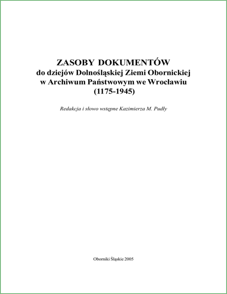 ZASOBY DOKUMENTÓW do dziejów Dolnoœl¹skiej Ziemi Obornickiej w Archiwum Pañstwowym we Wroc³awiu (1175-1945) Redakcja i s³owo wstêpne Kazimierza M. Pud³y Oborniki Œl¹skie 2005 1 Rada Wydawnicza: Maciej Borowski, Maria Burzyñska, Krzysztof Czerkas, Andrzej Czermak, Wies³awa Czmiel, Jaros³aw Czmiel, Norbert Morciniec (wiceprzewodnicz¹cy), Halina Muszak, Romana Obrocka (koordynator), Kazimierz M. Pud³o (przewodnicz¹cy), Bogdan Wróbel Ilustracje ze zbiorów: AP we Wroc³awiu. Projekt ok³adki: Jaros³aw Pawlak Na ok³adce: Ok³adka tytu³owa. Budynek Archiwum Pañstwowego we Wroc³awiu. Fot. R.Bacmager; Dokument ks.Boles³awa Wysokiego z 1175 r. dla klasztoru w miejscowoœci Lubi¹¿ (Katalog, cz.I, Wilczyn). Ok³adka tylna, wewnêtrzna. Plan regulacji rzeki Odry ko³o miasta Uraz z prze³omu roku 1778/ 1779 (Katalog, cz.II, ZRRO., I/95). Ok³adka tylna, zewnêtrzna. Plan folwarku w miejscowoœci Oborniki z 1822 r. Wykona³ Opitz (Katalog, cz.II, Kom.G., T.60). Streszczenia w jêzyku niemieckim: Autorów © Copyright by Urz¹d Miejski w Obornikach Œl¹skich Zeszyt wydano ze œrodków finansowych Samorz¹du Gminy Oborniki Œl¹skie oraz Fundacji Wspó³pracy Polsko-Niemieckiej w Warszawie. ISSN 1731 – 8254 Sk³ad i druk: Studio Graphito, ul. Dworcowa 52, 55-120 Oborniki Œl¹skie, tel/fax: (071) 310 21 65, e-mail: graphito@poczta. wp. pl Wydawca: Urz¹d Miejski w Obornikach Œl¹skich ul. Trzebnicka 1, 55-120 Oborniki Œl¹skie tel. + 48 (71) 310 35 19 www. oborniki-slaskie. pl e-mail: oborniki@oborniki-slaskie. pl 2 SPIS TREŒCI S³owo wstêpne ....................................................................................................................................... 5 Zarys dziejów i zbiorów Archiwum Pañstwowego we Wroc³awiu ....................................................... 7 Wykaz skrótów i terminów stosowanych w opisie dokumentów ....................................................... 10 Roman Stelmach I Wprowadzenie w problematykê dokumentów oœrodków centralnej i lokalnej w³adzy œwieckiej oraz koœcielnej od II po³. XII do I po³. XX w. ............................................................................... 11 Janusz Go³aszewski II Wprowadzenie w problematykê dokumentów i map pruskiej oraz niemieckiej administracji pañstwowej i samorz¹dowej od I po³. XVIII do I po³. XX w. ...................................................... 18 Katalog dokumentów o przesz³oœci ludzi i miejscowoœci Ziemi Obornickiej: Do czêœci I. Od II po³. XII do I po³. XX w. ......................................................................................... 32 Do czêœci II. Od I po³. XVIII do I po³. XX w. ..................................................................................... 59 Wykaz ilustracji .................................................................................................................................... 78 Streszczenia. Zusammenfassung .......................................................................................................... 79 Noty biograficzne ................................................................................................................................. 80 3 4 S£OWO WSTÊPNE To ju¿ trzeci Zeszyt Obornik Œl¹skich ‘Dawna i nowa tradycja’! Redakcja z zadowoleniem odnotowuje nie tylko ten fakt, ale przede wszystkim to, ¿e nasz cykl opracowañ jest dobrze oceniany przez Czytelników Dolnoœl¹skiej Ziemi Obornickiej, œrodowisk w ró¿nych czêœciach kraju a tak¿e poza jego granicami. Wyra¿ane przez nich oczekiwanie na lekturê kolejnego Zeszytu utwierdza nas w przekonaniu o celowoœci kontynuowania tej edycji. „Jest to – jak stwierdza by³y oborniczanin – chyba najlepszy i trwa³y sposób promocji tej piêknej oraz interesuj¹cej w swoich dziejach Ziemi”. Tej wypowiedzi nie wypada nam komentowaæ! Zeszyt zatytu³owany – Zasoby dokumentów do dziejów Dolnoœl¹skiej Ziemi Obornickiej w Archiwum Pañstwowym we Wroc³awiu (1175-1945) – jest publikacj¹ szczególn¹ z kilku wzglêdów. Po pierwsze dlatego, ¿e najwiêcej miejsca zajmuje w nim sam katalog (wykaz) dokumentów do dziejów Dolnoœl¹skiej Ziemi Obornickiej. W poprzednich Zeszytach dominowa³y bowiem opisy: œrodowiska przyrodniczego i wydarzeñ zwi¹zanych z ¿yciem oraz twórczoœci¹ pisarza Karla Eduarda von Holteia. Nie oznacza to, oczywiœcie, ¿e Czytelnicy s¹ pozbawieni w³aœciwych informacji o treœci ca³oœci Zeszytu i jego poszczególnych czêœci. Po drugie, ¿e zgromadzono w nim ponad 660 tytu³ów dokumentów jednostkowych oraz zespo³ów akt z okresu prawie oœmiu stuleci dziejów miejscowoœci dzisiejszej gminy Oborniki Œl¹skie! Jak nam wiadomo, nie by³o dot¹d takiej publikacji. Nie pomniejsza wartoœci tych Ÿróde³ to, i¿ do jednych miejscowoœci jest ich wiêcej ni¿ do innych. Nawet te miejscowoœci, do których odnaleziono dot¹d mniejsz¹ liczbê dokumentów, przestaj¹ byæ ju¿ dla nas ‘œrodowiskami o nieznanej przesz³oœci’. Po trzecie, ¿e sama treœæ tytu³ów dokumentów b¹dŸ zespo³ów akt ujawnia bardzo szeroki zakres problematyki dziejów Dolnoœl¹skiej Ziemi Obornickiej. Zbêdne jest tutaj, jak siê wydaje, powtarzanie spraw, których dotycz¹ zestawione dokumenty. Ich lektura, do której zachêcamy, pozwala nam na lepszy, bardziej szczegó³owy i przestrzennie szerszy ogl¹d tych dziejów. Pozyskane dokumenty o znacznej wiarygodnoœci historycznej równie¿ umo¿liwiaj¹ poddanie rzeczowej ocenie treœci niektórych – co najmniej dyskusyjnych – opracowañ historiografii niemieckiej. Dolny Œl¹sk, a w jego sk³adzie Ziemia Obornicka, ukazuje siê w œwietle posiadanych Ÿróde³ historycznych nie tylko regionem walki o przynale¿noœæ pañstwow¹, ale te¿ miejscem wspó³¿ycia g³ównie przedstawicieli trzech kultur narodowych: czeskiej, polskiej i niemieckiej. Po czwarte, ¿e zawartoœæ tego szczególnego Zeszytu bêdzie dla 