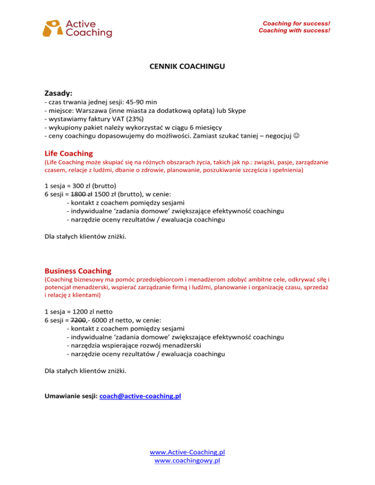 Coaching for success! Coaching with success! CENNIK COACHINGU Zasady: - czas trwania jednej sesji: 45-90 min - miejsce: Warszawa (inne miasta za dodatkową opłatą) lub Skype - wystawiamy faktury VAT (23%) - wykupiony pakiet należy wykorzystać w ciągu 6 miesięcy - ceny coachingu dopasowujemy do możliwości. Zamiast szukać taniej – negocjuj Life Coaching (Life Coaching może skupiać się na różnych obszarach życia, takich jak np.: związki, pasje, zarządzanie czasem, relacje z ludźmi, dbanie o zdrowie, planowanie, poszukiwanie szczęścia i spełnienia) 1 sesja = 300 zl (brutto) 6 sesji = 1800 zł 1500 zł (brutto), w cenie: - kontakt z coachem pomiędzy sesjami - indywidualne ‘zadania domowe’ zwiększające efektywność coachingu - narzędzie oceny rezultatów / ewaluacja coachingu Dla stałych klientów zniżki. Business Coaching (Coaching biznesowy ma pomóc przedsiębiorcom i menadżerom zdobyć ambitne cele, odkrywać siłę i potencjał menadżerski, wspierać zarządzanie firmą i ludźmi, planowanie i organizację czasu, sprzedaż i relację z klientami) 1 sesja = 1200 zl netto 6 sesji = 7200,- 6000 zł netto, w cenie: - kontakt z coachem pomiędzy sesjami - indywidualne ‘zadania domowe’ zwiększające efektywność coachingu - narzędzia wspierające rozwój menadżerski - narzędzie oceny rezultatów / ewaluacja coachingu Dla stałych klientów zniżki. Umawianie sesji: [email protected] www.Active-Coaching.pl www.coachingowy.pl
