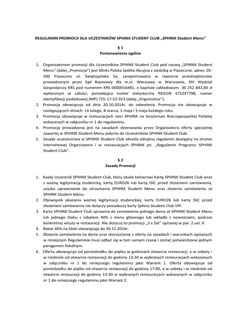 REGULAMIN PROMOCJI DLA UCZESTNIKÓW SPHINX STUDENT CLUB „SPHINX Student Menu” §1 Postanowienia ogólne 1. Organizatorem promocji dla Uczestników SPHINX Student Club pod nazwą „SPHINX Student Menu” (dalej „Promocja”) jest Sfinks Polska Spółka Akcyjna z siedzibą w Piasecznie, adres: 05500 Piaseczno ul. Świętojańska 5a, zarejestrowana w rejestrze przedsiębiorców prowadzonym przez Sąd Rejonowy dla m.st. Warszawy w Warszawie, XIV Wydział Gospodarczy KRS pod numerem KRS 0000016481, o kapitale zakładowym 30 252 842,00 zł wpłaconym w całości, posiadająca numer statystyczny REGON 472247798, numer identyfikacji podatkowej (NIP) 725-17-52-913 (dalej „Organizator”). 2. Promocja obowiązuje od dnia 20.10.2014r. do odwołania. Promocja nie obowiązuje w następujących dniach: 14 lutego, 8 marca, 1 maja i 3 maja każdego roku. 3. Promocja obowiązuje w restauracjach sieci SPHINX na terytorium Rzeczypospolitej Polskiej wskazanych w załączniku nr 1 do regulaminu. 4. Promocja prowadzona jest na zasadach skierowania przez Organizatora oferty specjalnej zawartej w SPHINX Student Menu jedynie do Uczestników SPHINX Student Club. 5. Zasady uczestnictwa w SPHINX Student Club określa odrębny regulamin dostępny na stronie internetowej Organizatora i w restauracjach SPHINX pn. „Regulamin Programu SPHINX Student Club”. §2 Zasady Promocji 1. Każdy Uczestnik SPHINX Student Club, który okaże kelnerowi Kartę SPHINX Student Club wraz z ważną legitymacją studencką, kartą EURO26 lub kartą ISIC przed złożeniem zamówienia, uzyska uprawnienie do otrzymania SPHINX Student Menu oraz złożenia zamówienia ze SPHINX Student Menu. 2. Obowiązek okazania ważnej legitymacji studenckiej, karty EURO26 lub karty ISIC przed złożeniem zamówienia nie dotyczy posiadaczy karty Sphinx Student Club VIP. 3. Karta SPHINX Student Club uprawnia do zamówienia jednego dania ze SPHINX Student Menu lub jednego Steku z rabatem 40% z menu głównego lub wkładki z nowościami, podczas konkretnej wizyty w restauracji. Nie dotyczy to promocji „3 x Zet” opisanej w par. 2 ust. 6 4. Rabat 40% na Steki obowiązuję do 30.11.2016r. 5. Złożenie zamówienia na danie oraz skorzystanie z oferty na zasadach i warunkach opisanych w niniejszym Regulaminie musi odbyć się w tym samym czasie i zostać potwierdzone jednym paragonem fiskalnym. 6. Oferta obowiązuje od poniedziałku do piątku w godzinach otwarcia restauracji, a w soboty i w niedziele od otwarcia restauracji do godziny 13:30 w wybranych restauracjach wskazanych w załączniku nr 1 do niniejszego regulaminu jako Wariant 1. Oferta obowiązuje od poniedziałku do piątku od otwarcia restauracji do godziny 17:00, a w soboty i w niedziele od otwarcia restauracji do godziny 13:30 w wybranych restauracjach wskazanych w załączniku nr 1 do niniejszego regulaminu jako Wariant 2. 7. Promocja „3 x Zet” umożliwia zamówienie łącznie lub oddzielnie pozycji i/lub otrzymanie rabatu: - Kawa na wynos, Rockstar, crème brulee w promocyjnej cenie 3,99 zł brutto - Rabat 40% na wszystkie napoje alkoholowe i bezalkoholowe. 8. Promocja w zakresie sprzedaży i spożywania alkoholu skierowana jest tylko do osób pełnoletnich i niebędących pod wpływem alkoholu. 9. Klientowi nie przysługują jakiekolwiek roszczenia w związku z nieskorzystaniem z Promocji, nie zgłoszeniem kelnerowi przed złożeniem zamówienia chęci skorzystania z Promocji, a w szczególności roszczenie o otrzymanie ekwiwalentu pieniężnego rabatu. §3 Postanowienia końcowe 1. Niniejszy Regulamin będzie udostępniany wszystkim zainteresowanym na stronie www.sphinx.pl, w restauracjach objętych Promocją oraz w siedzibie Organizatora. 2. W sprawach nieuregulowanych niniejszym Regulaminem stosuje się przepisy Kodeksu Cywilnego oraz inne powszechnie obowiązujące przepisy prawa. 3. Ze względu na nieokreślony czas trwania Promocji, Organizator zastrzega sobie prawo do dokonywania zmian w Regulaminie. Informacja o zmianie Regulaminu zostanie zamieszczona na stronie internetowej www.sphinx.pl. Zmiany będą wchodzić w życie po upływie 14 dni kalendarzowych od daty ogłoszenia o zmianie. W przypadku uprawnień nabytych przed dniem wejścia w życie zmian, ich realizacja następuje na zasadach dotychczas obowiązujących. 4. Organizator poinformuje o zakończeniu Promocji na stronie internetowej Organizatora z 14dniowym wyprzedzeniem. Wersja z dnia 05.11.2016r Załącznik nr 1 Restauracja Adres Obowiązywanie STUDENT MENU Białogard CH Hosso 78-200 Białogard, pl. Wolności 10a WARIANT 1 Białystok Alfa 15-277 Białystok, ul. Świętojańska 15 WARIANT 1 Bydgoszcz 85-111 Bydgoszcz, ul. Magdzińskiego 18 WARIANT 1 Bydgoszcz CH Zielone Arkady 85-171 Bydgoszcz, Al. Wojska Polskiego 1 WARIANT 1 Bytom 41-902 Bytom, ul. Moniuszki 11 WARIANT 1 Czeladź CH M1 41-250 Czeladź, ul. Będzińska 80, CH "M1" WARIANT 1 Częstochowa 42-200 Częstochowa, Al. Kościuszki 1 WARIANT 1 Gdańsk CH Alfa 80-391 Gdańsk, ul. Kołobrzeska 41c WARIANT 1 Gdańsk CH Madisson 80-850 Gdańsk, ul. Rajska 10 WARIANT 2 Gdańsk CH Manhattan 80-252 Gdańsk-Wrzeszcz, ul. Grunwaldzka 82, "MANHATTAN" WARIANT 1 Gdańsk CH Matarnia 80-298 Gdańsk, ul. Złota Karczma 26/19 WARIANT 1 Gdańsk Długi Targ 80-830 Gdańsk, Długi Targ 31/32 WARIANT 2 Gdynia CH Batory 81-301 Gdynia, ul. 10 Lutego 11 WARIANT 1 Gliwice CH Arena 44-100 Gliwice, ul. J. Nowaka - Jeziorańskiego 1 WARIANT 1 Gniezno 62-200 Gniezno, ul. Rynek 7 WARIANT 1 Gorzów Wielkopolski CH Askana 66-400 Gorzów Wielkopolski, Al. Konstytucji 3-go Maja 102 WARIANT 1 Gorzów Wielkopolski Nova Park 66-400 Gorzów Wielkopolski Przemysłowa 2 WARIANT 1 Gryfice CH Hosso 78-300 Gryfice, ul. Wojska Polskiego 44 WARIANT 1 Kalisz 62-800 Kalisz, ul. Środmiejska 16 WARIANT 1 Katowice CH Silesia 40-101 Katowice, ul.Chorzowska 107 WARIANT 1 Katowice korfantego 40-005 Katowice ul. Korfantego 5 WARIANT 1 Kielce CH Korona 25-312 Kielce, ul. Warszawska 26, WARIANT 1 Kielc