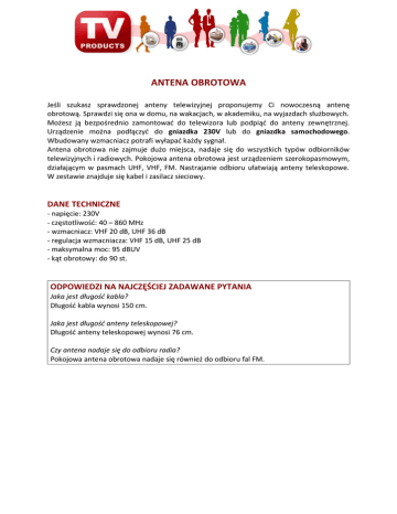 ANTENA OBROTOWA Jeśli szukasz sprawdzonej anteny telewizyjnej proponujemy Ci nowoczesną antenę obrotową. Sprawdzi się ona w domu, na wakacjach, w akademiku, na wyjazdach służbowych. Możesz ją bezpośrednio zamontować do telewizora lub podpiąć do anteny zewnętrznej. Urządzenie można podłączyć do gniazdka 230V lub do gniazdka samochodowego. Wbudowany wzmacniacz potrafi wyłapać każdy sygnał. Antena obrotowa nie zajmuje dużo miejsca, nadaje się do wszystkich typów odbiorników telewizyjnych i radiowych. Pokojowa antena obrotowa jest urządzeniem szerokopasmowym, działającym w pasmach UHF, VHF, FM. Nastrajanie odbioru ułatwiają anteny teleskopowe. W zestawie znajduje się kabel i zasilacz sieciowy. DANE TECHNICZNE - napięcie: 230V - częstotliwość: 40 – 860 MHz - wzmacniacz: VHF 20 dB, UHF 36 dB - regulacja wzmacniacza: VHF 15 dB, UHF 25 dB - maksymalna moc: 95 dBUV - kąt obrotowy: do 90 st. ODPOWIEDZI NA NAJCZĘŚCIEJ ZADAWANE PYTANIA Jaka jest długość kabla? Długość kabla wynosi 150 cm. Jaka jest długość anteny teleskopowej? Długość anteny teleskopowej wynosi 76 cm. Czy antena nadaje się do odbioru radia? Pokojowa antena obrotowa nadaje się również do odbioru fal FM.