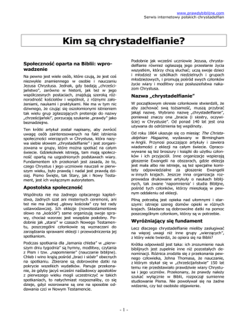 www.prawdybiblijne.com Serwis internetowy polskich chrystadelfian Kim są chrystadelfianie? Podobnie jak wcześni uczniowie Jezusa, chrystadelfianie również ogłaszają jego przesłanie życia wszystkim, którzy chcą słuchać; uczą swoje dzieci i młodzież w szkółkach niedzielnych i grupach młodzieżowych, i promują pośród swych członków życie wiary i modlitwy oraz posłuszeństwa nakazom Chrystusa. Społeczność oparta na Biblii: wprowadzenie Na pewno jest wiele osób, które czują, że jest coś niezwykle znamiennego w osobie i nauczaniu Jezusa Chrystusa. Jednak, gdy badają „chrześcijaństwo”, zarówno w historii, jak też w jego współczesnych postaciach, znajdują szeroką różnorodność kościołów i wspólnot, z różnymi założeniami, naukami i praktykami. Nie ma w tym nic dziwnego, że czując się oszołomionymi istnieniem tak wielu grup zgłaszających pretensje do nazwy „chrześcijański”, porzucają szukanie „prawdy” jako beznadziejne. Nazwa „chrystadelfianie” W początkowym okresie członkowie stwierdzili, że aby zachować swą tożsamość, muszą przybrać jakąś nazwę. Wybrano nazwę „chrystadelfianie”, ponieważ znaczy ona „bracia (i siostry, oczywiście) w Chrystusie”. Od ponad 140 lat jest ona używana do odróżnienia tej wspólnoty. Ten krótki artykuł został napisany, aby zwrócić uwagę osób zainteresowanych na fakt istnienia społeczności wierzących w Chrystusa, która nazywa siebie słowem „chrystadelfianie” i jest zorganizowana w grupy, które można spotkać na całym świecie. Gdziekolwiek istnieją, tam mają społeczność opartą na uzgodnionych podstawach wiary. Fundamentem ich przekonań jest zasada, że to, czego Chrystus i jego uczniowie nauczali w pierwszym wieku, było prawdą i nadal jest prawdą dzisiaj. Pismo Święte, tak Stary, jak i Nowy Testament, jest ich wyłącznym autorytetem. Od roku 1864 ukazuje się co miesiąc The Christadelphian Magazine, wydawany w Birmingham w Anglii. Przynosi pouczające artykuły i zawiera wiadomości z eklezji na całym świecie. Opracowywane są też broszury i książki do użytku członków i ich przyjaciół. Inne organizacje wspierają głoszenie Ewangelii na obszarach, gdzie eklezja jest mała albo nie istnieje, są też specjalne komitety odpowiedzialne za głoszenie Ewangelii w innych krajach. Jeszcze inna organizacja rozprowadza drukowane artykuły o naukach biblijnych, tak zwane ‘napomnienia’ i studia Biblijne, pośród tych członków, którzy mieszkają w pewnym oddaleniu od eklezji. Apostolska społeczność Wspólnota nie ma żadnego opłacanego kapłaństwa, żadnych szat ani misternych ceremonii, ani też nie ma żadnej „głowy kościoła” czy też rady ustawodawczej. Ich eklezje (nowotestamentowe słowo na „kościół”) same organizują swoje sprawy, chociaż wzorzec jest wszędzie podobny. Podobnie jak „starsi” w czasach Nowego Testamentu, poszczególni członkowie są wyznaczani do zarządzania sprawami eklezji i przewodniczenia jej spotkaniom. Pilną potrzebą jest opieka nad ułomnymi i starszymi: istnieje szereg domów opieki w różnych krajach. Składane są dobrowolne datki na pomoc poszczególnym członkom, którzy są w potrzebie. Wyróżniający się fundament Lecz dlaczego chrystadelfianie mieliby zasługiwać na więcej uwagi niż inne grupy „wierzących”, z który wiele twierdzi, że opiera się na Biblii? Podczas spotkania dla „łamania chleba” w „pierwszym dniu tygodnia” są hymny, modlitwy, czytania z Pism i tzw. „napomnienie” (nauczanie biblijne). Chleb i wino krążą pośród „braci i sióstr” obecnych na spotkaniu. Zbierane są dobrowolne datki na pokrycie wszelkich wydatków. Panuje przekonanie, że gdyby jacyś wcześni naśladowcy apostołów z pierwszego wieku mogli uczestniczyć w takich spotkaniach, to natychmiast rozpoznaliby, co się dzieje, gdyż wzorowane są one na sposobie oddawania czci w Nowym Testamencie. Krótka odpowiedź jest taka: ich zrozumienie nauk biblijnych jest zupełnie inne niż pozostałych denominacji. Różnica zrodziła się z przekonania pewnego człowieka, Johna Thomasa, że nauczanie, z którym stykał się w „chrześcijaństwie” 150 lat temu nie przedstawiało prawdziwie wiary Chrystusa i jego uczniów. Przekonany, że prawdy należy szukać wyłącznie w Biblii, rozpoczął sumienne studiowanie Pisma. Nie powoływał się na żadne widzenie, czy też osobiste objawienie. -1- www.prawdybiblijne.com Serwis internetowy polskich chrystadelfian Ostatecznie doszedł do rozumienia „dobrej nowiny o królestwie Bożym i o imieniu Jezusa Chrystusa” (Dzieje Apostolskie 8,12, Biblia Warszawska), które różniło się w szeregu ważnych punktach od rozumienia kościołów i innych sekt religijnych. Jego prace zyskały poparcie innych, którzy byli przekonani o słuszności jego wniosków. To rozumienie Biblii jest od 150 lat poddawane rygorystycznym próbom wolnych dociekań. Dzisiejsze charakterystyczne poglądy chrystadelfian są rezultatem tego procesu. ostatecznym celem wobec rasy ludzkiej. Świętość i prawda to Jego atrybuty; u Niego nie może być żadnego podstępu ani fałszu, ani też nie może On odnosić się z obojętnością do uporczywego buntu ludzkości. A jednak opisuje Siebie jako Boga, który jest „miłosierny i litościwy, cierpliwy, bogaty w łaskę i wierność […] przebaczający niegodziwość, niewierność, grzech, lecz nie pozostawiający go bez ukarania” (Księga Wyjścia 34,6-7). To jest portret Odwiecznego Stworzyciela, Istoty o najwyższej moralności, lecz także Ojca tych, którzy szukają Go zgodnie z Jego Słowem. I to właśnie w tym Słowie – w Biblii – można się o Nim uczyć. Cała Biblia Jakie jest przesłanie Biblii i dlaczego różni się od popularnych idei „chrześcijańskich”? Ziemia: też istotna Różnica wynika z ważnej zasady, że Biblia musi być rozumiana jako całość. Łatwo jest