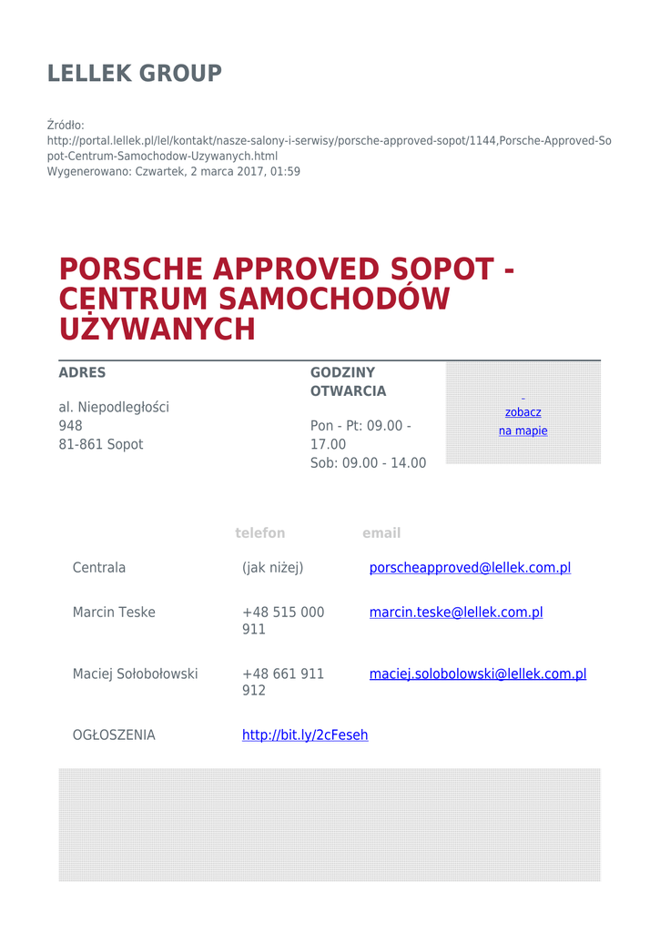 LELLEK GROUP Źródło: http://portal.lellek.pl/lel/kontakt/nasze-salony-i-serwisy/porsche-approved-sopot/1144,Porsche-Approved-So pot-Centrum-Samochodow-Uzywanych.html Wygenerowano: Czwartek, 2 marca 2017, 01:59 PORSCHE APPROVED SOPOT CENTRUM SAMOCHODÓW UŻYWANYCH ADRES GODZINY OTWARCIA al. Niepodległości 948 81-861 Sopot Pon - Pt: 09.00 17.00 Sob: 09.00 - 14.00 telefon zobacz na mapie email Centrala (jak niżej) [email protected] Marcin Teske +48 515 000 911 [email protected] Maciej Sołobołowski +48 661 911 912 [email protected] OGŁOSZENIA http://bit.ly/2cFeseh zobacz wnętrze Tweetnij