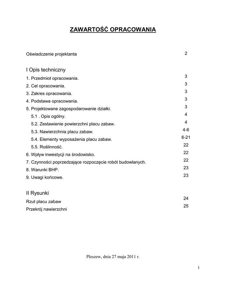 ZAWARTOŚĆ OPRACOWANIA 2 Oświadczenie projektanta I Opis techniczny 1. Przedmiot opracowania. 3 2. Cel opracowania. 3 3. Zakres opracowania. 3 4. Podstawa opracowania. 3 5. Projektowane zagospodarowanie działki. 3 5.1 . Opis ogólny. 4 5.2. Zestawienie powierzchni placu zabaw. 4 5.3. Nawierzchnia placu zabaw. 4-6 5.4. Elementy wyposażenia placu zabaw. 6-21 22 5.5. Roślinność. 6. Wpływ inwestycji na środowisko. 22 7. Czynności poprzedzające rozpoczęcie robót budowlanych. 22 8. Warunki BHP. 23 9. Uwagi końcowe. 23 II Rysunki 24 Rzut placu zabaw 25 Przekrój nawierzchni Pleszew, dnia 27 maja 2011 r. 1 OŚWIADCZENIE Zgodnie z art. 20 ust. 4 z dnia 07 lipca 1994 r. Prawo budowlane ( tekst jednolity Dz.U. z 2003 r. Nr 207, poz. 2016 ze zmianami) niniejszym oświadczam, że projekt budowlany : „BUDOWA PLACU ZABAW, PRZY ZESPOLE SZKÓŁ W CHOCZU O POWIERZCHNI 500 m 2 ” położonego na działce nr 306/1 w Choczu ul. M. Konopnickiej 6, wykonany dla Zespołu Szkół w Choczu ul. Marii Konopnickiej 6, został sporządzony zgodnie z obowiązującymi przepisami oraz zasadami wiedzy technicznej. I Opis techniczny 2 1. Przedmiot opracowania. Przedmiotem niniejszego opracowania jest projekt budowy placu zabaw przy Zespole Szkól w Choczu. 2. Cel opracowania. Celem opracowania jest stworzenie placu zabaw przy Zespole Szkól w Choczu o powierzchni 500 m2 zlokalizowanego na terenie szkoły. 3. Zakres opracowania. Zakres opracowania obejmuje: opis techniczny, plan sytuacyjno – wysokościowy, rzut placu zabaw, przekrój nawierzchni. 4. Podstawa opracownia. zlecenie inwestora, szczegółowe wytyczne rządowego programu „Radosna Szkoła”, uzgodnienia z inwestorem i międzybranżowe, norma PN-EN 1176-1 „Wyposażżżżżżenie placów zabaw i nawierzchnie”, norma PN-EN 1177 „Nawierzchnie placów zabaw amortyzujące upadki”, obowiązujące przepisy literatura fachowa. 5. Projektowane zagospodarowanie działki. 3 5.1. Opis ogólny. 5.2. Zestawienie powierzchni placu zabaw. powierzchnia placu zabaw 500,0 m 2 powierzchnia nawierzchni w kolorze pomarańczowym 236,0 m2 powierzchnia nawierzchni w kolorze niebieskim powierzchnia terenu zielonego 48,0 m2 216,0 m 2 5.3. Nawierzchnia placu zabaw. Projektuje się nawierzchnię placu zabaw składającą się z następujących warstw: podsypka piaskowa, warstwa tłucznia kamiennego, warstwa wyrównawcza z betonu, nawierzchnia amortyzująca. 5.3.1. Podbudowa dla gruntów spoistych i niespoistych. Zaprojektowano podbudowę mineralną, piaskowo-tłuczniową. Składająca się z 15 cm warstwy piasku, następnie 15 – 20 cm warstwy tłucznia kamiennego i 5 cm warstwy klińca. Grubość warstwy tłucznia kamiennego jest uzależniona od grubości warstwy amortyzującej nawierzchni z kauczuku SBR. Dla każdego urządzenia wartość ta jest inna w związku z tym inna jest grubość podbudowy. 5.3.2. Obrzeża. 4 Całość projektowanej strefy bezpieczeństwa urządzeń pokrytej nawierzchnią syntetyczną należy oddzielić od pozostałej części placu obrzeżem betonowym o wymiarach 30x6 cm posadowionym na ławie betonowej – zalecane są obrzeża bezpieczne z tworzywa. 5.3.3. Nawierzchnia amortyzująca – „pomarańczowa”. Zastosowana powierzchnia powinna spełniać wymagania normy PN EN 1177dotyczącej placów zabaw. Powierzchnie placu należy pokryć syntetyczną, wodoprzepuszczalną, bez spoinową, nawierzchniąąą FLEXI-STEP EPDM grubość nawierzchni uzależniona od wysokości swobodnego upadku (HIC) podawanej przez producenta urządzeń placu zabaw. Wartość ta jest różna dla poszczególnych urządzeń, w związku z tym różna jest tez grubość nawierzchni. Górna warstwa (bezpieczna) zbudowana jest z elastomeru EPDM i charakteryzuje się odpornością na warunki atmosferyczne, odpornością na działanie wody, dobrymi właściwościami na działanie wysokich temperatur do +110O C i elastycznością w niskich temperaturach do –40oC, wysoką odpornością mechaniczną. Grubość tej warstwy wynosi od 45 do 60 mm. Kolor nawierzchni zgodny z PANTONE:125 C, RAL: 2011 – Tieforange. 5.3.4. Nawierzchnia typu tartan – „niebieska”. Powierzchni ę bezpieczeństwa placu zabaw urządzeń niebędącą należy pokryć terenem zielonym nawierzchnią o ani strefą analogicznej charakterystyce jak nawierzchnia amortyzująca, ale o grubości całkowitej 40mm, składającą się z warstwy amortyzującej EPDM 45 mm. Kolor nawierzchni zgodny z PANTONE: 540 C, RAL: 5003 – Saphirblau. 5 Podbudowa analogiczna jak dla nawierzchni amortyzującej. 5.3.5. Grubość nawierzchni syntetycznej w odniesieniu do wysokości swobodnego upadku. Wysokość swobodnego upadku Grubość nawierzchni bezpiecznej 1,5 m 45 mm 2,0 m 60 mm 5.4. Elementy wyposażenia placu zabaw. 5.4.1. Opis programu „Radosna Szkoła” Zgodnie z wytycznymi MEN dotyczącymi urządzenia placu zabaw w ramach programu „Radosna Szkoła” (uchwała z dnia 7 lipca 2009 roku) szkolny plac zabaw ma: „umożliwić młodszym dzieciom podejmowanie aktywności fizycznej w sposób pozwalający rozładować napięcia emocjonalne i fizyczne, wynikające z możliwego ograniczenia spontanicznej aktywności w trakcie zajęć prowadzonych w klasach. Szkolny plac zabaw powinien być przygotowany do prowadzenia z dziećmi różnych form zajęć ruchowych (na przykład pokonywania przeszkód, wspinania, czworakowania, przeskoków, przeplotów czy zwisów). Dogodnym miejscem usytuowania szkolnego placu zabaw może być sąsiedztwo boiska lub bieżni, które mogą być wykorzystywane do prowadzenia zabaw i gier ruchowych. Powinien być także wyposażony w różnorodne drabinki, drążki, ścianki wspinaczkowe, pomosty, zjeżdżalnie, równoważnie, przeplotnie oraz kolorowe huśtawki. Plac zabaw urządzony przez szkołę powinien być bezpieczny. Ważne jest zastosowanie nowoczesnej, bezpiecznej nawierzchni pod urządzeniami, właściwe rozmieszczenie sprzętu znajdującego się na placu zabaw oraz przyja