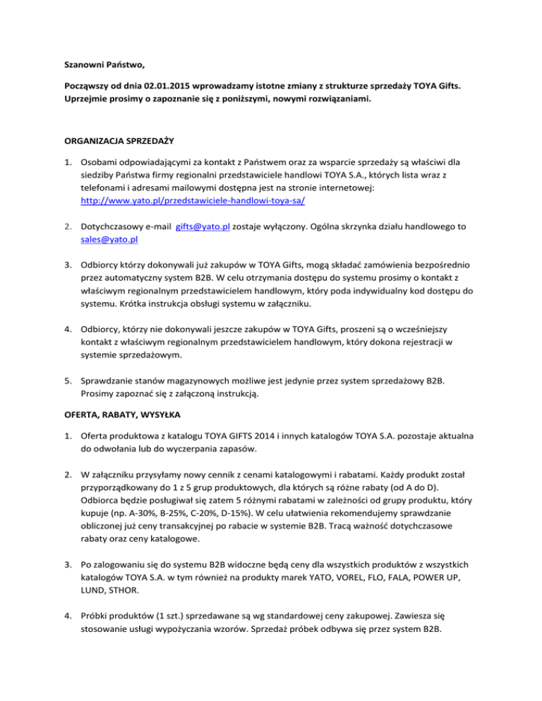 Szanowni Państwo, Począwszy od dnia 02.01.2015 wprowadzamy istotne zmiany z strukturze sprzedaży TOYA Gifts. Uprzejmie prosimy o zapoznanie się z poniższymi, nowymi rozwiązaniami. ORGANIZACJA SPRZEDAŻY 1. Osobami odpowiadającymi za kontakt z Państwem oraz za wsparcie sprzedaży są właściwi dla siedziby Państwa firmy regionalni przedstawiciele handlowi TOYA S.A., których lista wraz z telefonami i adresami mailowymi dostępna jest na stronie internetowej: http://www.yato.pl/przedstawiciele-handlowi-toya-sa/ 2. Dotychczasowy e-mail [email protected] zostaje wyłączony. Ogólna skrzynka działu handlowego to [email protected] 3. Odbiorcy którzy dokonywali już zakupów w TOYA Gifts, mogą składać zamówienia bezpośrednio przez automatyczny system B2B. W celu otrzymania dostępu do systemu prosimy o kontakt z właściwym regionalnym przedstawicielem handlowym, który poda indywidualny kod dostępu do systemu. Krótka instrukcja obsługi systemu w załączniku. 4. Odbiorcy, którzy nie dokonywali jeszcze zakupów w TOYA Gifts, proszeni są o wcześniejszy kontakt z właściwym regionalnym przedstawicielem handlowym, który dokona rejestracji w systemie sprzedażowym. 5. Sprawdzanie stanów magazynowych możliwe jest jedynie przez system sprzedażowy B2B. Prosimy zapoznać się z załączoną instrukcją. OFERTA, RABATY, WYSYŁKA 1. Oferta produktowa z katalogu TOYA GIFTS 2014 i innych katalogów TOYA S.A. pozostaje aktualna do odwołania lub do wyczerpania zapasów. 2. W załączniku przysyłamy nowy cennik z cenami katalogowymi i rabatami. Każdy produkt został przyporządkowany do 1 z 5 grup produktowych, dla których są różne rabaty (od A do D). Odbiorca będzie posługiwał się zatem 5 różnymi rabatami w zależności od grupy produktu, który kupuje (np. A-30%, B-25%, C-20%, D-15%). W celu ułatwienia rekomendujemy sprawdzanie obliczonej już ceny transakcyjnej po rabacie w systemie B2B. Tracą ważność dotychczasowe rabaty oraz ceny katalogowe. 3. Po zalogowaniu się do systemu B2B widoczne będą ceny dla wszystkich produktów z wszystkich katalogów TOYA S.A. w tym również na produkty marek YATO, VOREL, FLO, FALA, POWER UP, LUND, STHOR. 4. Próbki produktów (1 szt.) sprzedawane są wg standardowej ceny zakupowej. Zawiesza się stosowanie usługi wypożyczania wzorów. Sprzedaż próbek odbywa się przez system B2B. 5. Wyceny specjalne wykraczające poza cenę wynikającą z przyznanego rabatu będą wykonywane przez regionalnych przedstawicieli handlowych dla zamówień o wartości co najmniej 25 000 zł netto. 6. Wyceny na towar sprowadzany na indywidualne zamówienie będą wykonywane przez regionalnych przedstawicieli handlowych dla zamówień o wartości co najmniej 30 000 zł netto. 7. Wszystkie wyceny wykonane w 2014 roku i nieposiadające odpowiedniej klauzuli tracą ważność. MAGAZYN, WYSYŁKA, REKLAMACJE 1. Zamówienia realizowane będą w zależności od obciążenia magazynu. Przy złożeniu zamówienia do godz. 13:00 wysyłka realizowana będzie kolejnego dnia roboczego. Nie ma możliwości wysyłki tego samego dnia. 2. Koszty przesyłki dla zamówienia o wartości poniżej 500 zł netto ulega obniżeniu do 13 zł netto. Powyżej 500 zł wartości zamówienia dostawa pozostaje bezpłatna. 3. Sprawy dotyczące innego adresu wysyłki oraz inne prośby związane dostawą towaru prosimy wpisywać w uwagach do zamówienia składanego przez system B2B. 4. Reklamacje dotyczące rozbieżności w dostawach prosimy wysyłać równolegle na poniższe adresy: e-mail właściwego regionalnego przedstawiciela handlowego [email protected] (dla rozbieżności w dostawach) [email protected] (dla spraw związanych z ustalaniem szczegółów transportu) ZNAKOWANIE 1. Zawieszone zostaje wykonywanie znakowania reklamowego. 2. Zainteresowanym odbiorcom na zapytanie udostępniamy listę zewnętrznych drukarni reklamowych i firm usługowych mających doświadczenie z znakowaniu towarów TOYA S.A.