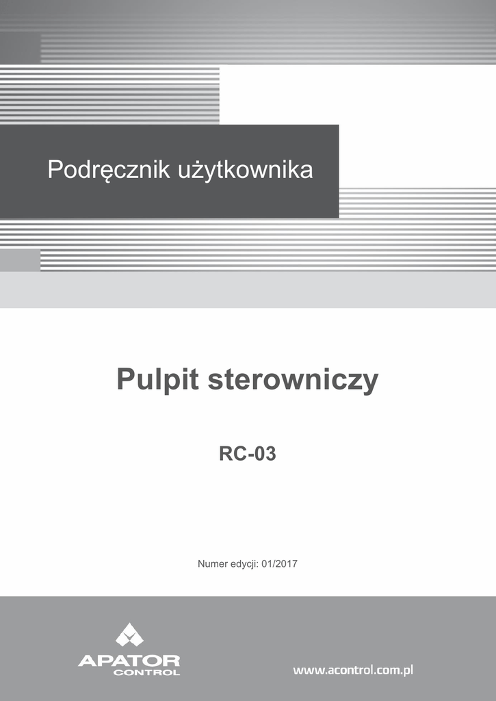 Dodatek A Podręcznik użytkownika Pulpit sterowniczy RC-03 Numer edycji: 01/2017 Dodatek A Informacje ogólne Producent nie ponosi odpowiedzialności za konsekwencje wynikające z niewłaściwej instalacji, użytkowania lub błędnych nastaw parametrów pracy, niewłaściwego dostosowania typu napędu do maszyny. Zakłada się, iż treść niniejszego Opisu technicznego jest poprawna w chwili zapoznawania się z nim. Ze względu na ciągły rozwój produktu oraz bieżące udoskonalenia, producent zastrzega sobie prawo do dokonywania zmian w specyfikacji produktu lub jego jakości, a także zmian w Opisie technicznym, bez pisemnego zawiadomienia. Zastrzeżenia Apator Control zastrzega sobie prawo do bieżącego dokonywania zmian w Opisie technicznym celem stałego podnoszenia jakości i przystępności zawartej w nim treści bez pisemnego uprzedzenia. Niniejsza polska wersja językowa Opisu technicznego stanowi własność intelektualną Apator Control i nie może być przedmiotem prezentacji publicznych, kopiowania częściowego lub całkowitego wszelkimi dostępnymi metodami, marketingu czy sprzedaży, dla osób trzecich oraz przedsiębiorstw, bez pisemnej zgody Apator Control, pod rygorem naruszenia praw autorskich. Apator Control Sp. z o.o. ul. Polna 148 87-100 Toruń www.acontrol.com.pl Dział Sprzedaży Dział Usług Serwisowych tel.: +48 56 654 49 24 tel.: +48 56 654 49 25 e-mail: [email protected] e-mail: [email protected] DEKLARACJA ZGODNOŚCI Niniejsze urządzenie elektroniczne przeznaczone jest do stosowania z odpowiednim silnikiem, sterownikiem, elementami zabezpieczeń elektrycznych i innym wyposażeniem, które tworzą kompletny produkt końcowy lub system. W związku z tym może być instalowane tylko przez wykwalifikowany personel, obeznany z wymaganiami bezpieczeństwa i kompatybilności elektromagnetycznej (EMC). Osoba instalująca urządzenie jest odpowiedzialna za zapewnienie zgodności wyrobu końcowego lub systemu z odpowiednimi przepisami obowiązującymi w kraju instalacji. RC-03 ZASTOSOWANIE Pulpity sterownicze RC-03 przeznaczone są do zdalnego sterowania funkcjonalnego przemienników częstotliwości serii AMD, ARR, COMMANDER oraz UNIDRIVE oferowanych przez firmę APATOR CONTROL. Pulpit sterowniczy wyposażony jest w łączniki funkcjonalnego sterowania, potencjometr regulacji obrotów silnika oraz czterocyfrowy wyświetlacz LCD do pomiaru procentowej wartości obrotów. Listwę zaciskową pulpitu należy połączyć z listwą zaciskową przemiennika, odpowiednio do posiadanego modelu. W załączonych tabelach podano odpowiednie ustawienia parametrów, które należy zaprogramować, aby zapewnić prawidłowe działanie pulpitu sterowniczego. W zależności od posiadanego modelu napędu należy także odpowiednio ustawić mikroprzełącznik umieszczony na obwodzie drukowanym pulpitu Precyzyjną kalibrację wartości zerowej oraz 100% wskazań miernika pomiaru obrotów można przeprowadzić przy pomocy potencjometrów umieszczonych na obwodzie drukowanym pulpitu. WARUNKI ŚRODOWISKOWE PRACY -10 +50 oC - Temperatura przechowywania - Temperatura pracy - Wilgotność względna 90 ( bez kondensacji ) - Stopień ochrony IP 54 - Pobór prądu przez wskaźnik cyfrowy oraz zadajnik 10mA - Napięcie zestyków łączników sterowania funkcjonalnego 24V DC 0 +50C ZALECENIA INSTALACYJNE - Przewody połączeniowe powinny być ekranowane i skręcane wewnątrz ekranu. - Przewody połączeniowe powinny być jak najkrótsze. - Przewody sterujące należy prowadzić oddzielnie od przewodów silnoprądowych. - Należy unikać równoległego prowadzenia przewodów sygnałowych i silnoprądowych. - Ekrany przewodów sterująco - sygnalizacyjnych należy podłączyć do masy układu jedynie po stronie napędu. RC-03 RC-03 40 50 30 70 20 80 10 0 LEWO PRAWO 60 90 100 JOG START STOP RESET RC-03 AMD-0002÷0045/RN523 oraz AMD-0011/RN223 Parametry P 00 P 01 P 38 P 41 P 44 AMD RC-03 AFM 1 Ustawienia parametrów d 01 d 01 d 01 d 03 90 ACM 2 AVI 3 +10V 4 Zaciski DCM 5 6 RST 7 FWD 8 REV 9 MI3 10 Uwaga: Mikroprzełącznik umieszczony na obwodzie drukowanym pulpitu RC-03 powinien być ustawiony w pozycji 10V. AMD-S Parametry 2-00 2-01 3-01 4-04 4-05 4-06 AMD-S RC-03 AFM 1 Ustawienia parametrów d1 d1 90 d2 d6 d 10 GND 2 AVI 3 +10V 4 Zaciski GND 5 6 M2 7 M0 8 M1 9 M3 10 Uwaga: Mikroprzełącznik umieszczony na obwodzie drukowanym pulpitu RC-03 powinien być ustawiony w pozycji 10V. RC-03 AMD-B Parametry 02-00 02-01 02-05 03-06 AMD-B RC-03 AFM 1 Ustawienia parametrów 01 01 01 90 ACM 2 AVI 3 +10V 4 Zaciski DCM 5 6 MI5 7 FWD 8 REV 9 JOG 10 Uwaga: Mikroprzełącznik umieszczony na obwodzie drukowanym pulpitu RC-03 powinien być ustawiony w pozycji 10V. AMD-F Parametry 02-00 02-01 02-05 03-12 AMD-F RC-03 AFM 1 Ustawienia parametrów 01 01 01 90 ACM 2 AVI 3 +10V 4 Zaciski DCM 5 6 MI5 7 FWD 8 REV 9 MI6 10 Uwaga: Mikroprzełącznik umieszczony na obwodzie drukowanym pulpitu RC-03 powinien być ustawiony w pozycji 10V. RC-03 AMD-M Parametry Pr.00 Pr.01 Pr.38 Pr.42 Pr.44 AMD-M RC-03 AFM 1 Ustawienia parametrów 01 01 01 09 90 GND 2 AVI 3 +10V 4 Zaciski GND 5 6 M2 7 M0 8 M1 9 M5 10 Uwaga: Mikroprzełącznik umieszczony na obwodzie drukowanym pulpitu RC-03 powinien być ustawiony w pozycji 10V. ARR Parametry F_001 F_002 ARR RC-03 FM+ 1 Ustawienia parametrów 1 0 GND 2 Vin 3 +12V 4 Zaciski COM 5 6 X6 7 FWD 8 REV 9 X3 10 Uwaga: Mikroprzełącznik umieszczony na obwodzie drukowanym pulpitu RC-03 powinien być ustawiony w pozycji 10V. RC-03 AMD-E Parametry 02.00 02.01 03.04 04.04 04.07 04.08 AFM 1 AMD-E RC-03 Ustawienia parametrów 1 1 ~95% 1 5 8 ACM 2 AVI 3 10V 4 Zaciski DCM 5 6 MI5 7 MI1 8 MI2 9 MI6 10 Uwaga: Mikroprzełącznik umieszczony na obwodzie drukowanym pulpitu RC-03 powinien być ustawiony w pozycji 10V. AMD-C, AMD-CP Parametry 00-20 00-21 02-00 02-01 02-02 03-00 03-21 AMD-CP RC-03 AFM1 1 Ustawienia parametrów 2 1 1 5 6 1 ~95% ACM 2 AVI(1) 3 +10V 4 Zaciski DCM 5 6 MI1 7 FWD 8 REV 9 MI2 10 Uwaga: Mik