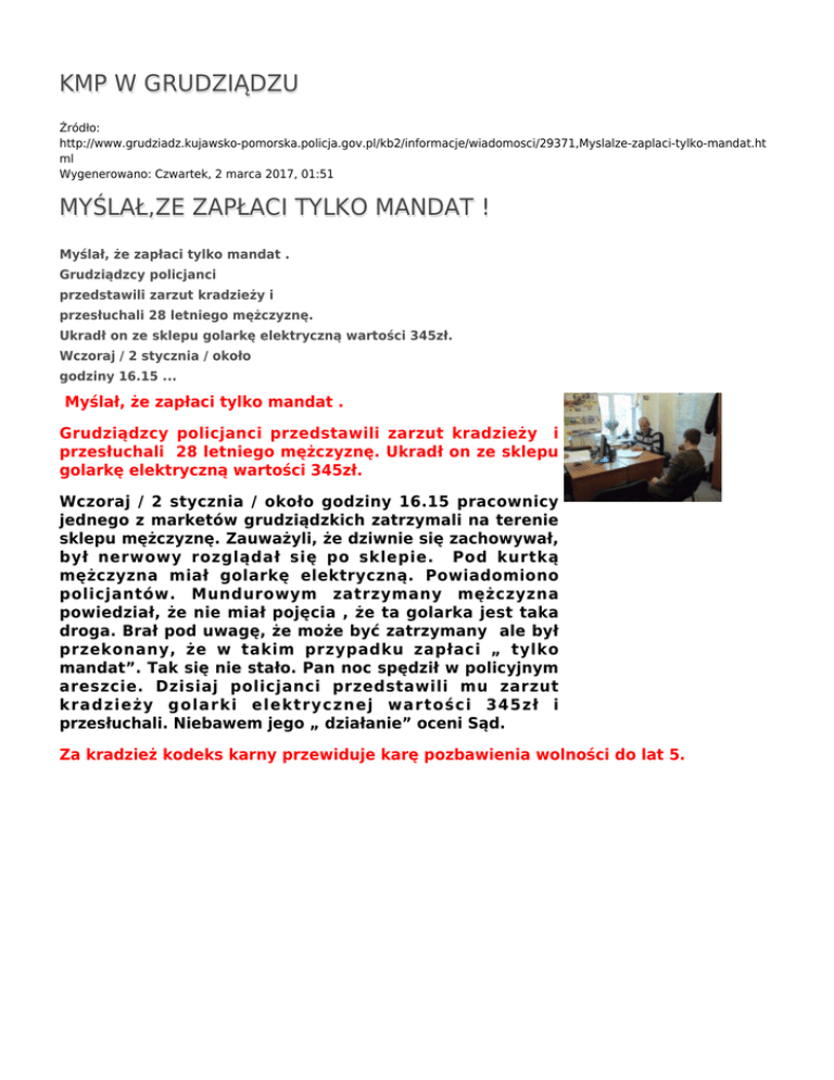 KMP W GRUDZIĄDZU Źródło: http://www.grudziadz.kujawsko-pomorska.policja.gov.pl/kb2/informacje/wiadomosci/29371,Myslalze-zaplaci-tylko-mandat.ht ml Wygenerowano: Czwartek, 2 marca 2017, 01:51 MYŚLAŁ,ZE ZAPŁACI TYLKO MANDAT ! Myślał, że zapłaci tylko mandat . Grudziądzcy policjanci przedstawili zarzut kradzieży i przesłuchali 28 letniego mężczyznę. Ukradł on ze sklepu golarkę elektryczną wartości 345zł. Wczoraj / 2 stycznia / około godziny 16.15 ... Myślał, że zapłaci tylko mandat . Grudziądzcy policjanci przedstawili zarzut kradzieży i przesłuchali 28 letniego mężczyznę. Ukradł on ze sklepu golarkę elektryczną wartości 345zł. Wczoraj / 2 stycznia / około godziny 16.15 pracownicy jednego z marketów grudziądzkich zatrzymali na terenie sklepu mężczyznę. Zauważyli, że dziwnie się zachowywał, był nerwowy rozglądał się po sklepie. Pod kurtką mężczyzna miał golarkę elektryczną. Powiadomiono policjantów. Mundurowym zatrzymany mężczyzna powiedział, że nie miał pojęcia , że ta golarka jest taka droga. Brał pod uwagę, że może być zatrzymany ale był przekonany, że w takim przypadku zapłaci „ tylko mandat”. Tak się nie stało. Pan noc spędził w policyjnym areszcie. Dzisiaj policjanci przedstawili mu zarzut kradzieży golarki elektrycznej wartości 345zł i przesłuchali. Niebawem jego „ działanie” oceni Sąd. Za kradzież kodeks karny przewiduje karę pozbawienia wolności do lat 5. Autor: M_Solochewicz Publikacja: M_Solochewicz Ocena: 0/5 (0) Tweetnij