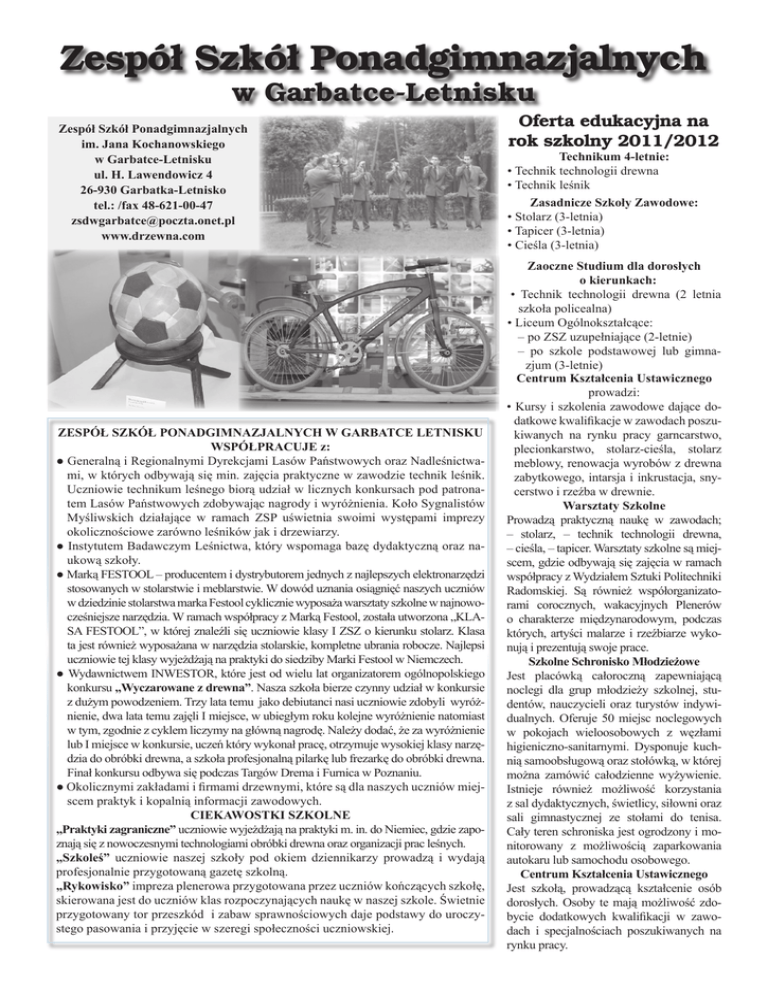 Zespół Szkół Ponadgimnazjalnych w Garbatce-Letnisku Zespół Szkół Ponadgimnazjalnych im. Jana Kochanowskiego w Garbatce-Letnisku ul. H. Lawendowicz 4 26-930 Garbatka-Letnisko tel.: /fax 48-621-00-47 [email protected] www.drzewna.com ZESPÓŁ SZKÓŁ PONADGIMNAZJALNYCH W GARBATCE LETNISKU WSPÓŁPRACUJE z: ● Generalną i Regionalnymi Dyrekcjami Lasów Państwowych oraz Nadleśnictwami, w których odbywają się min. zajęcia praktyczne w zawodzie technik leśnik. Uczniowie technikum leśnego biorą udział w licznych konkursach pod patronatem Lasów Państwowych zdobywając nagrody i wyróżnienia. Koło Sygnalistów Myśliwskich działające w ramach ZSP uświetnia swoimi występami imprezy okolicznościowe zarówno leśników jak i drzewiarzy. ● Instytutem Badawczym Leśnictwa, który wspomaga bazę dydaktyczną oraz naukową szkoły. ● Marką FESTOOL – producentem i dystrybutorem jednych z najlepszych elektronarzędzi stosowanych w stolarstwie i meblarstwie. W dowód uznania osiągnięć naszych uczniów w dziedzinie stolarstwa marka Festool cyklicznie wyposaża warsztaty szkolne w najnowocześniejsze narzędzia. W ramach współpracy z Marką Festool, została utworzona „KLASA FESTOOL”, w której znaleźli się uczniowie klasy I ZSZ o kierunku stolarz. Klasa ta jest również wyposażana w narzędzia stolarskie, kompletne ubrania robocze. Najlepsi uczniowie tej klasy wyjeżdżają na praktyki do siedziby Marki Festool w Niemczech. ● Wydawnictwem INWESTOR, które jest od wielu lat organizatorem ogólnopolskiego konkursu „Wyczarowane z drewna”. Nasza szkoła bierze czynny udział w konkursie z dużym powodzeniem. Trzy lata temu jako debiutanci nasi uczniowie zdobyli wyróżnienie, dwa lata temu zajęli I miejsce, w ubiegłym roku kolejne wyróżnienie natomiast w tym, zgodnie z cyklem liczymy na główną nagrodę. Należy dodać, że za wyróżnienie lub I miejsce w konkursie, uczeń który wykonał pracę, otrzymuje wysokiej klasy narzędzia do obróbki drewna, a szkoła profesjonalną pilarkę lub frezarkę do obróbki drewna. Finał konkursu odbywa się podczas Targów Drema i Furnica w Poznaniu. ● Okolicznymi zakładami i firmami drzewnymi, które są dla naszych uczniów miejscem praktyk i kopalnią informacji zawodowych. CIEKAWOSTKI SZKOLNE „Praktyki zagraniczne” uczniowie wyjeżdżają na praktyki m. in. do Niemiec, gdzie zapoznają się z nowoczesnymi technologiami obróbki drewna oraz organizacji prac leśnych. „Szkoleś” uczniowie naszej szkoły pod okiem dziennikarzy prowadzą i wydają profesjonalnie przygotowaną gazetę szkolną. „Rykowisko” impreza plenerowa przygotowana przez uczniów kończących szkołę, skierowana jest do uczniów klas rozpoczynających naukę w naszej szkole. Świetnie przygotowany tor przeszkód i zabaw sprawnościowych daje podstawy do uroczystego pasowania i przyjęcie w szeregi społeczności uczniowskiej. Oferta edukacyjna na rok szkolny 2011/2012 Technikum 4-letnie: • Technik technologii drewna • Technik leśnik Zasadnicze Szkoły Zawodowe: • Stolarz (3-letnia) • Tapicer (3-letnia) • Cieśla (3-letnia) Zaoczne Studium dla dorosłych o kierunkach: • Technik technologii drewna (2 letnia szkoła policealna) • Liceum Ogólnokształcące: – po ZSZ uzupełniające (2-letnie) – po szkole podstawowej lub gimnazjum (3-letnie) Centrum Kształcenia Ustawicznego prowadzi: • Kursy i szkolenia zawodowe dające dodatkowe kwalifikacje w zawodach poszukiwanych na rynku pracy garncarstwo, plecionkarstwo, stolarz-cieśla, stolarz meblowy, renowacja wyrobów z drewna zabytkowego, intarsja i inkrustacja, snycerstwo i rzeźba w drewnie. Warsztaty Szkolne Prowadzą praktyczną naukę w zawodach; – stolarz, – technik technologii drewna, – cieśla, – tapicer. Warsztaty szkolne są miejscem, gdzie odbywają się zajęcia w ramach współpracy z Wydziałem Sztuki Politechniki Radomskiej. Są również współorganizatorami corocznych, wakacyjnych Plenerów o charakterze międzynarodowym, podczas których, artyści malarze i rzeźbiarze wykonują i prezentują swoje prace. Szkolne Schronisko Młodzieżowe Jest placówką całoroczną zapewniającą noclegi dla grup młodzieży szkolnej, studentów, nauczycieli oraz turystów indywidualnych. Oferuje 50 miejsc noclegowych w pokojach wieloosobowych z węzłami higieniczno-sanitarnymi. Dysponuje kuchnią samoobsługową oraz stołówką, w której można zamówić całodzienne wyżywienie. Istnieje również możliwość korzystania z sal dydaktycznych, świetlicy, siłowni oraz sali gimnastycznej ze stołami do tenisa. Cały teren schroniska jest ogrodzony i monitorowany z możliwością zaparkowania autokaru lub samochodu osobowego. Centrum Kształcenia Ustawicznego Jest szkołą, prowadzącą kształcenie osób dorosłych. Osoby te mają możliwość zdobycie dodatkowych kwalifikacji w zawodach i specjalnościach poszukiwanych na rynku pracy.