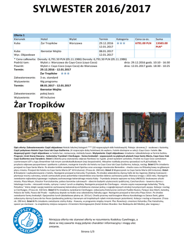 SYLWESTER 2016/2017 Oferta 1 Kierunek Kuba Kuba Wyc. Objazdowe Hotel Żar Tropików Wylot Warszawa Iberostar Mojito Termin 29.12.2016 12.01.2017 Kategoria Cena za os. 6791.00 PLN Suma 13583.00 PLN* 08.01.2017 12.01.2017 * Cena całkowita: Dorosły: 6,791.50 PLN (05.11.1986) Dorosły: 6,791.50 PLN (05.11.1986) Podróż tam: Wylot z: Warszawa do Cayo Coco (cayo Coco) dnia: 29.12.2016 godz. 10:10 - 16:30 Powrót: Wylot z: Cayo Coco (cayo Coco) do Warszawa dnia: 12.01.2017 godz. 18:30 - 10:25 Termin: 29.12.2016 - 12.01.2017 Żar Tropików Zakwaterowanie: 3 os. standard Wyżywienie: Wg programu Termin: 08.01.2017 - 12.01.2017 Iberostar Mojito Zakwaterowanie: pokoj basic Wyżywienie: All Inclusive Żar Tropików Opis oferty: Zakwaterowanie: Część objazdowa Hotele lokalnej kategorii *** (10 rozpoczętych dób hotelowych). Pokoje: skromne,2 - osobowe z łazienką. Część pobytowa Hotele Cayo Coco lub Cayo Guillermo. (4 rozpoczęte doby hotelowe) do wyboru: hotele dostepne w sekcji :Cayo Coco- hotele. Do dyspozycji gości: Część objazdowa: w hotelu bar, restauracja, niekiedy basen. Wyżywienie: Część objazdowa: śniadania i obiadokolacje w formie bufetu. Program: Urok Starej Hawany - kolonialny Trynidad i Cienfuegos - farma krokodyli - wypoczynek na pięknych plażach Cayo Santa Maria, Cayo Coco •lub Cayo Guillermo oraz Varadero. Dzień 1 Zbiórka przy stanowisku odpraw Rainbow na 3 godz. przed wylotem samolotu. Przelot na Cayo Coco samolotem czarterowym LOT-u typu Dreamliner lub innym szerokokadłubowym (rejs bezpośredni). Aktualne rozkłady prosimy sprawdzać na R.pl/rozklady. Po przylocie odprawa paszportowa i spotkanie z pilotem, następnie transfer do hotelu na Cayo Coco lub Cayo Guillermo, kolacja, nocleg. Dzień 2 Po śniadaniu przejazd na Cayo Santa Maria. Po drodze krótkie zwiedzanie Santi Spiritus oraz uroczego miasteczko Remedios - chwila czasu na filiżankę kawy na głównym placu miasta. Przejazd do hotelu na Cayo Santa Maria (4* All Inclusive). (Trasa ok. 260 km). Dzień 3 Wypoczynek na Cayo Santa Maria (All Inclusive). Dzień 4 Śniadanie i wykwaterowanie z hotelu. Następnie przejazd w kierunku Trynidadu. Po drodze odwiedzimy słynną Valle de los Ingenios (Dolinę Cukrowni) plantacje trzciny cukrowej, wioski zamieszkałe przez potomków niewolników oraz bardzo dobrze zachowany pałac Manaca Iznaga z 1816 roku. Następnie zwiedzanie najbardziej typowego i najlepiej zachowanego kolonialnego miasta Kuby - Trynidadu (miasto wpisane na listę UNESCO): brukowane uliczki miasta, Plaza Mayor, klasztor franciszkanów, pałace baronów cukrowych - obecnie budynki użyteczności publicznej, Canchanchara - tawerna słynna z lokalnego trunku - mieszanki miodu, cytryny i rumu! Lunch za dopłatą. Następnie przejazd do Cienfuegos - miasta często nazywanego kubańską "Perłą Południa," które dzięki swojej świetnie zachowanej kolonialnej architekturze stanowi jedną z najpiękniejszych atrakcji turystycznych wyspy. Kolacja i nocleg w Cienfuegos. (Trasa ok. 310 km). Dzień 5 Po śniadaniu zwiedzanie Cienfuegos: zobaczymy historyczne centrum Pueblo Nuevo, Parque Jose Marti, katedrę, Palacio de Valle, Paseo del Prado - najdłuższy deptak na Kubie oraz odwiedzimy fabrykę cygar. Następnie przejazd w kierunku Playa Giron. Po drodze zwiedzanie farmy krokodyli. Opcjonalnie lunch (dodatkowo płatny ok. 20 Eur). Chwila przerwy nad brzegiem Morza Karaibskiego w Zatoce Świń, gdzie zobaczymy słynną Cueva de los Peces (podwodną jaskinię z barwnym od tropikalnych rybek miniaturowym jeziorkiem). Kolacja i nocleg w Hawanie. (Trasa ok. 290 km). Dzień 6 Po śniadaniu zwiedzanie stolicy Kuby - Hawany, w programie między innymi: Plac Rewolucji, cmentarz Kolumba, Plac Katedralny, spacer po starówce - tu znajdziemy miejsca związane z Ernestem Hemingwayem (hotel Ambos Mundos i bar Bodequita del Medio), plac targowy i Niniejsza oferta nie stanowi oferty w rozumieniu Kodeksu Cywilnego, a dane w niej zawarte mają jedynie charakter informacyjny i mogą ulec zmianie. Strona 1/3 SYLWESTER 2016/2017 barokowa katedra oraz Muzeum Rumu. Opcjonalnie lunch za dopłatą (ok. 15 Eur). Po południu zwiedzanie nowej Hawany: Kapitol i Opera. Następnie przejazd przez dzielnice Miramar i Cubanacan (przed rewolucją dzielnice bogaczy). Kolacja i nocleg w Hawanie. Wieczorem dla chętnych rewia (dodatkowo płatna ok. 80 Eur). Dzień 7 Po śniadaniu wyjazd z Hawany. Przejazd przez miasto plantatorów tytoniu Pinar del Rio do Valle de Vinales - parku narodowego z gigantycznymi i malowniczymi wapiennymi ostańcami mogotes. W programie zwiedzanie Indiańskiej Groty (odkrytej w 1951 r.) oraz naskalnych malowideł. Lunch za dodatkową opłatą. W drodze powrotnej zwiedzanie Farmy Orchidei. Kolacja i nocleg w Hawanie.  Wieczorem chętnym i za dodatkową opłatą (ok. 35 Eur) proponujemy występ lokalnych muzyków grających utwory legendarnej grupy Buena Vista Social Club. (Trasa ok. 380 km). Dzień 8 Po śniadaniu dalsze zwiedzanie Hawany, m.in. strzegący portu fort Morro i spacer po słynnym Maleconie. Następnie czas wolny na samodzielne eksplorowanie miasta. Po południu transfer do hotelu w Varadero (4* All Inclusive). (Trasa ok. 150 km). Dzień 9 - 10 Wypoczynek i plażowanie w Varadero. Zachęcamy do odwiedzenia słynnego baru przy Calle 62, gdzie przy kubańskiej muzyce bawią się i turyści i Kubańczycy. Dzień 11 Po śniadaniu całodzienny przejazd na Cayo Coco lub Cayo Guillermo. Po drodze zwiedzanie Santa Clara, miasta od zdobycia którego zaczęła się kubańska rewolucja, w programie Guevara Memorial (osobiste rzeczy Che) i "rewolucyjny" pociąg pancerny. Lunch za dodatkową opłatą (ok. 20 Eur). Zakwaterowanie w wybranym hotelu na Cayo Coco lub Cayo Guillermo (Trasa ok. 500 km). Dzień 12-14 Wypoczynek w hotelu na Cayo Coco lub Cayo Guillermo. Możliwość korzystania z wycieczek opcjonalnych. Dzień 15 Po śniadaniu wykwaterowanie z hotelu. Transfer na lotnisko na Cayo Coco. Wylot do Po