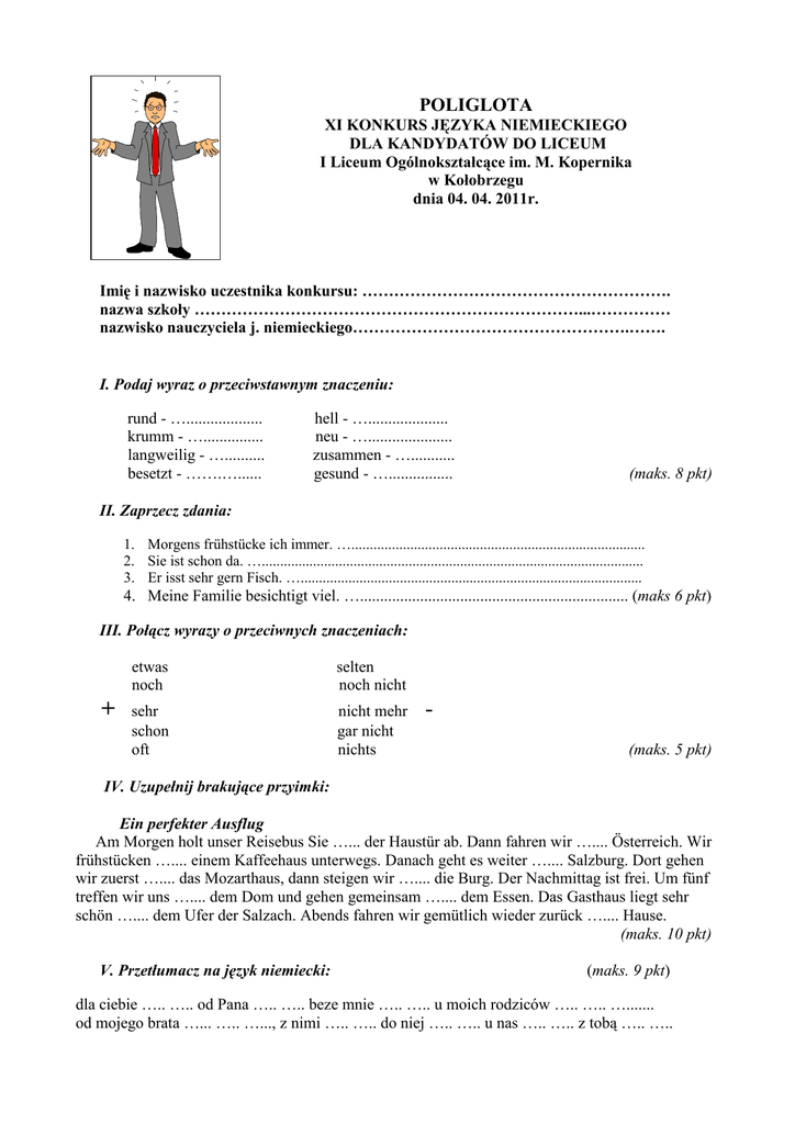 POLIGLOTA XI KONKURS JĘZYKA NIEMIECKIEGO DLA KANDYDATÓW DO LICEUM I Liceum Ogólnokształcące im. M. Kopernika w Kołobrzegu dnia 04. 04. 2011r. Imię i nazwisko uczestnika konkursu: …………………………………………………. nazwa szkoły ………………………………………………………………...…………… nazwisko nauczyciela j. niemieckiego…………………………………………….……. I. Podaj wyraz o przeciwstawnym znaczeniu: rund - …................... krumm - …............... langweilig - ….......... besetzt - …….…...... hell - ….................... neu - …..................... zusammen - …........... gesund - …................ (maks. 8 pkt) II. Zaprzecz zdania: 1. Morgens frühstücke ich immer. …................................................................................ 2. Sie ist schon da. …........................................................................................................ 3. Er isst sehr gern Fisch. …............................................................................................. 4. Meine Familie besichtigt viel. …................................................................... (maks 6 pkt) III. Połącz wyrazy o przeciwnych znaczeniach: + etwas noch selten noch nicht sehr schon oft nicht mehr gar nicht nichts (maks. 5 pkt) IV. Uzupełnij brakujące przyimki: Ein perfekter Ausflug Am Morgen holt unser Reisebus Sie …... der Haustür ab. Dann fahren wir ….... Österreich. Wir frühstücken ….... einem Kaffeehaus unterwegs. Danach geht es weiter ….... Salzburg. Dort gehen wir zuerst ….... das Mozarthaus, dann steigen wir ….... die Burg. Der Nachmittag ist frei. Um fünf treffen wir uns ….... dem Dom und gehen gemeinsam ….... dem Essen. Das Gasthaus liegt sehr schön ….... dem Ufer der Salzach. Abends fahren wir gemütlich wieder zurück ….... Hause. (maks. 10 pkt) V. Przetłumacz na język niemiecki: (maks. 9 pkt) dla ciebie ….. ….. od Pana ….. ….. beze mnie ….. ….. u moich rodziców ….. ….. …....... od mojego brata …... ….. …..., z nimi ….. ….. do niej ….. ….. u nas ….. ….. z tobą ….. ….. VI. Ułóż pytania do podkreślonych części zdań: 1. Seit einer Woche bin ich im Gebirge. 1.…........................................................................................................... 2. Er ist sehr nett. 2. …........................................................................................................... 3. Er joggt jeden Tag im Wald 3.…........................................................................................................... (maks. 6 pkt) VII. Wpisz brakujące litery: Das s_ _ht ja lecker aus! I_ _t du Fleisch, Isolde? Der Kuchen ist sehr s_ß. Heute gibt es Fleisch mit Rei_. Herbert i_t Vegetarier. Ich mag kein sal_iges Essen. Was gibt es zum Mittage_ _ en? Das Fleisch ist mir zu fe_ _. Ist das Fr _ _stück schon fertig? (maks. 9 pkt) VIII. Uzupełnij końcówki przymiotnika: mein klein..... Bruder, eine groß..... Lampe, brav...... Kinder, das interessant..... Buch, mit dem schnell...... Zug, mit deiner gut..... Freundin, mit mein..... lieb..... Eltern (maks. 8 pkt) IX. Ułóż zdania z podanych wyrazów: und, sein Zimmer, Robert, aufräumen, staubsaugen, Maria ….............................................................................................. wir, eine Party, wir im Restaurant, machen, feiern, oder .….............................................................................................. dass, besuchen, du, ich, ich, sich freuen ..…................................................................................................ ob, fragen, der Polizist, haben, der Ausweis, ich …................................................................................................... (maks. 8 pkt) X. Wpisz poprawną formę Partizip II: zumachen - …........................... lesen - ….................................. sich vorbereiten - …................. reparieren - …............................ machen - …............................... wollen - ….....................(maks 6 pkt) XI. Przetłumacz zdania na język niemiecki: Jak długo trwa podróż? ….......................................................................................................... Sklep jest otwarty od 8 do 10. …............................................................................................... Chcielibyśmy zarezerwować pokój na jedną noc ….................................................................... Pomóż mi i zrób zakupy! ….......................................................................................................... Tu nie wolno parkować. …........................................................................................(maks 10 pkt) XII. Dopasuj odpowiedni czasownik: Sport …........................, Filme …............................, Gitarre ….................................. den Geburtstag …............................., Freunde.............................., Feste........................ (maks 6 pkt) Klucz do konkursu Poliglota 2011 I. rund – eckig, krumm – gerade, langweilig – interessant, besetzt – frei, hell – dunkel, neu – alt, zusammen – getrennt, gesund – krank; II. Morgens frühstücke ich nie. Sie ist noch nicht da. Er isst nicht sehr gern Fisch. Meine Familie besichtigt nicht viel. III. Etwas – nichts, noch – nicht mehr, schon – noch nicht, oft – selten, sehr – gar nicht; IV. Am Morgen holt unser Reisebus Sie von der Haustür ab. Dann fahren wir nach Österreich. Wir frühstücken in einem Kaffeehaus unterwegs. Danach geht es weiter nach Salzburg. Dort gehen wir zuerst in das Mozarthaus, dann steigen wir auf die Burg. Der Nachmittag ist frei. Um fünf treffen wir uns vor dem Dom und gehen gemeinsam zu dem Essen. Das Gasthaus liegt sehr schön an 