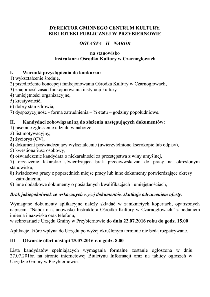 DYREKTOR GMINNEGO CENTRUM KULTURY. BIBLIOTEKI PUBLICZNEJ W PRZYBIERNOWIE OGŁASZA II NABÓR na stanowisko Instruktora Ośrodka Kultury w Czarnogłowach I. Warunki przystąpienia do konkursu: 1) wykształcenie średnie, 2) przedłożenie koncepcji funkcjonowania Ośrodka Kultury w Czarnogłowach, 3) znajomość zasad funkcjonowania instytucji kultury, 4) umiejętności organizacyjne, 5) kreatywność, 6) dobry stan zdrowia, 7) dyspozycyjność - forma zatrudnienia – ¾ etatu – godziny popołudniowe. II. Kandydaci zobowiązani są do złożenia następujących dokumentów: 1) pisemne zgłoszenie udziału w naborze, 2) list motywacyjny, 3) życiorys (CV), 4) dokument poświadczający wykształcenie (uwierzytelnione kserokopie lub odpisy), 5) kwestionariusz osobowy, 6) oświadczenie kandydata o niekaralności za przestępstwa z winy umyślnej, 7) orzeczenie lekarskie stwierdzające brak przeciwwskazań do pracy na określonym stanowisku, 8) świadectwa pracy z poprzednich miejsc pracy lub inne dokumenty potwierdzające okresy zatrudnienia, 9) inne dodatkowe dokumenty o posiadanych kwalifikacjach i umiejętnościach, Brak jakiegokolwiek ze wskazanych wyżej dokumentów skutkuje odrzuceniem oferty. Wymagane dokumenty aplikacyjne należy składać w zamkniętych kopertach, opatrzonych napisem: “Nabór na stanowisko Instruktora Ośrodka Kultury w Czarnogłowach” z podaniem imienia i nazwiska oraz telefonu, w sekretariacie Urzędu Gminy w Przybiernowie do dnia 22.07.2016 roku do godz. 15.00 Aplikacje, które wpłyną do Urzędu po wyżej określonym terminie nie będą rozpatrywane. III Otwarcie ofert nastąpi 25.07.2016 r. o godz. 8.00 Lista kandydatów spełniających wymagania formalne zostanie ogłoszona w dniu 27.07.2016r. na stronie internetowej Biuletynu Informacji oraz na tablicy ogłoszeń w Urzędzie Gminy w Przybiernowie. Konkurs zostanie przeprowadzony w dwóch etapach: I etap - sprawdzenie ofert pod względem formalnym bez udziału kandydatów, termin rozpatrzenia ofert 25.07.2016 rok. II etap - komisja konkursowa przeprowadzi rozmowę kwalifikacyjną z kandydatami, podczas której zaprezentują swoją koncepcję prowadzenia instytucji kultury oraz plan działania Ośrodka Kultury w Czarnogłowach. Kandydaci dopuszczeni do II etapu konkursu zostaną powiadomieni indywidualnie o terminie i miejscu rozmowy. Informacja o wyniku naboru będzie umieszczona na stronie internetowej Biuletynu Informacji Publicznej (www.przybiernow.pl) oraz na tablicy informacyjnej Urzędu Gminy w Przybiernowie. Wymagane dokumenty aplikacyjne: list motywacyjny, szczegółowe CV (z uwzględnieniem dokładnego przebiegu kariery zawodowej), powinny być opatrzone klauzulą: “Wyrażam zgodę na przetwarzanie moich danych osobowych zawartych w ofercie pracy dla potrzeb niezbędnych do realizacji procesu rekrutacji zgodnie z ustawą z 29.08.1997 r. o ochronie danych osobowych”. Dyrektor Gminnego Centrum Kultury. Biblioteki Publicznej w Przybiernowie Sylwia Karp Przybiernów dn. 29.06.2016 r.