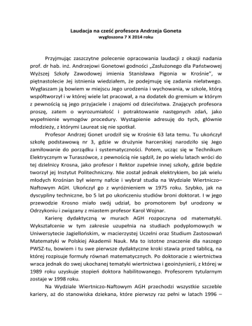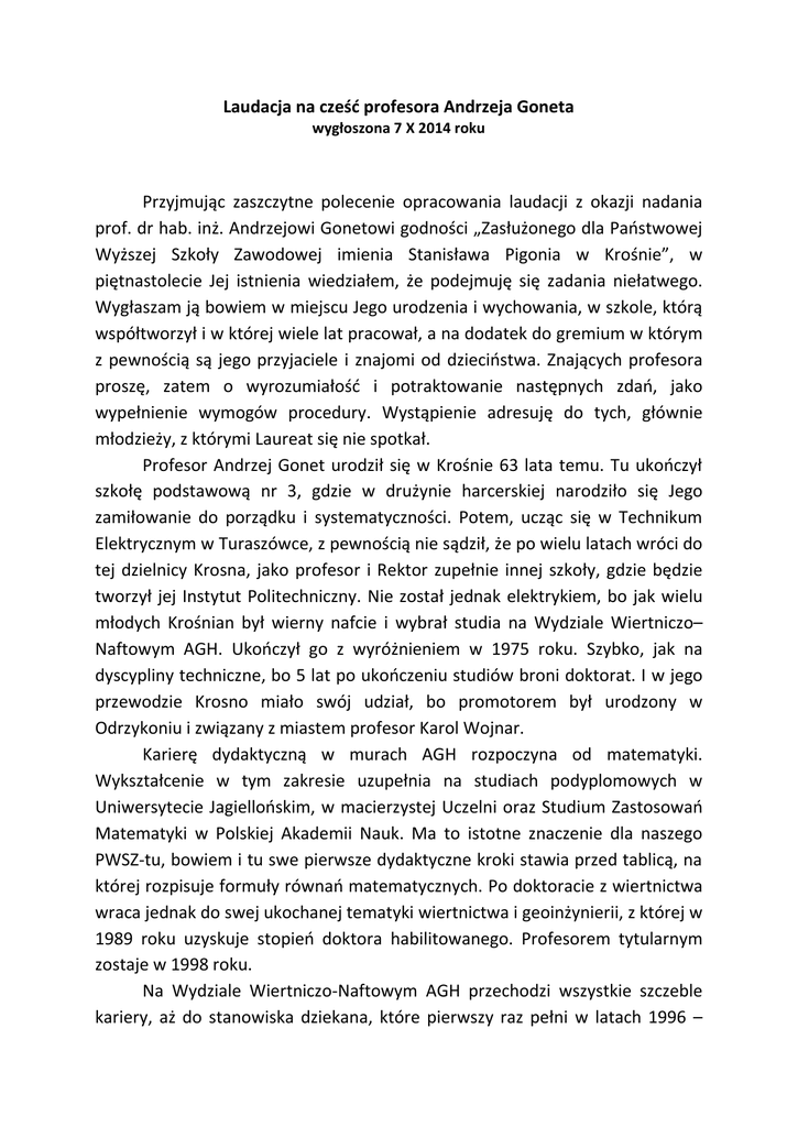 Laudacja na cześć profesora Andrzeja Goneta wygłoszona 7 X 2014 roku Przyjmując zaszczytne polecenie opracowania laudacji z okazji nadania prof. dr hab. inż. Andrzejowi Gonetowi godności „Zasłużonego dla Państwowej Wyższej Szkoły Zawodowej imienia Stanisława Pigonia w Krośnie”, w piętnastolecie Jej istnienia wiedziałem, że podejmuję się zadania niełatwego. Wygłaszam ją bowiem w miejscu Jego urodzenia i wychowania, w szkole, którą współtworzył i w której wiele lat pracował, a na dodatek do gremium w którym z pewnością są jego przyjaciele i znajomi od dzieciństwa. Znających profesora proszę, zatem o wyrozumiałość i potraktowanie następnych zdań, jako wypełnienie wymogów procedury. Wystąpienie adresuję do tych, głównie młodzieży, z którymi Laureat się nie spotkał. Profesor Andrzej Gonet urodził się w Krośnie 63 lata temu. Tu ukończył szkołę podstawową nr 3, gdzie w drużynie harcerskiej narodziło się Jego zamiłowanie do porządku i systematyczności. Potem, ucząc się w Technikum Elektrycznym w Turaszówce, z pewnością nie sądził, że po wielu latach wróci do tej dzielnicy Krosna, jako profesor i Rektor zupełnie innej szkoły, gdzie będzie tworzył jej Instytut Politechniczny. Nie został jednak elektrykiem, bo jak wielu młodych Krośnian był wierny nafcie i wybrał studia na Wydziale Wiertniczo– Naftowym AGH. Ukończył go z wyróżnieniem w 1975 roku. Szybko, jak na dyscypliny techniczne, bo 5 lat po ukończeniu studiów broni doktorat. I w jego przewodzie Krosno miało swój udział, bo promotorem był urodzony w Odrzykoniu i związany z miastem profesor Karol Wojnar. Karierę dydaktyczną w murach AGH rozpoczyna od matematyki. Wykształcenie w tym zakresie uzupełnia na studiach podyplomowych w Uniwersytecie Jagiellońskim, w macierzystej Uczelni oraz Studium Zastosowań Matematyki w Polskiej Akademii Nauk. Ma to istotne znaczenie dla naszego PWSZ-tu, bowiem i tu swe pierwsze dydaktyczne kroki stawia przed tablicą, na której rozpisuje formuły równań matematycznych. Po doktoracie z wiertnictwa wraca jednak do swej ukochanej tematyki wiertnictwa i geoinżynierii, z której w 1989 roku uzyskuje stopień doktora habilitowanego. Profesorem tytularnym zostaje w 1998 roku. Na Wydziale Wiertniczo-Naftowym AGH przechodzi wszystkie szczeble kariery, aż do stanowiska dziekana, które pierwszy raz pełni w latach 1996 – 1999. Obecnie, pełni tę funkcję drugą kadencję, po raz drugi. Doświadczenia zdobyte podczas piastowania wielu funkcji oraz, oczywiście walory osobiste były powodem, że kiedy ówczesny rektor AGH, prof. dr hab. inż. Ryszard Tadeusiewicz został poproszony przez Inicjatorów powołania naszej szkoły o wsparcie kadrowe, biorąc pewno również pod uwagę miejsce urodzenia Profesora Goneta – bez wahania wskazał właśnie Jego. Tak rozpoczął się niezwykle ważny dla PWSZ-tu rozdział w życiu Laureata. Jako prorektor (w okresie: lipiec 1999 – sierpień 2000) i rektor kadencji 2000 – 2004 wniósł w Jej rozwój wkład nie do przecenienia. Wielu z Państwa, tak z pośród pracowników szkoły jak i z władz administracyjnych, którzy pełnili funkcje w tamtych trudnych latach, z pewnością pamięta rozmowy z Rektorem Gonetem. Często niełatwe, wymagające zmagania się z Jego uporem, który jeśli dotyczył dobra Szkoły należy uznać za cechę pozytywną. Efekty pracy zespołu kierowanego przez Rektora Goneta widoczne były szybko, a że opisane są szeroko w pamiątkowej księdze wydanej na 5 lecie Szkoły i następnych, nie będę ich przywoływał. Pracę administracyjną łączył przez cały czas z dydaktyczną, wykładając wspomnianą matematykę, ale i przedmioty geotechniczne dla inżynierów od środowiska. Wypromował ich kilkudziesięciu. Jego wykształcenie w kierunkach „geo” wywarło istotny wpływ na początkowy kształt Instytutu Politechnicznego. Pracę dydaktyczną kontynuował i po zakończeniu sprawowania funkcji rektora, do czasu, kiedy organizm zaprotestował, a lekarz ostrzegł przed skutkami przepracowania, to jest do września 2011 roku. Odchodząc od nas, ale przecież nie sercem, oprócz bazy materialnej, którą kolektyw (jak się kiedyś mawiało) Rektora Goneta budował, Laureat pozostawił po sobie chyba coś trwalszego, to jest wychowanków i grono pamiętających współpracowników. Ograniczony czasem, jak tego wymagają takie wystąpienia muszę jeszcze w telegraficznym skrócie podać podstawowe dane charakteryzujące naukowca. Profesor Gonet jest autorem ponad 300 publikacji, w tym kilku podręczników i monografii, przynajmniej tylu samo opracowań wykonanych na zlecenie przemysłu czy władz administracyjnych, 29. patentów i wzorów użytkowych, kilku licencji. Kierował dużymi tematami pozyskanymi w postepowaniach konkursowych, w tym dotyczących Podkarpacia. Wypromował 7 doktorów. Jego zainteresowania naukowe obejmują: nowoczesne techniki wiertnicze, projektowanie wierceń kierunkowych, wiercenia podziemne oraz zagadnienia z pogranicza wiertnictwa i inżynierii środowiska takie jak geotermia, zagospodarowanie odpadów wiertniczych, a przede wszystkim geoinżynieria. Jest członkiem wielu stowarzyszeń i organizacji naukowych, redakcji czasopism, kongresów tak w kraju jak i zagranicą. Zasiada, jako ekspert w wielu gremiach doradczych w kraju oraz Chorwacji, Czechach, Słowacji, Rumunii. Jednym zdaniem jest uznanym w kraju i zagranicą ekspertem i naukowcem. I na koniec, przepraszam, jak to dzisiaj bywa - prywata. To dzięki inicjatywie Laureata moja osoba 14 lat temu pojawiła się w szkole krośnieńskiej. Andrzeju, bardzo dziękuję! Nie wiem czy szkoła zyskała, ale ja znalazłem nowe środowisko, w którym w stronach prawie rodzinnych mogę się realizować jako dydaktyk. Szanowny Panie Profesorze, Zasłużony dla naszego PWSZ-tu - szczerze gratuluję wyróżnienia, a Państwu dziękuję za uwagę. prof. dr hab. inż. Maciej