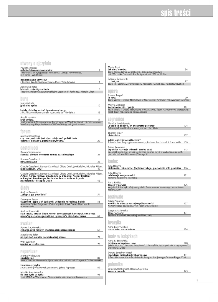 spis treści dział utwory o ojczyźnie Paweł Schreiber nabożeństwo niedowiarków Teatr Polski w Bydgoszczy: Mickiewicz. Dziady. Performance, reż. Paweł Wodziński 2 Marta Bryś jak nie z mrożka Teatr Łaźnia Nowa w Krakowie, Moja pierwsza zjawa, reż. Weronika Szczawińska; Emigranci, reż. Wiktor Rubin dekolonizacja umysłów z Pawłem Wodzińskim rozmawia Paweł Sztarbowski 4 Żelisław Żelisławski ... jest jak... 97 Teatr im. Stefana Żeromskiego w Kielcach: Hamlet, reż. Radosław Rychcik Agnieszka Rataj historio, cożeś ty za furia Teatr im. Heleny Modrzejewskiej w Legnicy: III Furie, reż. Marcin Liber 8 opera Joanna Targoń la luna 99 Teatr Wielki – Opera Narodowa w Warszawie: Turandot, reż. Mariusz Treliński burg Jan Niedziela globalna epika 10 każdy chciałby zostać dyrektorem burgu z Matthiasem Hartmannem rozmawia Jan Niedziela 15 Ana Brzezińska król umiera 17 Jan Lauwers & Needcompany, Burgtheater w Wiedniu: The Art of Entertainment. Needcompany Plays the Death of Michael König, reż. Jan Lauwers forum Marcin Kościelniak czy rzeczywistość jest złym miejscem? polski teatr ostatniej dekady a postawa krytyczna 94 22 castellucci Maryla Zielińska konsekwentnie, z pasją 101 Teatr Wielki – Opera Narodowa w Warszawie, Teatr Narodowy w Warszawie: Jakob Lenz, reż. Natalia Korczakowska zagranica Monika Kwaśniewska „i used to believe / in the pretty pictures” Schauspielhaus Bochum: Ameryka, reż. Jan Klata 104 Thomas Irmer chórmistrz 107 gdzie jest źródło zakłócenia? z Bernardem Freytagiem rozmawiają Barbara Burckhardt i Franz Wille 109 Dorota Semenowicz skandal obrazu. o teatrze romea castellucciego 31 Estera Żeromska japońska narracja shinnai i taniec buy 113 Spektakl japońskiej sztuki scenicznej shinnai buy w wykonaniu zespołu pod kierunkiem Wakasanoj Tsuruga XI Romeo Castellucci notatki klauna 38 taniec Claudia Castellucci, Romeo Castellucci, Chiara Guidi, Joe Kelleher, Nicholas Ridout laboratorium, 2001 42 Julia Hoczyk cielesność, tożsamość, (de)konstrukcja. pięciolecie solo projektu 116 Claudia Castellucci, Romeo Castellucci, Chiara Guidi, Joe Kelleher, Nicholas Ridout P.#06 i R.#07. Festival d’Automne w Odeonie: Atelier Berthier w Paryżu i RomEuropa Festival w Teatro Valle w Rzymie październik – listopad 2003 46 Julia Hoczyk celebracje wzajemności Festiwal Wiosny w Poznaniu 121 ślady Anna Królica taniec w zarysie 125 Wojciech Klimczyk, Wizjonerzy ciała. Panorama współczesnego teatru tańca, Ha!art 2010 Andrzej Turowski „oślepiające powidoki” 54 Katarzyna Fazan fragment i jego cień (odłamki widzenia mirosława bałki) Mirosław Bałka, Fragment. Wideoprojekcje, CSW Zamek Ujazdowski w Warszawie festiwale 58 Jakub Papuczys zawikłane obrazy naszej współczesności XLVI Przegląd Teatru Małych Form w Szczecinie 127 Andrzej Zawadzki ślad sztuki, sztuka śladu. wokół estetycznych koncepcji jeana-luca nancy’ego, gianniego vattimo i georges’a didi-hubermana 62 Justyna Stasiowska tower of song Festiwal Piosenki Aktorskiej we Wrocławiu 131 awatar brazylia Agnieszka Jelewska cyborgi, płeć maszyn i tożsamości rozszczepione 68 Anna Bajor-Ciciliati maraca-tu, maraca-tam Magdalena Talar postpostać, awatar na wirtualnej scenie 74 teatr w książkach W.B. Worthen hamlet w strefie zero 78 Anna R. Burzyńska istnienie uczepione słów 140 Jakub Momro, Literatura świadomości. Samuel Beckett – podmiot – negatywność, Universitas 2010 repertuar Joanna Wichowska smutek sieci 87 Nowy Teatr w Warszawie: Życie seksualne dzikich, reż. Krzysztof Garbaczewski tworzenie ryzyka z Aleksandrą Wasilkowską rozmawia Jakub Papuczys 89 Monika Kwaśniewska ile jest życia w życiu? Teatr IMKA w Warszawie: Nasze miasto, reż. Szymon Kaczmarek 93 134 Dorota Jarząbek-Wasyl raptularz: miliard mikrokosmosów 141 Juliusz Osterwa, Raptularz kijowski, Instytut im. Jerzego Grotowskiego 2010 polemika Leszek Kolankiewicz, Dorota Sajewska szczera prawda 143 1