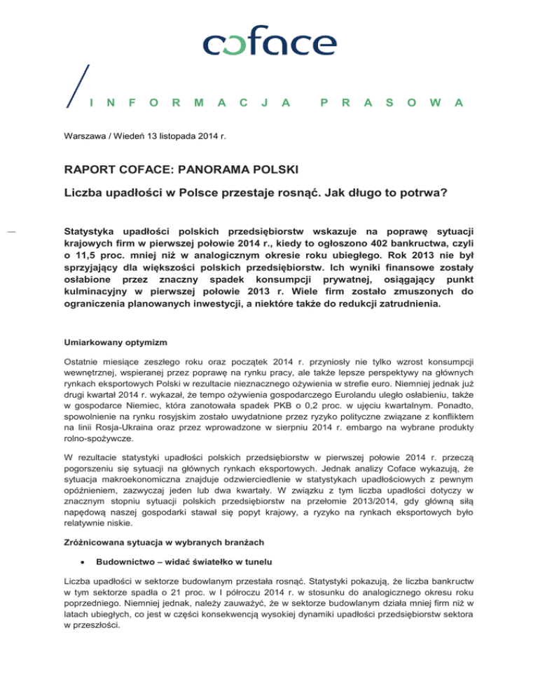 I N F O R M A C J A P R A S O W A Warszawa / Wiedeń 13 listopada 2014 r. RAPORT COFACE: PANORAMA POLSKI Liczba upadłości w Polsce przestaje rosnąć. Jak długo to potrwa? Statystyka upadłości polskich przedsiębiorstw wskazuje na poprawę sytuacji krajowych firm w pierwszej połowie 2014 r., kiedy to ogłoszono 402 bankructwa, czyli o 11,5 proc. mniej niż w analogicznym okresie roku ubiegłego. Rok 2013 nie był sprzyjający dla większości polskich przedsiębiorstw. Ich wyniki finansowe zostały osłabione przez znaczny spadek konsumpcji prywatnej, osiągający punkt kulminacyjny w pierwszej połowie 2013 r. Wiele firm zostało zmuszonych do ograniczenia planowanych inwestycji, a niektóre także do redukcji zatrudnienia. Umiarkowany optymizm Ostatnie miesiące zeszłego roku oraz początek 2014 r. przyniosły nie tylko wzrost konsumpcji wewnętrznej, wspieranej przez poprawę na rynku pracy, ale także lepsze perspektywy na głównych rynkach eksportowych Polski w rezultacie nieznacznego ożywienia w strefie euro. Niemniej jednak już drugi kwartał 2014 r. wykazał, że tempo ożywienia gospodarczego Eurolandu uległo osłabieniu, także w gospodarce Niemiec, która zanotowała spadek PKB o 0,2 proc. w ujęciu kwartalnym. Ponadto, spowolnienie na rynku rosyjskim zostało uwydatnione przez ryzyko polityczne związane z konfliktem na linii Rosja-Ukraina oraz przez wprowadzone w sierpniu 2014 r. embargo na wybrane produkty rolno-spożywcze. W rezultacie statystyki upadłości polskich przedsiębiorstw w pierwszej połowie 2014 r. przeczą pogorszeniu się sytuacji na głównych rynkach eksportowych. Jednak analizy Coface wykazują, że sytuacja makroekonomiczna znajduje odzwierciedlenie w statystykach upadłościowych z pewnym opóźnieniem, zazwyczaj jeden lub dwa kwartały. W związku z tym liczba upadłości dotyczy w znacznym stopniu sytuacji polskich przedsiębiorstw na przełomie 2013/2014, gdy główną siłą napędową naszej gospodarki stawał się popyt krajowy, a ryzyko na rynkach eksportowych było relatywnie niskie. Zróżnicowana sytuacja w wybranych branżach Budownictwo – widać światełko w tunelu Liczba upadłości w sektorze budowlanym przestała rosnąć. Statystyki pokazują, że liczba bankructw w tym sektorze spadła o 21 proc. w I półroczu 2014 r. w stosunku do analogicznego okresu roku poprzedniego. Niemniej jednak, należy zauważyć, że w sektorze budowlanym działa mniej firm niż w latach ubiegłych, co jest w części konsekwencją wysokiej dynamiki upadłości przedsiębiorstw sektora w przeszłości. Handel detaliczny - ostrożni konsumenci i silna konkurencja O 27 proc. wzrosła liczba upadłości w handlu detalicznym (porównując I połowę 2014 r. z analogicznym okresem 2013 r.) Proces konsolidacji sektora jest w toku. Zauważalna jest w nim silna konkurencja i presja na obniżanie marż. Pomimo lepszej sytuacji na rynku pracy, konsumenci nadal są bardzo ostrożni w podejmowaniu decyzji zakupowych. Słaby popyt na dobra trwałego użytku jest potwierdzony jedną z największych upadłości w tym roku – firmy Domex, właściciela sieci Avans, która posiadała 250 sklepów zatrudniających 3000 pracowników. Transport – silna konkurencja Liczba bankructw firm transportowych po 6 miesiącach 2014 r. utrzymuje się na tym samym poziomie, co w I połowie 2013 r. Obecne kłopoty w handlu na rynkach zagranicznych mogą skutkować wzrostem upadłości w kolejnych kwartałach. Co więcej, konkurencja w tym sektorze jest silna i wymusza akceptację niższych marż przy konieczności ponoszenia kosztów stałych działalności. Ponadto sektor transportowy wymaga regularnych inwestycji, zwłaszcza w przypadku transportu drogowego w związku z koniecznością odnawiania taboru i coraz bardziej restrykcyjnymi normami emisji spalin. Czy zawirowania na rynkach eksportowych wpłyną na przyszłą liczbę upadłości w Polsce? Obecne perspektywy makroekonomiczne najważniejszych partnerów handlowych Polski są zróżnicowane. W II kw. 2014 r. w strefie euro obserwowano powolne ożywienie, które można nawet uznać za przejściowe spowolnienie. Trzeci kwartał był wciąż trudny, ale Coface prognozuje, że cały ten rok zapewni poprawę sytuacji w strefie euro przy wzroście, który zwiększy się z -0,4% w 2013 r. do 0,9% w 2014 r. Spowolnienie w Rosji w tym samym okresie spowoduje, stagnację wzrostu gospodarczego w 2014 r. Według Coface najbardziej prawdopodobny scenariusz wpływu sytuacji zewnętrznej na poziom upadłości w Polsce to wzrost bankructw o 8% na skutek stagnacji na kluczowych dla Polski rynkach eksportowych. Niemniej jednak, jeśli dojdzie do zwiększenia napięć pomiędzy UE i Rosją i/lub spowolnienie strefy euro pogłębi się, sytuacja ta znajdzie jeszcze bardziej negatywne odzwierciedlenie w statystykach upadłościowych. Obecna sytuacja na rynkach zagranicznych powoduje szereg zagrożeń dla polskiej gospodarki. W sierpniu 2014 r. Rosja wprowadziła embargo na mięso, ryby, owoce, warzywa, produkty mleczne z UE, USA, Australii, Kanady i Norwegii. Rosyjskie embargo dotknęło także części polskiego eksportu. I choć jest to zaledwie 0,5 proc. ogólnej wartości towarów wysyłanych za granicę, to jednak do Rosji eksport ten stanowi 10 proc. Polskie firmy, które koncentrowały się do tej pory na handlu z Rosją, zostały zmuszone do poszukiwania nowych rynków zbytu. W ujęciu makroekonomicznym, taki spadek polskiego eksportu wydaje się nie być niebezpieczny. Wartość polskiej sprzedaży do Rosji spadła o 500 mln EUR w okresie styczeń-lipiec 2014 r. (czyli gdy jeszcze nie obowiązywało embargo) w porównaniu do analogicznego okresu w 2013 r. Inaczej wygląda sytuacja na rynku eksportowym do Niemiec, gdzie sprzedaż towarów do tego kraju była wyższa o 1,9 mld EUR w tym samym okresie. Strefa euro pozostaje głównym kierunkiem eksportowym dla polskich przedsiębiorstw. Trzeci kwartał 2014 r. był jednak nadal 