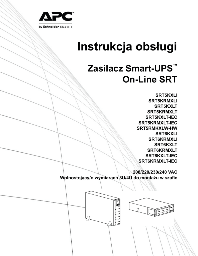 Instrukcja obsługi Zasilacz Smart-UPS™ On-Line SRT SRT5KXLI SRT5KRMXLI SRT5KXLT SRT5KRMXLT SRT5KXLT-IEC SRT5KRMXLT-IEC SRT5RMKXLW-HW SRT6KXLI SRT6KRMXLI SRT6KXLT SRT6KRMXLT SRT6KXLT-IEC SRT6KRMXLT-IEC 208/220/230/240 VAC Wolnostojący/o wymiarach 3U/4U do montażu w szafie Opis produktu Zasilacz Smart-UPS™ On-Line SRT firmy APC™ by Schneider Electric to zasilacz UPS (Uninterruptible Power Supply) o wysokiej wydajności. Zasilacz UPS zapewnia zabezpieczenie sprzętu elektronicznego przed spadkami, wzrostami i przerwami w dostawie napięcia zasilającego, zarówno nieznacznymi, jak i tymi o dużym nasileniu. Zasilacz UPS zapewnia także pracę podłączonego sprzętu na zasilaniu akumulatorowym, aż do przywrócenia stabilnego zasilania sieciowego lub do całkowitego rozładowania akumulatora. Instrukcja obsługi jest dostępna na dołączonym dysku CD z dokumentacją oraz w witrynie internetowej firmy APC pod adresem www.apc.com. Informacje ogólne Komunikaty dotyczące bezpieczeństwa Przed rozpoczęciem instalacji, obsługi, czynności serwisowych lub konserwacyjnych zasilacza UPS należy przeczytać uważnie instrukcje w celu zapoznania się z urządzeniem. W niniejszym podręczniku lub na urządzeniu mogą występować poniższe specjalne komunikaty, ostrzegające przed potencjalnym niebezpieczeństwem lub zwracające uwagę na pewne informacje, które wyjaśniają lub upraszczają procedurę. Dodanie tego symbolu do etykiety bezpieczeństwa produktu Niebezpieczeństwo lub Ostrzeżenie wskazuje na występowanie zagrożenia związanego z elektrycznością, a nieprzestrzeganie instrukcji może spowodować obrażenia ciała. Dodanie tego symbolu do etykiety bezpieczeństwa produktu Ostrzeżenie lub Przestroga wskazuje na występowanie zagrożenia, które może prowadzić do obrażeń ciała lub uszkodzenia produktu w przypadku niestosowania się do zamieszczonych tu instrukcji. PRZESTROGA PRZESTROGA wskazuje na potencjalną sytuację zagrożenia, która w przypadku nieuniknięcia może spowodować niewielkie lub średnie obrażenia ciała. PRZESTROGA PRZESTROGA odnosi się do procedur niezwiązanych z obrażeniami ciała, a dotyczy określonych zagrożeń dla środowiska, potencjalnych uszkodzeń lub utraty danych. Zasilacz Smart-UPS On-Line SRT5K/6K wolnostojący/o wymiarach 3U/4U do montażu w 1 Informacje dotyczące bezpieczeństwa • Należy przestrzegać wszystkich krajowych i lokalnych przepisów dotyczących instalacji elektrycznych. • Całe okablowanie musi być wykonane przez wykwalifikowanego elektryka. • Zmiany oraz modyfikacje urządzenia nie zaakceptowane w sposób jednoznaczny przez APC mogą spowodować unieważnienie gwarancji. • Zasilacz jest przeznaczony do użytku wyłącznie w pomieszczeniach zamkniętych. • Nie wolno go narażać na bezpośrednie działanie światła słonecznego i jakichkolwiek cieczy ani używać w warunkach dużego zapylenia lub nadmiernej wilgotności. • Należy się upewnić, że otwory wentylacyjne zasilacza nie są zablokowane. Należy zapewnić odpowiednią wentylację. • W przypadku zasilaczy UPS z zainstalowanym fabrycznie kablem zasilającym, kabel ten należy podłączyć bezpośrednio do gniazda ściennego. Nie należy korzystać z filtrów przepięciowych ani przedłużaczy. • Typowa żywotność akumulatora wynosi od 2 do 5 lat. Mają na nią wpływ czynniki środowiskowe. Wysokie temperatury otoczenia, niska jakość zasilania sieciowego i częste, szybkie rozładowania skracają żywotność akumulatora. • Urządzenie jest ciężkie. Zawsze używaj bezpiecznych metod podnoszenia dostosowanych do ciężaru sprzętu. • Akumulatory są ciężkie. Przed montażem zasilacza UPS i zewnętrznego zestawu akumulatorów (XLBP) w szafie należy wyjąć akumulatory. • Zestawy XLBP należy zawsze instalować na dole konfiguracji montażu w szafie. Zasilacz UPS należy instalować nad zestawami XLBP. • W przypadku montażu w szafie urządzenia peryferyjne należy zawsze instalować nad zasilaczem UPS. • Dodatkowe informacje dotyczące bezpieczeństwa można znaleźć w instrukcji bezpieczeństwa dołączonej do urządzenia. Bezpieczne wyłączanie spod napięcia Zasilacz awaryjny zawiera wbudowane akumulatory stwarzające ryzyko porażenia prądem, nawet gdy urządzenie jest odłączone od sieci zasilającej. Przed rozpoczęciem wykonywania czynności instalacyjnych lub serwisowych urządzenia należy sprawdzić, czy: • Automatyczny wyłącznik zasilania od strony sieci jest ustawiony w pozycji WYŁ. • Wyjęto wewnętrzne akumulatory zasilacza UPS • odłączono moduły akumulatorowe XLBP Bezpieczeństwo elektryczne • W przypadku modeli ze stałym połączeniem wejściowym podłączenia do obwodu zasilającego może dokonać wyłącznie wykwalifikowany elektryk. • TYLKO modele na 230 V: W celu zachowania zgodności z dyrektywą EMC dla produktów sprzedawanych w Europie, przewody wyjściowe podłączone do zasilacza nie powinny przekraczać 10 metrów długości. • Przewód masy w zasilaczu służy do przewodzenia prądu upływowego z odbiorników prądu (urządzeń komputerowych). Tor zasilający zasilacz należy wyposażyć w przewód uziemiający w izolacji. Przewód ten musi mieć tę samą średnicę, a zastosowana izolacja musi być wykonana z tego samego materiału, jak w przypadku uziemionych i nieuziemionych przewodów bezpośrednio podłączonych do toru zasilającego. Przewód jest zwykle w kolorze zielonym z żółtym paskiem lub bez żółtego paska. • Przewodnik uziemienia wejścia UPS musi być prawidłowo podłączony w panelu serwisowym do uziemienia ochronnego. Jeśli wejście zasilania UPS jest dostarczane przez oddzielny system, przewodnik uziemienia musi być prawidłowo podłączony w transformatorze zasilania lub w silnikowym generatorze. 2 Zasilacz Smart-UPS On-Line SRT5K/6K wolnostojący/o wymiarach 3U/4U do montażu w Bezpieczne używanie akumulatora • Przed przystąpieniem d
