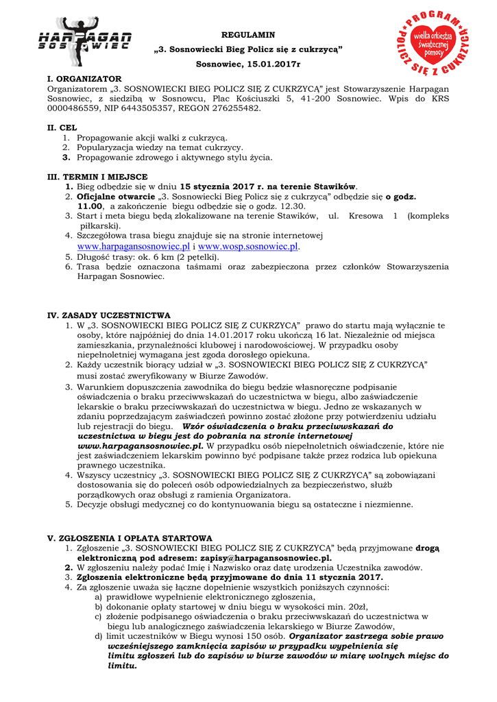 REGULAMIN „3. Sosnowiecki Bieg Policz się z cukrzycą” Sosnowiec, 15.01.2017r I. ORGANIZATOR Organizatorem „3. SOSNOWIECKI BIEG POLICZ SIĘ Z CUKRZYCĄ” jest Stowarzyszenie Harpagan Sosnowiec, z siedzibą w Sosnowcu, Plac Kościuszki 5, 41-200 Sosnowiec. Wpis do KRS 0000486559, NIP 6443505357, REGON 276255482. II. CEL 1. Propagowanie akcji walki z cukrzycą. 2. Popularyzacja wiedzy na temat cukrzycy. 3. Propagowanie zdrowego i aktywnego stylu życia. III. TERMIN I MIEJSCE 1. Bieg odbędzie się w dniu 15 stycznia 2017 r. na terenie Stawików. 2. Oficjalne otwarcie „3. Sosnowiecki Bieg Policz się z cukrzycą” odbędzie się o godz. 11.00, a zakończenie biegu odbędzie się o godz. 12.30. 3. Start i meta biegu będą zlokalizowane na terenie Stawików, ul. Kresowa 1 (kompleks piłkarski). 4. Szczegółowa trasa biegu znajduje się na stronie internetowej www.harpagansosnowiec.pl i www.wosp.sosnowiec.pl. 5. Długość trasy: ok. 6 km (2 pętelki). 6. Trasa będzie oznaczona taśmami oraz zabezpieczona przez członków Stowarzyszenia Harpagan Sosnowiec. IV. ZASADY UCZESTNICTWA 1. W „3. SOSNOWIECKI BIEG POLICZ SIĘ Z CUKRZYCĄ” prawo do startu mają wyłącznie te osoby, które najpóźniej do dnia 14.01.2017 roku ukończą 16 lat. Niezależnie od miejsca zamieszkania, przynależności klubowej i narodowościowej. W przypadku osoby niepełnoletniej wymagana jest zgoda dorosłego opiekuna. 2. Każdy uczestnik biorący udział w „3. SOSNOWIECKI BIEG POLICZ SIĘ Z CUKRZYCĄ” musi zostać zweryfikowany w Biurze Zawodów. 3. Warunkiem dopuszczenia zawodnika do biegu będzie własnoręczne podpisanie oświadczenia o braku przeciwwskazań do uczestnictwa w biegu, albo zaświadczenie lekarskie o braku przeciwwskazań do uczestnictwa w biegu. Jedno ze wskazanych w zdaniu poprzedzającym zaświadczeń powinno zostać złożone przy potwierdzeniu udziału lub rejestracji do biegu. Wzór oświadczenia o braku przeciwwskazań do uczestnictwa w biegu jest do pobrania na stronie internetowej www.harpagansosnowiec.pl. W przypadku osób niepełnoletnich oświadczenie, które nie jest zaświadczeniem lekarskim powinno być podpisane także przez rodzica lub opiekuna prawnego uczestnika. 4. Wszyscy uczestnicy „3. SOSNOWIECKI BIEG POLICZ SIĘ Z CUKRZYCĄ” są zobowiązani dostosowania się do poleceń osób odpowiedzialnych za bezpieczeństwo, służb porządkowych oraz obsługi z ramienia Organizatora. 5. Decyzje obsługi medycznej co do kontynuowania biegu są ostateczne i niezmienne. V. ZGŁOSZENIA I OPŁATA STARTOWA 1. Zgłoszenie „3. SOSNOWIECKI BIEG POLICZ SIĘ Z CUKRZYCĄ” będą przyjmowane drogą elektroniczną pod adresem: [email protected]. 2. W zgłoszeniu należy podać Imię i Nazwisko oraz datę urodzenia Uczestnika zawodów. 3. Zgłoszenia elektroniczne będą przyjmowane do dnia 11 stycznia 2017. 4. Za zgłoszenie uważa się łączne dopełnienie wszystkich poniższych czynności: a) prawidłowe wypełnienie elektronicznego zgłoszenia, b) dokonanie opłaty startowej w dniu biegu w wysokości min. 20zł, c) złożenie podpisanego oświadczenia o braku przeciwwskazań do uczestnictwa w biegu lub analogicznego zaświadczenia lekarskiego w Biurze Zawodów, d) limit uczestników w Biegu wynosi 150 osób. Organizator zastrzega sobie prawo wcześniejszego zamknięcia zapisów w przypadku wypełnienia się limitu zgłoszeń lub do zapisów w biurze zawodów w miarę wolnych miejsc do limitu. a) b) e) opłata startowa za udział w „3. SOSNOWIECKI BIEG POLICZ SIĘ Z CUKRZYCĄ” wynosi minimum 20 PLN i jest w całości przeznaczona na 24 Finał Wielkiej Orkiestry Świątecznej Pomocy, f) opłata będzie przyjmowana do puszek WOŚP w Biurze Zawodów, g) organizatorzy biegu nie wystawiają faktur VAT, h) opłata raz uiszczona nie podlega zwrotowi. 5. W ramach opłaty startowej każdy uczestnik biegu otrzymuje: numer startowy wraz z agrafkami, medal (otrzyma go pierwsze 150 - zapisanych i zapłaconych - osób w biurze zawodów). VI. BIURO ZAWODÓW – odbiór pakietów startowych 1. Odbiór pakietów startowych: Biuro Zawodów będzie się znajdować na terenie Stawików obok bramy głównej Stadionu Ludowego, ul. Kresowa 1, 41-200 Sosnowiec. Potwierdzenie rejestracji lub rejestracja zawodników będzie miała miejsce 15 stycznia 2017 r. od godziny 10.00 do 10:45. 2. Podczas odbioru pakietu zawodnicy muszą posiadać dokument ze zdjęciem celem weryfikacji danych osobowych. VII. OCHRONA DANYCH OSOBOWYCH 1. Dane osobowe uczestników w „3. SOSNOWIECKI BIEG POLICZ SIĘ Z CUKRZYCĄ” będą przetwarzane w celach przeprowadzenia biegu. 2. Dane osobowe uczestników „3. SOSNOWIECKI BIEG POLICZ SIĘ Z CUKRZYCĄ” będą wykorzystywane zgodnie z warunkami określonymi w ustawie z dnia 29 sierpnia 1997 r. o ochronie danych osobowych (tekst jednolity: Dz. U. z 2002 r., Nr 101 poz. 926). Administratorem danych osobowych jest Organizator. 3. Przetwarzanie danych, o których mowa w ustępie 1 niniejszego paragrafu w związku z udziałem w Biegu obejmuje także publikację imienia i nazwiska uczestnika wraz z nazwą miejscowości, w której zamieszkuje - w każdy sposób, w jaki publikowany lub rozpowszechniany będzie projekt. 4. Uczestnik ma prawo wglądu do swoich danych osobowych oraz ich poprawiania. 5. Podanie danych osobowych oraz wyrażenie zgody na ich przetwarzanie jest dobrowolne, lecz ich niepodanie lub brak zgody na ich przetwarzanie uniemożliwia udział w Biegu. Przez przekazanie do organizatora, prawidłowo wypełnionego i podpisanego formularza zgłoszeniowego uczestnik wyraża zgodę i zezwala na wykorzystanie podanych przez niego danych osobowych na potrzeby przesłania do uczestnika informacji o przyszłych imprezach organizowanych przez Organizatora, zgodnie z ustawą o ochronie o danych osobowych z dnia 29 sierpnia 1997 r., Dz. U. nr 33, poza 883. Uczestnikowi przysługuje prawo do wycofania takiej zgody i może to zrobić w dowolnym momencie kierując korespon