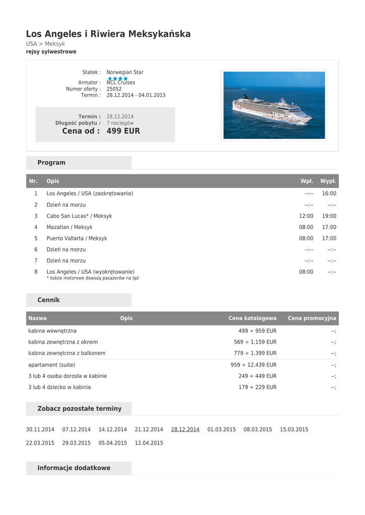 Los Angeles i Riwiera Meksykańska USA > Meksyk rejsy sylwestrowe Statek : Armator : Numer oferty : Termin : Termin : Długość pobytu : Norwegian Star NCL Cruises 25052 28.12.2014 - 04.01.2015 28.12.2014 7 noclegów Cena od : 499 EUR Program Nr. Opis Wpł. Wypł. 1 Los Angeles / USA (zaokrętowanie) --:-- 16:00 2 Dzień na morzu --:-- --:-- 3 Cabo San Lucas* / Meksyk 12:00 19:00 4 Mazatlan / Meksyk 08:00 17:00 5 Puerto Vallarta / Meksyk 08:00 17:00 6 Dzień na morzu --:-- --:-- 7 Dzień na morzu --:-- --:-- 8 Los Angeles / USA (wyokrętowanie) 08:00 --:-- * łodzie motorowe dowożą pasażerów na ląd Cennik Nazwa Opis Cena katalogowa Cena promocyjna 499 ÷ 959 EUR --; kabina zewnętrzna z oknem 569 ÷ 1.159 EUR --; kabina zewnętrzna z balkonem 779 ÷ 1.399 EUR --; 959 ÷ 12.439 EUR --; 3 lub 4 osoba dorosła w kabinie 249 ÷ 449 EUR --; 3 lub 4 dziecko w kabinie 179 ÷ 229 EUR --; kabina wewnętrzna apartament (suite) Zobacz pozostałe terminy 30.11.2014 07.12.2014 14.12.2014 21.12.2014 22.03.2015 29.03.2015 05.04.2015 12.04.2015 Informacje dodatkowe 28.12.2014 01.03.2015 08.03.2015 15.03.2015 cena obejmuje: zakwaterowanie w kabinie wybranej kategorii (7 noclegów); serwis bagażowy i kabinowy; wyżywienie – 3 główne posiłki, przekąski między posiłkami, bufet lub przekąski o północy; korzystanie z basenu i innych urządzeń sportowo-rekreacyjnych; udział we wszystkich imprezach organizowanych na statku; opłaty portowe. cena nie obejmuje: kosztów dojazdu do portu; ewentualnych noclegów w hotelu przed/po rejsie i transferów (na zapytanie); wycieczek fakultatywnych; korzystania z punktów usługowych (pralnia, fotograf, salon piękności i odnowy biologicznej, internet); napojów do obiadów i kolacji, drinków oraz napiwków obowiązkowych dla obsługi statku (ok. 12 USD/os./dzień); ubezpieczenia KL, NW i bagażu. uwagi: kabiny 3/4 osobowe nie są dostępne we wszystkich kategoriach, a ich liczba jest ograniczona – sprzedaż tylko po potwierdzeniu; propozycje dojazdu do portu, hoteli przed/po rejsie na zapytanie. Ceny minimalne są podane tylko w celach orientacyjnych. Ceny są "płynne" i codziennie ulegają zmianom. Aby uzyskać najkorzystniejszą cenę w danym dniu, skontaktuj się z nami 0 801 000 351.