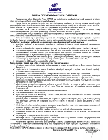 FABRYKA OPAKOWAŃ TEKTUROWYCH POLITYKA ZINTEGROWANEGO SYSTEMU ZARZĄDZANIA Podstawowym celem działalności Firmy ADAM’S jest projektowanie, produkcja i sprzedaż opakowań z tektury falistej o zróżnicowanej formie konstrukcyjnej oraz kolorystyce. Naszą filozofią od początku istnienia firmy jest doskonalenie współpracy z klientem poprzez przewidywanie oraz spełnianie jego potrzeb i wymagań, ciągłe podnoszenie poziomu jakości produkowanych i dostarczanych wyrobów, dbałość o bezpieczne i higieniczne warunki pracy oraz poprawa oddziaływania na środowisko naturalne. Przewagę nad konkurencją uzyskujemy dzięki elastyczności w dostosowaniu się do potrzeb klienta, której wyznacznikiem jest system „just in time” pozwalający realizować zamówienia w czasie 48 godzin. Doświadczenie zdobyte przez nas na rynku opakowań gwarantuje nie tylko wysoką jakość produktów, ale i obsługi klienta, świadczonej przez wykwalifikowany personel. Firma zobowiązuje się do przestrzegania prawa, zasad współżycia społecznego, dobrych obyczajów i wysokich standardów etycznych. Uznaje również, że wolna i uczciwa konkurencja jest wartością warunkującą wzrost gospodarczy. Politykę firmy zamierzamy realizować poprzez osiągnięcie następujących celów strategicznych: produkcja opakowań o parametrach jakościowych spełniających kryteria nawet najbardziej wymagających klientów, unowocześnianie i rozbudowywanie parku maszynowego, by dostarczać produkty zgodne z trendami rynkowymi, doskonalenie współpracy z klientami i wzrost ich zadowolenia oraz budowa partnerskich stosunków ze wszystkimi zainteresowanymi stronami, również tych wykraczających poza sprzedaż produktów, opartych na uczciwym, otwartym dialogu, na wymianie informacji i opinii na temat oferowanych produktów, zapewnienie pracownikom Firmy uczciwej pracy i godziwego wynagrodzenia, a także bezpiecznych i zdrowych warunków pracy, stymulujących twórczą postawę, samodyscyplinę i otwartość wobec innych ludzi, stała poprawa oddziaływania na środowisko naturalne. Realizacja naszej filozofii oraz celów strategicznych jest wspierana poprzez: nieustanne doskonalenie skuteczności funkcjonującego w naszym przedsiębiorstwie Zintegrowanego Systemu Zarządzania, ciągłe śledzenie i stosowanie w naszej działalności aktualnych wymagań, przepisów, norm i innych regulacji, a także trendów i postępu technicznego, prowadzenie oceny zadowolenia klientów i podejmowanie działań na rzecz wzrostu tego zadowolenia, poszanowanie i docenianie klientów, współpracowników, współwłaścicieli, dostawców i społeczności, w których pracujemy i mieszkamy w trosce o ich dobrobyt i w miarę możliwości przykładanie się do jego pomnażania, ustalenie i aktualizowanie szczegółowych celów Zintegrowanego Systemu Zarządzania na wszystkich poziomach zarządzania i dla wszystkich funkcji, uświadamianie pracownikom znaczenia spełniania wymagań klientów i wymagań przepisów prawnych, norm etycznych oraz innych wymagań, do których nasza Firma się zobowiązała i które dotyczą naszych aspektów środowiskowych, tworzenie warunków zaangażowania pracowników w osiąganie celów, doskonalenie współpracy z dostawcami, systematyczne podnoszenie kwalifikacji i doświadczenia personelu oraz uświadamianie znaczenia kierowania się najwyższymi normami etycznymi, podtrzymywanie świadomości pracowników, że ich postawa etyczna jest integralną częścią ich postawy życiowej i ma decydujący wpływ na ich osiągnięcia zawodowe i osobiste, w trakcie i po ustaniu zatrudnienia w Firmie ADAM’S, identyfikowanie, planowanie i zarządzanie procesami, ich powiązaniami oraz systematyczną ocenę skuteczności procesów włącznie z procesami ciągłego doskonalenia, zapewnienie dostarczania wszystkich zasobów niezbędnych do realizacji założonych celów zobowiązań, prowadzenie działalności w sposób przyjazny dla środowiska naturalnego oraz dla zdrowia i bezpieczeństwa pracowników, zapobieganie zanieczyszczeniom środowiska naturalnego. Realizacja Polityki Zintegrowanego Systemu Zarządzania oraz funkcjonowanie systemu będą systematycznie nadzorowane poprzez audity wewnętrzne i przeglądy zarządzania. Kierownictwo zapewnia, że Polityka Zintegrowanego Systemu Zarządzania jest zakomunikowana, realizowana i doskonalona na wszystkich szczeblach organizacji oraz przeglądana pod kątem jej ciągłej przydatności i adekwatności do celów przedsiębiorstwa. Właściciel Firmy ADAM’S jest odpowiedzialny za ustanowienie i realizację polityki Zintegrowanego Systemu Zarządzania. Baranowo, dnia 19 lipca 2010 roku Adam Skrzyniarz Właściciel
