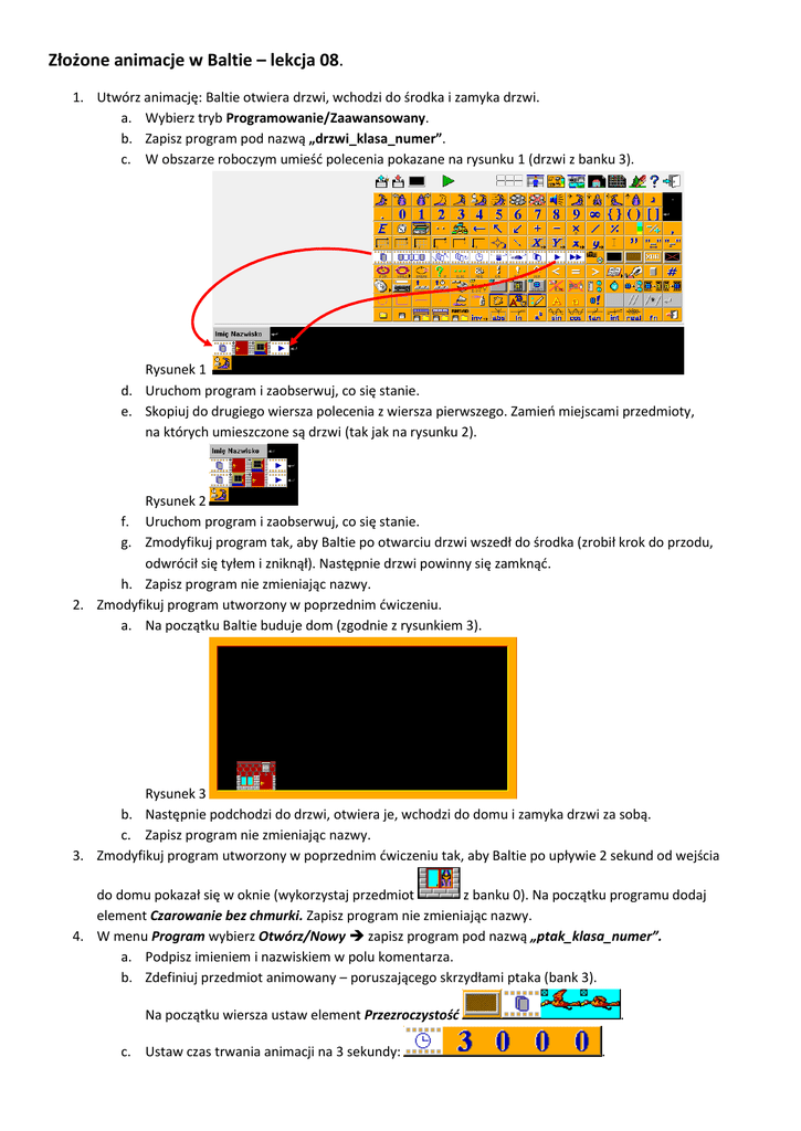 Złożone animacje w Baltie – lekcja 08. 1. Utwórz animację: Baltie otwiera drzwi, wchodzi do środka i zamyka drzwi. a. Wybierz tryb Programowanie/Zaawansowany. b. Zapisz program pod nazwą „drzwi_klasa_numer”. c. W obszarze roboczym umieść polecenia pokazane na rysunku 1 (drzwi z banku 3). Rysunek 1 d. Uruchom program i zaobserwuj, co się stanie. e. Skopiuj do drugiego wiersza polecenia z wiersza pierwszego. Zamień miejscami przedmioty, na których umieszczone są drzwi (tak jak na rysunku 2). Rysunek 2 f. Uruchom program i zaobserwuj, co się stanie. g. Zmodyfikuj program tak, aby Baltie po otwarciu drzwi wszedł do środka (zrobił krok do przodu, odwrócił się tyłem i zniknął). Następnie drzwi powinny się zamknąć. h. Zapisz program nie zmieniając nazwy. 2. Zmodyfikuj program utworzony w poprzednim ćwiczeniu. a. Na początku Baltie buduje dom (zgodnie z rysunkiem 3). Rysunek 3 b. Następnie podchodzi do drzwi, otwiera je, wchodzi do domu i zamyka drzwi za sobą. c. Zapisz program nie zmieniając nazwy. 3. Zmodyfikuj program utworzony w poprzednim ćwiczeniu tak, aby Baltie po upływie 2 sekund od wejścia do domu pokazał się w oknie (wykorzystaj przedmiot z banku 0). Na początku programu dodaj element Czarowanie bez chmurki. Zapisz program nie zmieniając nazwy. 4. W menu Program wybierz Otwórz/Nowy zapisz program pod nazwą „ptak_klasa_numer”. a. Podpisz imieniem i nazwiskiem w polu komentarza. b. Zdefiniuj przedmiot animowany – poruszającego skrzydłami ptaka (bank 3). Na początku wiersza ustaw element Przezroczystość c. Ustaw czas trwania animacji na 3 sekundy: . . d. Ustaw początek animacji w prawym górnym rogu sceny (ptak stamtąd rozpocznie lot): . e. Na końcu wiesza umieść element Odtwarzaj animację f. . Program powinien wyglądać następująco: . Uruchom animację. Ptak kończy lot w polu przed Baltiem, ponieważ nie określiliśmy współrzędnych końca animacji. g. Określ współrzędne końca animacji, dodając polecenia: Program powinien wyglądać następująco: . . h. Ptak zakończy lot w czwartej kolumnie i szóstym wierszu. i. Zapisz program nie zmieniając nazwy (jeszcze nie zamykaj programu!!!). Łączenie kilku animacji w jeden program. 5. W programie „ptak” w menu Edycja wybierz Zaznacz blok. Zaznacz wszystkie elementy drugiego wiersza programu (od przezroczystość do znaku końca wiersza włącznie). Skopiuj zaznaczone elementy (Edycja Kopiuj albo naciśnij Ctrl + C). a. Zamknij program Baltie. b. Otwórz program „drzwi”. c. Wklej skopiowane wcześniej elementy w przedostatnim wierszu programu, przed poleceniem Czekaj. d. Uruchom program i sprawdź, co się zmieniło. e. Zmień współrzędne początku i końca lotu ptaka tak, aby zaczynał on lot w prawym górnym rogu sceny, a kończył tuż nad dachem domu (jak na rysunku 4 poniżej). f. Zapisz program pod nazwą „łączenie_klasa_numer” (wybierz w menu Program Zapisz jako). 6. Dodaj animację idącego konika. Konik powinien ruszyć z prawego dolnego rogu sceny i zatrzymać się obok budynku. Przedmioty do animacji konia znajdziesz w banku 10. a. Dodaj numer 2 do animacji ptaka i numer 3 do animacji konika. b. W celu zwiększenia płynności animacji ustaw liczbę powtórzeń faz animacji na 8, dodając element Liczba powtórzeń : c. Uruchom program. Po wykonaniu programu z animacjami na scenie powinien pojawić się obraz jak na rysunku 4. Zmodyfikuj odpowiednio punkty początku i końca animacji. Rysunek 4 d. Zapisz program nie zmieniając nazwy i wyślij plik do oceny.
