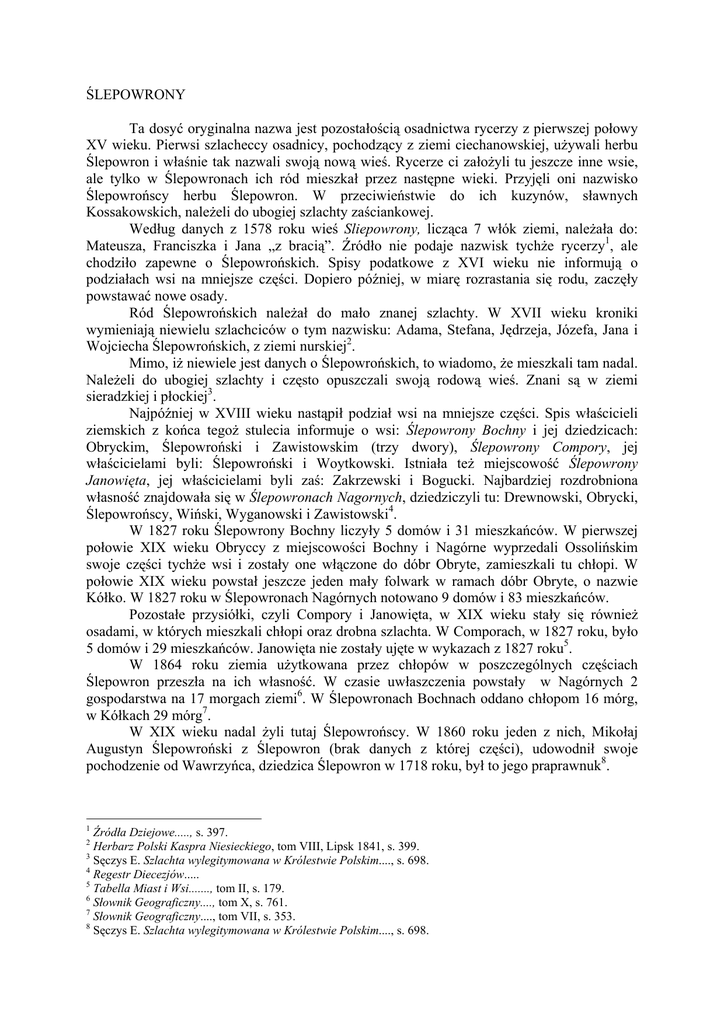 ŚLEPOWRONY Ta dosyć oryginalna nazwa jest pozostałością osadnictwa rycerzy z pierwszej połowy XV wieku. Pierwsi szlacheccy osadnicy, pochodzący z ziemi ciechanowskiej, używali herbu Ślepowron i właśnie tak nazwali swoją nową wieś. Rycerze ci założyli tu jeszcze inne wsie, ale tylko w Ślepowronach ich ród mieszkał przez następne wieki. Przyjęli oni nazwisko Ślepowrońscy herbu Ślepowron. W przeciwieństwie do ich kuzynów, sławnych Kossakowskich, należeli do ubogiej szlachty zaściankowej. Według danych z 1578 roku wieś Sliepowrony, licząca 7 włók ziemi, należała do: Mateusza, Franciszka i Jana „z bracią”. Źródło nie podaje nazwisk tychże rycerzy1, ale chodziło zapewne o Ślepowrońskich. Spisy podatkowe z XVI wieku nie informują o podziałach wsi na mniejsze części. Dopiero później, w miarę rozrastania się rodu, zaczęły powstawać nowe osady. Ród Ślepowrońskich należał do mało znanej szlachty. W XVII wieku kroniki wymieniają niewielu szlachciców o tym nazwisku: Adama, Stefana, Jędrzeja, Józefa, Jana i Wojciecha Ślepowrońskich, z ziemi nurskiej2. Mimo, iż niewiele jest danych o Ślepowrońskich, to wiadomo, że mieszkali tam nadal. Należeli do ubogiej szlachty i często opuszczali swoją rodową wieś. Znani są w ziemi sieradzkiej i płockiej3. Najpóźniej w XVIII wieku nastąpił podział wsi na mniejsze części. Spis właścicieli ziemskich z końca tegoż stulecia informuje o wsi: Ślepowrony Bochny i jej dziedzicach: Obryckim, Ślepowroński i Zawistowskim (trzy dwory), Ślepowrony Compory, jej właścicielami byli: Ślepowroński i Woytkowski. Istniała też miejscowość Ślepowrony Janowięta, jej właścicielami byli zaś: Zakrzewski i Bogucki. Najbardziej rozdrobniona własność znajdowała się w Ślepowronach Nagornych, dziedziczyli tu: Drewnowski, Obrycki, Ślepowrońscy, Wiński, Wyganowski i Zawistowski4. W 1827 roku Ślepowrony Bochny liczyły 5 domów i 31 mieszkańców. W pierwszej połowie XIX wieku Obryccy z miejscowości Bochny i Nagórne wyprzedali Ossolińskim swoje części tychże wsi i zostały one włączone do dóbr Obryte, zamieszkali tu chłopi. W połowie XIX wieku powstał jeszcze jeden mały folwark w ramach dóbr Obryte, o nazwie Kółko. W 1827 roku w Ślepowronach Nagórnych notowano 9 domów i 83 mieszkańców. Pozostałe przysiółki, czyli Compory i Janowięta, w XIX wieku stały się również osadami, w których mieszkali chłopi oraz drobna szlachta. W Comporach, w 1827 roku, było 5 domów i 29 mieszkańców. Janowięta nie zostały ujęte w wykazach z 1827 roku5. W 1864 roku ziemia użytkowana przez chłopów w poszczególnych częściach Ślepowron przeszła na ich własność. W czasie uwłaszczenia powstały w Nagórnych 2 gospodarstwa na 17 morgach ziemi6. W Ślepowronach Bochnach oddano chłopom 16 mórg, w Kółkach 29 mórg7. W XIX wieku nadal żyli tutaj Ślepowrońscy. W 1860 roku jeden z nich, Mikołaj Augustyn Ślepowroński z Ślepowron (brak danych z której części), udowodnił swoje pochodzenie od Wawrzyńca, dziedzica Ślepowron w 1718 roku, był to jego praprawnuk8. 1 Źródła Dziejowe....., s. 397. Herbarz Polski Kaspra Niesieckiego, tom VIII, Lipsk 1841, s. 399. 3 Sęczys E. Szlachta wylegitymowana w Królestwie Polskim...., s. 698. 4 Regestr Diecezjów..... 5 Tabella Miast i Wsi......., tom II, s. 179. 6 Słownik Geograficzny...., tom X, s. 761. 7 Słownik Geograficzny...., tom VII, s. 353. 8 Sęczys E. Szlachta wylegitymowana w Królestwie Polskim...., s. 698. 2 Słownik Geograficzny Królestwa Polskiego z 1888 roku informuje o wsiach: Bochny, Compory i Nagórne. Compory były wsią mieszaną, włościańsko-szlachecką. W 1889 roku żyły tu trzy rodziny szlacheckie i 18 mieszkańców tego stanu9. Dane z 1891 roku informują, iż wieś dzieliła się mniejsze osiedla: Ślepowrony Nagórne, Bochny, Compory i Janowięta. W Nagórnych żyło 8 chłopskich gospodarzy i 5 szlacheckich, szlachcice posiadali 130 ha ziemi. W Ślepowronach Bochny było 2 drobnoszlacheckich gospodarzy i 130 ha ziemi. W Comporach naliczono 4 drobnoszlacheckich gospodarzy. Natomiast w Jankowiętach - dwóch gospodarzy, przy czym jeden z nich posiadał dwór. W sumie użytkowali 80 ha ziemi w tej wsi10. Spis powszechny z 1921 roku wspomina o następujących wsiach, mających w nazwie Ślepowrony: Bochny - liczące 5 domów i 27 mieszkańców, Cempory - z 11 domami i 63 mieszkańcami oraz Nagórne - liczące 14 domów i 81 mieszkańców11. Na mapie z okresu międzywojennego można jeszcze odnaleźć miejscowość Kółko, liczące 5 domów (stan na 1935 rok), brak jest miejscowości Janowięta. 9 Słownik Geograficzny...., tom X, s. 761. Dajnowicz W, Drobna szlachta....., s. 234. 11 Skorowidz......, s. 65. 10