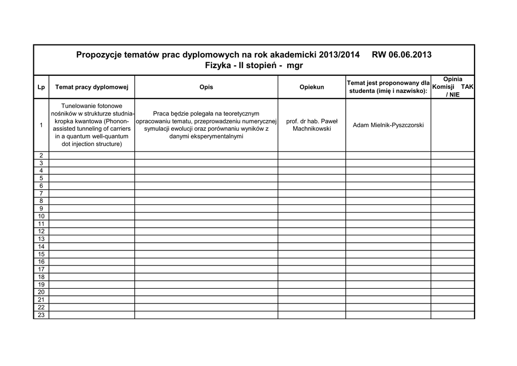 Propozycje tematów prac dyplomowych na rok akademicki 2013/2014 Fizyka - II stopień - mgr Lp 1 2 3 4 5 6 7 8 9 10 11 12 13 14 15 16 17 18 19 20 21 22 23 Temat pracy dyplomowej Opis Tunelowanie fotonowe nośników w strukturze studniaPraca będzie polegała na teoretycznym kropka kwantowa (Phonon- opracowaniu tematu, przeprowadzeniu numerycznej assisted tunneling of carriers symulacji ewolucji oraz porównaniu wyników z in a quantum well-quantum danymi eksperymentalnymi dot injection structure) Opiekun prof. dr hab. Paweł Machnikowski RW 06.06.2013 Opinia Temat jest proponowany dla Komisji TAK studenta (imię i nazwisko): / NIE Adam Mielnik-Pyszczorski 24 25 26 27 28 29 30 31 32 33 34 35 36 37 38 39 40 41 42 43 44 45 46 47 48 49 50 51 52 53 54 55 56 57 58 59 60 61 62 63 64 65 66 67 68 69 70 71 72 73 74 75 76 77 78 79 80 81 82 83 84 85 86 87 88 89 90 91 92 93 94 95 96 97 98 99 100 101 102 103 104 105 106 107 108 109 110 111 112 113 114 115 116 117 118 119 120 121 122 123 124 125 126 127 128 129 130 131 132 133 134 135 136 137 138 139 140 141 142 143 144 145 146 147 148 149 150 151 152 153 154 155 156 157 158 159 160 161 162 163 164 165 166 167 168 169 170 171 172 173 174 175 176 177 178 179 180 181 182 183 184 185 186 187 188 189 190 191 192 193 194 195 196 197 198 199 200 201 202 203 204 205 206 207 208 209 210 211 212 213 214 215 216 217 218 219 220 221 222 223 224 225 226 227 228 229 230 231 232 233 234 235 236 237 238 239 240 241 242 243 244 245 246 247 248 249 250 251 252 253 254 255 256 257 258 259 260 261 262 263 264 265 266 267 268 269 270 271 272 273 274 275 276 277 278 279 280 281 282 283 284 285 286 287 288 289 290 291 292 293 294 295 296 297 298 Fizyka Techniczna - Nanoinżynieria - II stopień mgr Lp Temat pracy dyplomowej Opis Opiekun Temat jest proponowany dla studenta (imię i nazwisko): 1 Symulacja emisji spontanicznej z układu kropek kwantowych w nieidealnym rezonatorze optycznym Praca będzie polegała na teoretycznym opracowaniu tematu, przeprowadzeniu numerycznej symulacji ewolucji oraz porównaniu wyników z danymi eksperymentalnymi prof. dr hab. Paweł Machnikowski Maciej Jaworski 2 3 4 5 6 7 8 9 10 11 12 13 14 15 16 17 18 19 20 21 22 23 24 25 Opinia Komisji TAK / NIE 26 27 28 29 30 31 32 33 34 35 36 37 38 39 40 41 42 43 44 45 46 47 48 49 50 51 52 53 54 55 56 57 58 59 60 61 62 63 64 65 66 67 68 69 70 71 72 73 74 75 76 77 78 79 80 81 82 83 84 85 86 87 88 89 90 91 92 93 94 95 96 97 98 99 100 101 102 103 104 105 106 107 108 109 110 111 112 113 114 115 116 117 118 119 120 121 122 123 124 125 126 127 128 129 130 131 132 133 134 135 136 137 138 139 140 141 142 143 144 145 146 147 148 149 150 151 152 153 154 155 156 157 158 159 160 161 162 163 164 165 166 167 168 169 170 171 172 173 174 175 176 177 178 179 180 181 182 183 184 185 186 187 188 189 190 191 192 193 194 195 196 197 198 199 200 201 202 203 204 205 206 207 208 209 210 211 212 213 214 215 216 217 218 219 220 221 222 223 224 225 226 227 228 229 230 231 232 233 234 235 236 237 238 239 240 241 242 243 244 245 246 247 248 249 250 251 252 253 254 255 256 257 258 259 260 261 262 263 264 265 266 267 268 269 270 271 272 273 274 275 276 277 278 279 280 281 282 283 284 285 286 287 288 289 290 291 292 293 294 295 296 297 298 Fizyka Techniczna - Nanoinżynieria - inż. Lp 1 2 3 Temat pracy dyplomowej Opis Opis i wymagania: W ramach pracy planuje się zapisanie siatek Bragga metodą maski fazowej w Wytworzenie oraz światłowodach polimerowych zoptymalizowanych charakteryzacja siatek Bragga do wybranych zastosowań pomiarowych oraz w światłowodach polimerowych przeprowadzenie badań właściwości zoptymalizowanych do metrologicznych wytworzonych siatek. wybranych zastosowań Wymagane predyspozycje do pracy pomiarowych eksperymentalnej oraz umiejętność wykorzystania komputera do przetwarzania danych pomiarowych. Celem pracy jest zbadanie optycznych właściwości studni kwantowych InAs/AlSb/InAs/GaInSb/InAs/AlSb o różnej szerokości warstw (InAs) wiążących elektrony. W Optyczne właściwości studni tym celu przeprowadzone zostaną pomiary kwantowych II rodzaju osadzonych na podłożu InAs fotoluminescencyjne i fotoodbiciowe w szerokim zakresie spektralnym, realizowane w układzie pomiarowym wykorzystującym spektrometr Fouriera. Celem pracy jest wykonanie optycznych pomiarów takich jak temperaturowa zależność Optyczne właściwości supersieci InAs/GaSb badane fotoluminescencji oraz pomiarów przy pomocy spektroskopii fotoodbiciowych, celem uzyskania informacji o Fourierowskiej strukturze energetycznej skwantowanych poziomów energetycznych. Opiekun Temat jest proponowany dla studenta (imię i nazwisko): dr inż.. Gabriela StatkiewiczBarabach Dudzik Michał dr inż. Marcin Motyka Kobus Piotr dr inż. Marcin Motyka Mateusz Kłys Opinia Komisji TAK / NIE 4 5 6 7 8 9 10 11 12 Tematyka pracy dotyczy badań nad dynamiką par elektron-dziura w nowym typie struktur kwantowych - kresek kwantowych - wykonanych w technologii tworzenia z wiązki molekularnej z Rozdzielcza w czasie materiału InAs na podłożu InP. Struktury te spektroskopia kwaziprzewidziane są do zastosowań w laserach i zerowymiarowych struktur wzmacniaczach telekomunikacyjnych kwantowych kwantowych na emitujących w zakresie spektralnym od 1.3 do 1.5 bazie InAs/InP emitujących w mikrometra. Dynamika par elektron-dziura w tego zakresie pliskiej podczerwieni. typu strukturach jest ciągle słabo poznana, a realizacja pracy może przybliżyć niektóre z wybranych jej aspektów. Tematyka pracy dotyczy konstrukcji układu do pomiaru sygnału fotoluminescencji z małego obszaru przestrzennego (rzędu mikrometrów kwadratowych ) oraz zastosowania tego układu do pomiaru sygnału fotoluminescencji z półprzewodnika warstwowego ReS2. Fotoluminescencja Półprzewodnik ten ma własności podobne do półprzewodników warstwowych grafenu, ale w przeciwieństwie do niego, posiada na bazie ReS2 przerwę energetyczną i daje się domieszkować. W istniejącej 