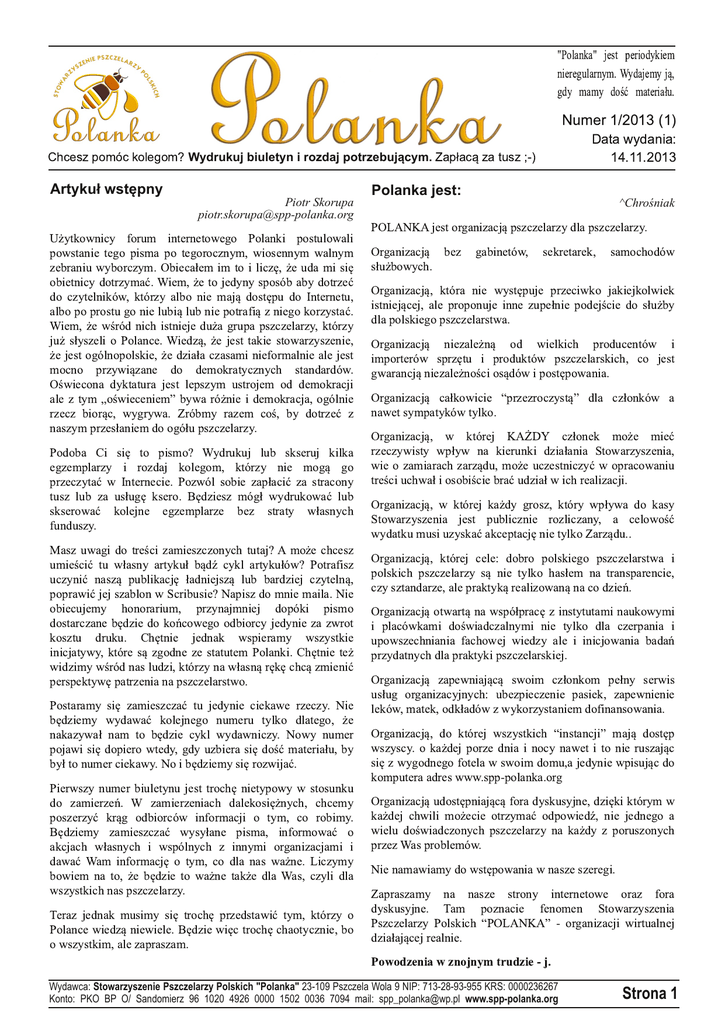 "Polanka" jest periodykiem nieregularnym. Wydajemy ją, gdy mamy dość materiału. Numer 1 /201 3 (1 ) Chcesz pomóc kolegom? Wydrukuj biuletyn i rozdaj potrzebującym. Zapłacą za tusz ;-) Artykuł wstępny Piotr Skorupa piotr.skorupa@spppolanka.org Użytkownicy forum internetowego Polanki postulowali powstanie tego pisma po tegorocznym, wiosennym walnym zebraniu wyborczym. Obiecałem im to i liczę, że uda mi się obietnicy dotrzymać. Wiem, że to jedyny sposób aby dotrzeć do czytelników, którzy albo nie mają dostępu do Internetu, albo po prostu go nie lubią lub nie potrafią z niego korzystać. Wiem, że wśród nich istnieje duża grupa pszczelarzy, którzy już słyszeli o Polance. Wiedzą, że jest takie stowarzyszenie, że jest ogólnopolskie, że działa czasami nieformalnie ale jest mocno przywiązane do demokratycznych standardów. Oświecona dyktatura jest lepszym ustrojem od demokracji ale z tym „oświeceniem” bywa różnie i demokracja, ogólnie rzecz biorąc, wygrywa. Zróbmy razem coś, by dotrzeć z naszym przesłaniem do ogółu pszczelarzy. Podoba Ci się to pismo? Wydrukuj lub skseruj kilka egzemplarzy i rozdaj kolegom, którzy nie mogą go przeczytać w Internecie. Pozwól sobie zapłacić za stracony tusz lub za usługę ksero. Będziesz mógł wydrukować lub skserować kolejne egzemplarze bez straty własnych funduszy. Masz uwagi do treści zamieszczonych tutaj? A może chcesz umieścić tu własny artykuł bądź cykl artykułów? Potrafisz uczynić naszą publikację ładniejszą lub bardziej czytelną, poprawić jej szablon w Scribusie? Napisz do mnie maila. Nie obiecujemy honorarium, przynajmniej dopóki pismo dostarczane będzie do końcowego odbiorcy jedynie za zwrot kosztu druku. Chętnie jednak wspieramy wszystkie inicjatywy, które są zgodne ze statutem Polanki. Chętnie też widzimy wśród nas ludzi, którzy na własną rękę chcą zmienić perspektywę patrzenia na pszczelarstwo. Postaramy się zamieszczać tu jedynie ciekawe rzeczy. Nie będziemy wydawać kolejnego numeru tylko dlatego, że nakazywał nam to będzie cykl wydawniczy. Nowy numer pojawi się dopiero wtedy, gdy uzbiera się dość materiału, by był to numer ciekawy. No i będziemy się rozwijać. Pierwszy numer biuletynu jest trochę nietypowy w stosunku do zamierzeń. W zamierzeniach dalekosiężnych, chcemy poszerzyć krąg odbiorców informacji o tym, co robimy. Będziemy zamieszczać wysyłane pisma, informować o akcjach własnych i wspólnych z innymi organizacjami i dawać Wam informację o tym, co dla nas ważne. Liczymy bowiem na to, że będzie to ważne także dla Was, czyli dla wszystkich nas pszczelarzy. Teraz jednak musimy się trochę przedstawić tym, którzy o Polance wiedzą niewiele. Będzie więc trochę chaotycznie, bo o wszystkim, ale zapraszam. Data wydania: 1 4.11 .201 3 Polanka jest: ^Chrośniak POLANKA jest organizacją pszczelarzy dla pszczelarzy. Organizacją bez gabinetów, sekretarek, samochodów służbowych. Organizacją, która nie występuje przeciwko jakiejkolwiek istniejącej, ale proponuje inne zupełnie podejście do służby dla polskiego pszczelarstwa. Organizacją niezależną od wielkich producentów i importerów sprzętu i produktów pszczelarskich, co jest gwarancją niezależności osądów i postępowania. Organizacją całkowicie “przezroczystą” dla członków a nawet sympatyków tylko. Organizacją, w której KAŻDY członek może mieć rzeczywisty wpływ na kierunki działania Stowarzyszenia, wie o zamiarach zarządu, może uczestniczyć w opracowaniu treści uchwał i osobiście brać udział w ich realizacji. Organizacją, w której każdy grosz, który wpływa do kasy Stowarzyszenia jest publicznie rozliczany, a celowość wydatku musi uzyskać akceptację nie tylko Zarządu.. Organizacją, której cele: dobro polskiego pszczelarstwa i polskich pszczelarzy są nie tylko hasłem na transparencie, czy sztandarze, ale praktyką realizowaną na co dzień. Organizacją otwartą na współpracę z instytutami naukowymi i placówkami doświadczalnymi nie tylko dla czerpania i upowszechniania fachowej wiedzy ale i inicjowania badań przydatnych dla praktyki pszczelarskiej. Organizacją zapewniającą swoim członkom pełny serwis usług organizacyjnych: ubezpieczenie pasiek, zapewnienie leków, matek, odkładów z wykorzystaniem dofinansowania. Organizacją, do której wszystkich “instancji” mają dostęp wszyscy. o każdej porze dnia i nocy nawet i to nie ruszając się z wygodnego fotela w swoim domu,a jedynie wpisując do komputera adres www.spp-polanka.org Organizacją udostępniającą fora dyskusyjne, dzięki którym w każdej chwili możecie otrzymać odpowiedź, nie jednego a wielu doświadczonych pszczelarzy na każdy z poruszonych przez Was problemów. Nie namawiamy do wstępowania w nasze szeregi. Zapraszamy na nasze strony internetowe oraz fora dyskusyjne. Tam poznacie fenomen Stowarzyszenia Pszczelarzy Polskich “POLANKA” - organizacji wirtualnej działającej realnie. Powodzenia w znojnym trudzie - j. Wydawca: Stowarzyszenie Pszczelarzy Polskich "Polanka" 23109 Pszczela Wola 9 NIP: 7132893955 KRS: 0000236267 Konto: PKO BP O/ Sandomierz 96 1020 4926 0000 1502 0036 7094 mail: [email protected] www.spppolanka.org Strona 1 Apimondia 2013 relacja subiektywna Piotr Skorupa Zaczęło się od kolejki. My stoimy na końcu, więc centymetrowych kawałków plastikowej rurki zapowiadało się, że postoimy z 5 godzin. Takie mieliśmy hydraulicznej przeciętych wzdłuż, były to jedyne chyba informacje bo tak długo czekano w kolejce dzień wcześniej – rozwiązania gospodarcze. Oczywiście wnętrze topiarki w dniu otwarcia targów. Cała zabawa z wcześniejszą wykonane było ze stali nierdzewnej. rezerwacją wejściówek była więc psu na budę, bo ◊ Litewskie maszyny do pozyskiwania pierzgi. Wersja mini organizatorzy musieli zarejestrować każdego odwiedzającego w cenie 122 euro. Zarówno duża maszyna 