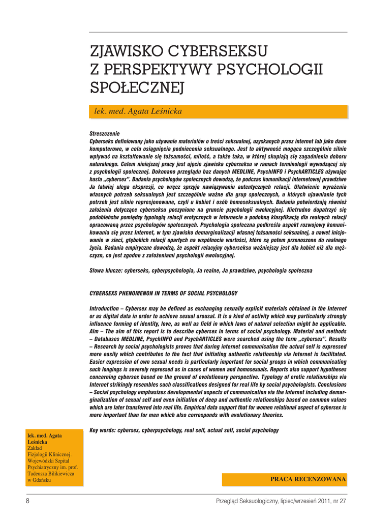 ZJAWISKO CYBERSEKSU Z PERSPEKTYWY PSYCHOLOGII SPO¸ECZNEJ lek. med. Agata LeÊnicka Streszczenie Cyberseks definiowany jako u˝ywanie materia∏ów o treÊci seksualnej, uzyskanych przez internet lub jako dane komputerowe, w celu osiàgni´cia podniecenia seksualnego. Jest to aktywnoÊç mogàca szczególnie silnie wp∏ywaç na kszta∏towanie si´ to˝samoÊci, mi∏oÊç, a tak˝e taka, w której skupiajà si´ zagadnienia doboru naturalnego. Celem niniejszej pracy jest uj´cie zjawiska cyberseksu w ramach terminologii wywodzàcej si´ z psychologii spo∏ecznej. Dokonano przeglàdu baz danych MEDLINE, PsychINFO i PsychARTICLES u˝ywajàc has∏a „cybersex”. Badania psychologów spo∏ecznych dowodzà, ˝e podczas komunikacji internetowej prawdziwe Ja ∏atwiej ulega ekspresji, co wr´cz sprzyja nawiàzywaniu autentycznych relacji. U∏atwienie wyra˝enia w∏asnych potrzeb seksualnych jest szczególnie wa˝ne dla grup spo∏ecznych, u których ujawnianie tych potrzeb jest silnie represjonowane, czyli u kobiet i osób homoseksualnych. Badania potwierdzajà równie˝ za∏o˝enia dotyczàce cyberseksu poczynione na gruncie psychologii ewolucyjnej. Nietrudno dopatrzyç si´ podobieƒstw pomi´dzy typologià relacji erotycznych w Internecie a podobnà klasyfikacjà dla realnych relacji opracowanà przez psychologów spo∏ecznych. Psychologia spo∏eczna podkreÊla aspekt rozwojowy komunikowania si´ przez Internet, w tym zjawisko demarginalizacji w∏asnej to˝samoÊci seksualnej, a nawet inicjowanie w sieci, g∏´bokich relacji opartych na wspólnocie wartoÊci, które sà potem przenoszone do realnego ˝ycia. Badania empiryczne dowodzà, ˝e aspekt relacyjny cyberseksu wa˝niejszy jest dla kobiet ni˝ dla m´˝czyzn, co jest zgodne z za∏o˝eniami psychologii ewolucyjnej. S∏owa klucze: cyberseks, cyberpsychologia, Ja realne, Ja prawdziwe, psychologia spo∏eczna CYBERSEXS PHENOMENON IN TERMS OF SOCIAL PSYCHOLOGY Introduction – Cybersex may be defined as exchanging sexually explicit materials obtained in the Internet or as digital data in order to achieve sexual arousal. It is a kind of activity which may particularly strongly influence forming of identity, love, as well as field in which laws of natural selection might be applicable. Aim – The aim of this report is to describe cybersex in terms of social psychology. Material and methods – Databases MEDLINE, PsychINFO and PsychARTICLES were searched using the term „cybersex”. Results – Research by social psychologists proves that during internet communication the actual self is expressed more easily which contributes to the fact that initiating authentic relationship via Internet is facilitated. Easier expression of own sexual needs is particularly important for social groups in which communicating such longings is severely repressed as in cases of women and homosexuals. Reports also support hypotheses concerning cybersex based on the ground of evolutionary perspective. Typology of erotic relationships via Internet strikingly resembles such classifications designed for real life by social psychologists. Conclusions – Social psychology emphasizes developmental aspects of communication via the Internet including demarginalization of sexual self and even initiation of deep and authentic relationships based on common values which are later transferred into real life. Empirical data support that for women relational aspect of cybersex is more important than for men which also corresponds with evolutionary theories. Key words: cybersex, cyberpsychology, real self, actual self, social psychology lek. med. Agata LeÊnicka Zak∏ad Fizjologii Klinicznej. Wojewódzki Szpital Psychiatryczny im. prof. Tadeusza Bilikiewicza w Gdaƒsku 8 PRACA RECENZOWANA Przeglàd Seksuologiczny, lipiec/wrzesieƒ 2011, nr 27 WST¢P WYNIKI Cyberseks jest zjawiskiem stosunkowo nowym, które rozpowszechni∏o si´ wraz z popularyzacjà dost´pu do Internetu. Istnieje on od lat 80-tych XX wieku i jest definiowany jako u˝ywanie materia∏ów o treÊci seksualnej (obrazy, dêwi´ki, tekst) uzyskanych przez Internet, albo jako dane komputerowe, z intencjà osiàgni´cia podniecenia seksualnego [1,2]. Wraz ze wzrostem popularnoÊci komunikowania si´ przez sieç, wzrasta równie˝ znaczenie jego wp∏ywu na kszta∏towanie si´ i rozwijanie to˝samoÊci u˝ytkowników Internetu, a tak˝e zmiany w zakresie seksualnoÊci cz∏owieka jakie wywiera sam cyberseks. Alvin Cooper opracowa∏ koncepcj´ „mechanizmu trzech A” (triple A engine) wyjaÊniajàcà olbrzymie mo˝liwoÊci seksualne kreowane przez Internet. Cooper zwróci∏ uwag´ na to, ˝e Internet jest ∏atwo dost´pny (accesibility), niedrogi (affordability) oraz zapewnia poczucie anonimowoÊci (anonymity), co tylko zwi´ksza jego popularnoÊç [3]. W kontekÊcie tak szerokiego wp∏ywu na ró˝ne sfery ˝ycia cz∏owieka nie powinny dziwiç próby spojrzenia na cyberseks z perspektywy psychologii spo∏ecznej, która to zajmuje si´ opisywaniem i wyjaÊnieniem, w jaki sposób ludzie postrzegajà innych, reagujà na nich emocjonalnie oraz w jaki sposób zachowujà si´ w stosunku do siebie [4]. Cyberseks wydaje si´ szczególnie silnie wp∏ywaç na takie sfery jak Ja i poczucie w∏asnej to˝samoÊci, ciekawe wydaje si´ tak˝e zagadnienie mi∏oÊci w kontekÊcie cyberseksu, a tak˝e prawid∏a doboru naturalnego widziane z perspektywy ewolucjonistycznej. W polskich warunkach cyberseks najcz´Êciej ma miejsce na przeznaczonych do tego czatach, nierzadko z mo˝liwoÊcià przesy∏ania obrazu z kamery. Zatem takà aktywnoÊç mo˝e podjàç praktycznie ka˝dy, kto ma takà potrzeb´ i jest osobà pe∏noletnià (czaty erotyczne sà zawsze opatrzone informacjà o wymogu ukoƒczenia 18 lat jako warunek wejÊcia). Realia komunikacji na czacie sprawiajà, ˝e to˝samoÊç mo˝e byç na nim dowolnie kreowana. U˝ytkownik mo˝e swobodnie wybraç sobie nick (pseudonim, w którym mo˝na podkreÊli
