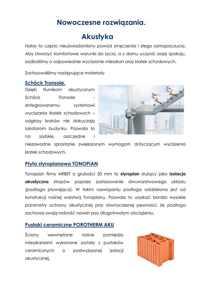 Nowoczesne rozwiązania. Akustyka Hałas to często nieuświadomiony powód zmęczenia i złego samopoczucia. Hałas do to życia, często Aby stworzyć komfortowe warunki a z domu uczynić oazę spokoju, zadbaliśmy o odpowiednie nieuświadomiony wyciszanie mieszkań oraz klatek schodowych. powód zmęczenia i Zastosowaliśmy następujące materiały złego Schöck Tronsole. samopoczucia. Dzięki tłumikom akustycznym Aby stworzyć Schöck Tronsole komfortowe zintegrowanemu systemowi warunki do życia, a wyciszania klatek schodowych – z domu uczynić odgłosy kroków nie dokuczają oazę spokoju, lokatorom budynku. Pozwala to zadbaliśmy o na szybkie, oszczędne i odpowiednie niezawodne sprostanie zwiększonym wymogom dotyczącym wyciszenia wyciszanie mieszka klatek schodowych. ń oraz klatek schodowych. Płyta styropianowa TONOPIAN Zastosowaliśmy Tonopian firmy ARBET o grubości 30 mm to styropian służący jako izolacja następujące akustyczna stropów poprzez zastosowanie dwuwarstwowego układu materiały (podłoga pływająca). W takim rozwiązaniu podłoga oddzielona jest od Tronsole. konstrukcji nośnej warstwą Schöck Tonopianu. Pozwala to uzyskać bardzo wysokie Dzięki tłumikom parametry ochrony akustycznej przy równoczesnej pewności, że podłoga akustycznym zachowa swoją nośność nawet przy długotrwałym obciążeniu. Schöck Tronsole Pustaki ceramiczne POROTHERM AKU zintegrowanemu Ściany wewnętrzne systemowi nośne pomiędzy wyciszania klatek mieszkaniami wykonane zostały z pustaków ceramicznych akustycznej. o schodowych izolacji – podwyższonej odgłosy kroków nie dokuczają lokatorom budynku. to na oszczędne Pozwala szybkie, i IZOLACJA TERMICZNA Pustaki ceramiczne POROTHERM + 15 cm styropian Ściany zewnętrzne wykonane są z pustaków ceramicznych porotherm 25 P+W. Jako izolację termiczną zastosowaliśmy styropian grubości 15cm. Współczynnik przenikania ciepła dla takiej ściany wynosi 0,21 W/m2K. ISOKORB – izolacja termiczna balkonów i loggi Mostki cieplne są często przyczyną szkód budowlanych, takich jak wilgotne ściany i powstawanie pleśni. Problem ten występuje na wystających elementach konstrukcyjnych, na przykład na balkonach. W naszych budynkach stosujemy poniższe rozwiązania techniczne: ISOKORB - Schöck Isokorb jest nośnym elementem izolacji cieplnej balkonów i loggi do termicznego izolowania wystających elementów konstrukcyjnych. Isokorb likwiduje mostki cieplne, zapobiega kondensacji pary wodnej na powierzchni przegrody i rozwojowi grzybów pleśniowych. CIEPŁE PARAPETY Zastosowaliśmy profil podokienny z twardego styropianu, który gruntownie i efektywnie poprawił jakość montażu stolarki okiennej a przede wszystkim poprawiliśmy właściwości termiczne i energetyczne budynku Profile przystosowane są do konkretnego systemu okien i drzwi PCV, dzięki czemu doskonale izolują i uszczelniają przestrzeń pod oknami Zalety: - znaczne zmniejszenie kosztów zużycia energii - dwukrotne zmniejszenie straty ciepła - likwidacja mostków termicznych - brak zawilgoceń, pleśni i grzybów - brak pleśni i grzybów - poprawa mikroklimatu pomieszczeń BEZPIECZEŃSTWO Spółdzielnia systematycznie wdraża system monitoringu osiedla mieszkaniowych. System umożliwia administratorom osiedla dostęp do wybranych kamer, oraz podgląd do nagranego na rejestratorach materiału filmowego a także samym mieszkańcom monitorowanych budynków na domowym komputerze, np. obrazu z kamery na placu zabaw bądź z wjazdu do garażu. Nowoczesna infrastruktura internetowa pozwala użycie na budynków kamer IP, co znacznie obniża koszty instalacji systemu monitoringu oraz elastyczność. System zwiększa może jego być w dowolnym czasie powiększany o nowe punkty kamerowe oraz modyfikowany w zakresie rozmieszczenia stanowisk operatorskich. NMS w połączeniu z nowoczesnymi megapikselowymi kamerami IP gwarantuje wysokiej jakości obraz Full HD i pozwala na dokładniejszą identyfikację ludzi oraz pojazdów. Każde mieszkanie w nowym budynku wyposażone jest w wideodomofon z kolorowym ekranem LCD pozwalające na monitorowanie wchodzących do klatki schodowej. osób OŚWIETLENIE W naszym budynku stosujemy rozwiązania znacznie zmniejszające zużycie energii elektrycznej. Oświetlenie klatek schodowych, garażu podziemnego oparte jest na czujnikach ruchu. Do oświetlenia zewnętrznego zastosowaliśmy żarówki LED. Oświetlenie sterowane jest zegarem astronomicznym. NOWOCZESNA TECHNIKA INSTALACYJNA Instalacje sanitarne W budynku stosujemy materiały firmy TECE oraz WAVIN Rury TECEflex połączone są ze złączkami w trwały sposób za pomocą osiowej (aksjalnej) techniki zaciskowej. Jako uszczelnienie wykorzystuje się wyłącznie materiał, z którego zbudowana jest rura. Instalacja nie wymaga zastosowania żadnych innych środków pomocniczych, jak np. pierścienie typu O-ring lub taśmy uszczelniającej. Preferowana przez firmę TECE technika łączeniowa bez pierścieni typu O-ring jest bardziej tolerancyjna na błędy i szczególnie higieniczna. Rury kompozytowe TECEflex wyposażone są w rurę wewnętrzną PE-Xc czyli usieciowanym Materiał polietylenem metoda PE-Xc fizyczną. wyróżnia się szczególnie silnym efektem „pamięci kształtu”, który powoduje, że po rozpęczeniu rury, materiał kurczy się na końcu złączki. Tuleja zaciskowa jest nasuwana na rozpęczoną rurę do kołnierza złączki. Kanalizacja sanitarna niskoszumowa Dokuczliwe odgłosy pochodzące od instalacji kanalizacyjnej minimalizujemy stosując sprawdzone systemy niskoszumowe firmy Wavin. Do pomiaru ilości zużytego ciepła stosujemy: T550 (UH50) - ciepłomierz węzłowy ultradźwiękowy Ciepłomierz T550 przeznaczony jest do pomiaru zużycia ciepła w węzłach cieplnych lub ogrzewania. instalacjach Może być centralnego stosowany do pomiaru ilości ciepła, ciepła i chłodu – wersja kombi, lub jako licznik chłodu (montaż wyłącznie na powrocie)