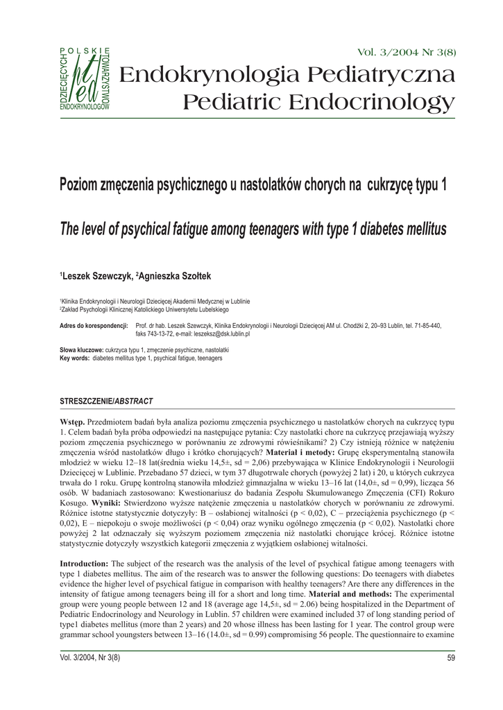 Vol. 3/2004 Nr 3(8) Endokrynologia Pediatryczna Pediatric Endocrinology Poziom zmęczenia psychicznego u nastolatków chorych na cukrzycę typu 1 The level of psychical fatigue among teenagers with type 1 diabetes mellitus 1 1 2 Leszek Szewczyk, 2Agnieszka Szołtek Klinika Endokrynologii i Neurologii Dziecięcej Akademii Medycznej w Lublinie Zakład Psychologii Klinicznej Katolickiego Uniwersytetu Lubelskiego Adres do korespondencji: Prof. dr hab. Leszek Szewczyk, Klinika Endokrynologii i Neurologii Dziecięcej AM ul. Chodźki 2, 20–93 Lublin, tel. 71-85-440, faks 743-13-72, e-mail: [email protected] Słowa kluczowe: cukrzyca typu 1, zmęczenie psychiczne, nastolatki Key words: diabetes mellitus type 1, psychical fatigue, teenagers STRESZCZENIE/ STRESZCZENIE/ABSTRACT Wstęp. Przedmiotem badań była analiza poziomu zmęczenia psychicznego u nastolatków chorych na cukrzycę typu 1. Celem badań była próba odpowiedzi na następujące pytania: Czy nastolatki chore na cukrzycę przejawiają wyższy poziom zmęczenia psychicznego w porównaniu ze zdrowymi rówieśnikami? 2) Czy istnieją różnice w natężeniu zmęczenia wśród nastolatków długo i krótko chorujących? Materiał i metody: Grupę eksperymentalną stanowiła młodzież w wieku 12–18 lat(średnia wieku 14,5±, sd = 2,06) przebywająca w Klinice Endokrynologii i Neurologii Dziecięcej w Lublinie. Przebadano 57 dzieci, w tym 37 długotrwale chorych (powyżej 2 lat) i 20, u których cukrzyca trwała do 1 roku. Grupę kontrolną stanowiła młodzież gimnazjalna w wieku 13–16 lat (14,0±, sd = 0,99), licząca 56 osób. W badaniach zastosowano: Kwestionariusz do badania Zespołu Skumulowanego Zmęczenia (CFI) Rokuro Kosugo. Wyniki: Stwierdzono wyższe natężenie zmęczenia u nastolatków chorych w porównaniu ze zdrowymi. Różnice istotne statystycznie dotyczyły: B – osłabionej witalności (p < 0,02), C – przeciążenia psychicznego (p < 0,02), E – niepokoju o swoje możliwości (p < 0,04) oraz wyniku ogólnego zmęczenia (p < 0,02). Nastolatki chore powyżej 2 lat odznaczały się wyższym poziomem zmęczenia niż nastolatki chorujące krócej. Różnice istotne statystycznie dotyczyły wszystkich kategorii zmęczenia z wyjątkiem osłabionej witalności. Introduction: The subject of the research was the analysis of the level of psychical fatigue among teenagers with type 1 diabetes mellitus. The aim of the research was to answer the following questions: Do teenagers with diabetes evidence the higher level of psychical fatigue in comparison with healthy teenagers? Are there any differences in the intensity of fatigue among teenagers being ill for a short and long time. Material and methods: The experimental group were young people between 12 and 18 (average age 14,5±, sd = 2.06) being hospitalized in the Department of Pediatric Endocrinology and Neurology in Lublin. 57 children were examined included 37 of long standing period of type1 diabetes mellitus (more than 2 years) and 20 whose illness has been lasting for 1 year. The control group were grammar school youngsters between 13–16 (14.0±, sd = 0.99) compromising 56 people. The questionnaire to examine Vol. 3/2004, Nr 3(8) 59 Praca oryginalna Endokrynol. Ped., 3/2004;3(8):59-65 the Cumulative Fatigue Index (CFI) by Rokuro Kosugo was used in the research. Results: Higher intensity of fatigue among ill teenagers was stated in comparison with healthy teenagers. Substantial differences refer to: B – weakened vitality (p < 0.02), C – psychic surcharge (p < 0.02), E – anxiety about their capabilities (p < 0.04) and the results of general fatigue (p < 0.02). Teenagers with diabetes for more than 2 years characterized with a higher level of fatigue than teenagers being ill for a shorter time. Substantial differences concerned all the categories of fatigue except for weakened vitality. Dzieci przewlekle chore wykazują większą podatność na zmęczenie, która jest efektem długotrwałego, nadmiernego przeciążenia układu nerwowego dziecka, co pociąga za sobą konsekwencje w postaci zmniejszonej wydolności fizycznej i psychicznej. Objawy zmęczenia zależą od ogólnego stanu zdrowia dziecka, jego cech osobowości, a także interakcji społecznych. Obciążenie psychiczne, będące skutkiem choroby przewlekłej, obejmuje czynniki fizjologiczne, psychologiczne i społeczne. Wśród objawów nadmiernego obciążenia psychicznego wymienia się: wzmożoną męczliwość, trudności w skupieniu uwagi, drażliwość prowadzącą do agresywności lub wycofania się, bierność, apatię [8]. Zmęczenie odbiera radość życia, ogranicza wydajność pracy, uniemożliwia rozwój, prowadzi do wyobcowania, a to z kolei nasila podstawowe dolegliwości. Powstaje tym samym błędne koło przyczyn i skutków, z którym trudno sobie poradzić [9]. Wstęp Konsekwencją długotrwałego trwania cukrzycy, a tym samym obniżenia odporności psychicznej, może być ujawnienie się zmęczenia psychicznego i fizycznego. Utrzymujące się ponad 6 miesięcy zmęczenie o charakterze przewlekłym lub nawracającym, lub nadmierna męczliwość, a także wykluczenie innych zaburzeń klinicznych stanowi kryteriiu rozpoznania zespołu chronicznego zmęczenia (Chronic Fatigue Syndrom – CFS). Termin „zespół przewlekłego zmęczenia” wprowadzili badacze z Centrum Kontroli Zachorowań w Atlancie (Centre Centre for Disease Control – CDC), chcąc opisać schorzenie o nieznanej etiologii, którego podstawowym objawem jest utrzymujące się przez wiele miesięcy zmęczenie o charakterze zarówno fizycznym, jak i psychicznym, współwystępujące z różnymi niespecyficznymi objawami [1, 2]. Zdefiniowanie zespołu skumulowanego zmęczenia przysparzało badaczom licznych trudności, ponieważ objawy CFS są często niewyraźne, część z nich należy do obrazu innych chorób, dolegliwości są zamaskowane, odczuwane tylko przez cierpiącego, a trudne do wychwycenia przez obserwatora