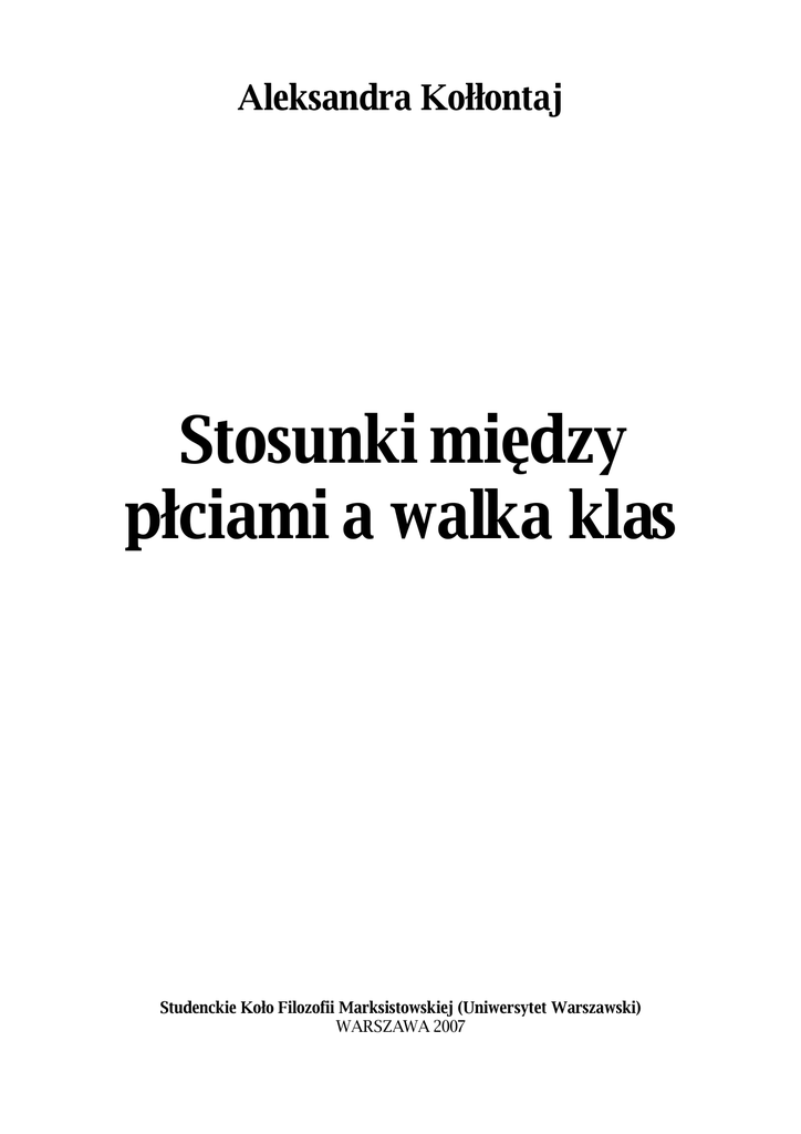 Aleksandra Kołłontaj Stosunki między płciami a walka klas Studenckie Koło Filozofii Marksistowskiej (Uniwersytet Warszawski) WARSZAWA 2007 Aleksandra Kołłontaj – Stosunki między płciami a walka klas (1921 rok) Artykuł Aleksandry Kołłontaj „Stosunki między płciami a walka klas” został napisany i opublikowany w 1921 roku. Polski tekst został opracowany na podstawie angielskiego wydania: Alexandra Kollontai, Selected Writings, Allison & Busby, 1977, tłumaczenie angielskie: Alix Holt, 1972. Podstawa niniejszego wydania: Półrocznik polityczno-artystyczny „Lewą Nogą” nr 16, 2004 r. Tłumaczenie z języka angielskiego: Mariusz Turowski. -2© Studenckie Koło Filozofii Marksistowskiej (UW) www.skfm-uw.w.pl Aleksandra Kołłontaj – Stosunki między płciami a walka klas (1921 rok) Spośród licznych problemów trapiących i przyciągających uwagę współczesnego człowieka, bez wątpienia jednym z najbardziej kluczowych jest płeć. W każdym kraju czy społeczności, może poza legendarnymi „wyspami”, kwestia relacji między płciami traktowana jest jako coś nadzwyczaj pilnego i doniosłego. Dzisiejszy człowiek żyje w poczuciu narastającego kryzysu płci. Im dłużej on trwa, tym więcej szkód i spustoszenia wywołuje. Spoglądając na długie dzieje ludzkości, nie znajdziemy prawdopodobnie okresu, w którym zagadnienie płci odgrywałoby centralną rolę w życiu społeczeństwa; w którym problem relacji między płciami potrafiłby magnetycznie przyciągać uwagę milionów zatroskanych ludzi; gdy dramaty rozgrywające się wokół płci stanowiłyby źródło inspiracji dla wszelkiego rodzaju aktywności artystycznej. W obliczu trwania i intensyfikacji kryzysu płci, ludzie coraz częściej zdają sobie sprawę z własnego zagubienia, z nieudolności usiłowań rozwiązania tego, co „nierozwiązywalne”. Każda próba rozgryzienia tego problemu kończy się jeszcze większym zaciśnięciem skomplikowanego supła relacji międzyosobowych. To tak, jakbyśmy nie byli w stanie dojrzeć jedynego, najważniejszego wątku, który mógłby doprowadzić nas do zadowalającego uporania się z tym zadaniem. Problem płci to zaklęty krąg: tkwimy w nim niezależnie od tego, jak bardzo jesteśmy zdeterminowani, bez względu na to, ile sposobów na wyrwanie się z niego wypróbowaliśmy. Konserwatywnie nastawieni przedstawiciele ludzkości twierdzą, że powinniśmy powrócić do szczęśliwych chwil z naszej przeszłości i odtworzyć stare fundamenty, na których opierała się rodzina oraz wzmocnić sprawdzone już normy seksualne, istniejące od najdawniejszych czasów. Piewcy burżuazyjnego indywidualizmu głoszą konieczność zniszczenia wszelkiej hipokryzji, prowadzącej do ograniczeń, z którymi związane są starodawne kodeksy zachowań seksualnych. Wszystkie te zbyteczne i szkodliwe relikty należy odsunąć tam, gdzie ich miejsce – do muzeum. Tylko jednostkowe sumienie i wola są w stanie decydować w sprawach związanych ze sferą intymności. Z drugiej strony socjaliści oznajmiają, że problemy dotyczące płci zostaną przezwyciężone tylko wtedy, gdy dokona się całkowitej przebudowy socjalnych i ekonomicznych struktur społeczeństwa. Czy to „odkładanie na jutro” nie potwierdza w wystarczającym stopniu faktu, że wciąż brakuje nam tego jedynego „zaczarowanego wątku”, prowadzącego do rozsupłania zagadki? Czy możliwe jest odnalezienie, czy choćby natrafienie na ślad tego wątku – już dzisiaj, teraz? Historia ludzkich społeczności, dzieje walki pomiędzy poszczególnymi grupami i klasami społecznymi posiadającymi przeciwstawne interesy, daje nam pewne wskazówki, dzięki którym możemy rozpocząć nasze poszukiwania. Ludzkość doświadcza kryzysu związanego z relacjami między płciami nie po raz pierwszy. Już wcześniej zdarzało się, że presja potoku nowych wartości i ideałów prowadziła do rozmywania dotychczas obowiązujących – wyraźnych i stanowczych – znaczeń „seksualnych”, nakazów moralnych. „Kryzys seksualny” dał o sobie znać szczególnie w okresie Renesansu i Reformacji, gdy w wyniku zawirowań społecznych doszło do usunięcia w tło dumnej, patriarchalnej szlachty feudalnej, przyzwyczajonej do władzy absolutnej, i stworzenia warunków do pojawienia się i umocnienia nowej siły w społeczeństwie – burżuazji. Moralność seksualna świata feudalnego była zakorzeniona głęboko w – typowych dla życia plemiennego – gospodarce kolektywnej i autorytarnej, wodzowskiej władzy, które tłumiły jednostkową wolę poszczególnych członków „szczepu”. Musiała się ona zderzyć z nowym, obcym kodeksem moralnym rosnącej w siłę burżuazji. Burżuazyjna moralność seksualna bazuje na zasadach stojących w sprzeczności z podstawami moralności feudalizmu. Zdecydowany indywidualizm oraz wykluczający charakter i izolacja „rodziny nuklearnej” zastępują ideał pracy kolektywnej, charakterystyczny zarówno dla lokalnych, jak i regionalnych struktur gospodarczych życia patrymonialnego. Kapitalizm oznaczał rozwinięcie etyki konkurencji, triumf indywidualizmu oraz zasad „ekskluzywnej” własności prywatnej, które doprowadziły do erozji pozostałości po idei wspólnoty, obowiązującej, do pewnego stopnia, we wszystkich społecznościach plemiennych. Przez cały wiek, w którym trwała żmudna, laboratoryjna transformacja starych norm w nowe formuły mające zapewnić harmonię ideałów moralnych, człowiek włóczył się zagubiony między dwoma całkowicie odmiennymi światami zasad moralnych, starając się dopasować do każdego z nich. -3© Studenckie Koło Filozofii Marksistowskiej (UW) www.skfm-uw.w.pl Aleksandra Kołłontaj – Stosunki między płciami a walka klas (1921 rok) Jednak w tejże radosnej i barwnej epoce zmian kryzys płci, mimo swojej intensywności, nie przybrał postaci zagrożenia, które wydaje się nieść ze sobą dzisiaj. Stało