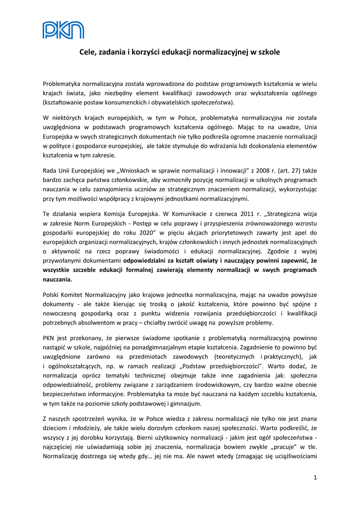 Cele, zadania i korzyści edukacji normalizacyjnej w szkole Problematyka normalizacyjna została wprowadzona do podstaw programowych kształcenia w wielu krajach świata, jako niezbędny element kwalifikacji zawodowych oraz wykształcenia ogólnego (kształtowanie postaw konsumenckich i obywatelskich społeczeństwa). W niektórych krajach europejskich, w tym w Polsce, problematyka normalizacyjna nie została uwzględniona w podstawach programowych kształcenia ogólnego. Mając to na uwadze, Unia Europejska w swych strategicznych dokumentach nie tylko podkreśla ogromne znaczenie normalizacji w polityce i gospodarce europejskiej, ale także stymuluje do wdrażania lub doskonalenia elementów kształcenia w tym zakresie. Rada Unii Europejskiej we „Wnioskach w sprawie normalizacji i innowacji” z 2008 r. (art. 27) także bardzo zachęca państwa członkowskie, aby wzmocniły pozycję normalizacji w szkolnych programach nauczania w celu zaznajomienia uczniów ze strategicznym znaczeniem normalizacji, wykorzystując przy tym możliwości współpracy z krajowymi jednostkami normalizacyjnymi. Te działania wspiera Komisja Europejska. W Komunikacie z czerwca 2011 r. „Strategiczna wizja w zakresie Norm Europejskich - Postęp w celu poprawy i przyspieszenia zrównoważonego wzrostu gospodarki europejskiej do roku 2020” w pięciu akcjach priorytetowych zawarty jest apel do europejskich organizacji normalizacyjnych, krajów członkowskich i innych jednostek normalizacyjnych o aktywność na rzecz poprawy świadomości i edukacji normalizacyjnej. Zgodnie z wyżej przywołanymi dokumentami odpowiedzialni za kształt oświaty i nauczający powinni zapewnić, że wszystkie szczeble edukacji formalnej zawierają elementy normalizacji w swych programach nauczania. Polski Komitet Normalizacyjny jako krajowa jednostka normalizacyjna, mając na uwadze powyższe dokumenty - ale także kierując się troską o jakość kształcenia, które powinno być spójne z nowoczesną gospodarką oraz z punktu widzenia rozwijania przedsiębiorczości i kwalifikacji potrzebnych absolwentom w pracy – chciałby zwrócić uwagę na powyższe problemy. PKN jest przekonany, że pierwsze świadome spotkanie z problematyką normalizacyjną powinno nastąpić w szkole, najpóźniej na ponadgimnazjalnym etapie kształcenia. Zagadnienie to powinno być uwzględnione zarówno na przedmiotach zawodowych (teoretycznych i praktycznych), jak i ogólnokształcących, np. w ramach realizacji „Podstaw przedsiębiorczości”. Warto dodać, że normalizacja oprócz tematyki technicznej obejmuje także inne zagadnienia jak: społeczna odpowiedzialność, problemy związane z zarządzaniem środowiskowym, czy bardzo ważne obecnie bezpieczeństwo informacyjne. Problematyka ta może być nauczana na każdym szczeblu kształcenia, w tym także na poziomie szkoły podstawowej i gimnazjum. Z naszych spostrzeżeń wynika, że w Polsce wiedza z zakresu normalizacji nie tylko nie jest znana dzieciom i młodzieży, ale także wielu dorosłym członkom naszej społeczności. Warto podkreślić, że wszyscy z jej dorobku korzystają. Bierni użytkownicy normalizacji - jakim jest ogół społeczeństwa najczęściej nie uświadamiają sobie jej znaczenia, normalizacja bowiem zwykle „pracuje” w tle. Normalizację dostrzega się wtedy gdy… jej nie ma. Ale nawet wtedy (zmagając się uciążliwościami 1 codziennego życia) także nie mamy świadomości w czym tkwi problem. A wynika to z braku kształcenia w tym zakresie. Termin „normalizacja” nie występuje eksplicite w programach kształcenia ogólnokształcącego, co zauważa Ministerstwo Edukacji Narodowej. Jednakże w piśmie do Prezesa PKN1 Minister przyznaje, że „wiele treści łączy się z tą problematyką i pozwala na szersze włączenie jej do realizowanych programów nauczania”. Aby to zrealizować „w opinii MEN należy, dla szerszego uwzględnienia problematyki normalizacji w kształceniu ogólnym, w pierwszej kolejności skupić się na zapewnieniu nauczycielom wybranych przedmiotów (wiedzy o społeczeństwie, podstaw przedsiębiorczości i ekonomii w praktyce oraz informatyki/zajęć komputerowych) dostępu do materiałów”, i wiedzy z zakresu normalizacji. MEN proponuje, aby przede wszystkim problematykę normalizacji przybliżyć „placówkom doskonalenia nauczycieli, których zadaniem jest organizowanie i prowadzenie doskonalenia zawodowego nauczycieli m.in. w zakresie realizacji podstaw programowych, w tym opracowywania programów nauczania.” W kwestii rozwijania wiedzy normalizacyjnej wśród uczniów w kształceniu zawodowym, problematyka normalizacyjna jest ujęta explicite w podstawie programowej. Zgodnie z Rozporządzeniem z dnia 7 lutego 2012 r. w sprawie podstawy programowej kształcenia w zawodach „od uczniów (słuchaczy) oczekuje się nabycia umiejętności korzystania z norm odpowiednich dla nauczanych zawodów (…) związanych z techniką, bezpieczeństwem informacyjnym i internetowym, bezpieczeństwem żywności, czy ochroną środowiska”. Zgodnie z tym, istnieje porozumienie co do tego, że każdy uczeń powinien mieć możliwość poznania zagadnień normalizacji oraz jej wpływu na własne życie w chwili obecnej oraz w przyszłości. Aby to osiągnąć należy, jak podkreśla MEN, wyposażyć w stosowną wiedzę najpierw nauczycieli poszczególnych przedmiotów oraz zapoznać z tą problematyką dyrektorów szkół. Poniżej przedstawiamy wybrane przykłady wykorzystania normalizacji w procesie dydaktycznowychowawczym kształcenia ogólnego oraz zawodowego. Kształcenie ogólne W kształceniu ogólnym wykorzystanie normalizacji może być realizowane na wielu przedmiotach, normalizacja bowiem, jak wspomniano wyżej, proponuje rozwiązania istotnych zagadnień współczesności z zakresu m.in.: jakości, bezpieczeństwa informacyjnego, odpowiedzialności społecznej, ochrony środowiska, bezpieczeństwa i higieny pracy. W tym opr