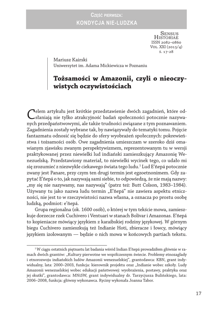 Część pierwsza: kondycja nie-ludzka Sensus Historiae ISSN 2082–0860 Vol. XXI (2015/4) s. 17-28 Mariusz Kairski Uniwersytet im. Adama Mickiewicza w Poznaniu Tożsamości w Amazonii, czyli o nieoczywistych oczywistościach C elem artykułu jest krótkie przedstawienie dwóch zagadnień, które odsłaniają nie tylko atrakcyjność badań społeczności potocznie nazywanych przedpaństwowymi, ale także trudności związane z tym poznawaniem. Zagadnienia zostały wybrane tak, by nawiązywały do tematyki tomu. Pojęcie fantazmatu odnosić się będzie do sfery wyobrażeń społecznych: pokrewieństwa i tożsamości osób. Owe zagadnienia umieszczam w szeroko dziś omawianym zjawisku zwanym perspektywizmem, reprezentowanym tu w wersji praktykowanej przez niewielki lud indiański zamieszkujący Amazonię Wenezuelską. Przedstawiony materiał, to niewielki wycinek tego, co udało mi się zrozumieć z niezwykle ciekawego świata tego ludu.1 Lud E’ñepá potocznie zwany jest Panare, przy czym ten drugi termin jest egzoetnonimem. Gdy zapytać E’ñepá o to, jak nazywają sami siebie, to odpowiedzą, że nie mają nazwy: „my się nie nazywamy, nas nazywają” (patrz też: Butt Colson, 1983–1984). Używany tu jako nazwa ludu termin „E’ñepá” nie zawiera aspektu etniczności, nie jest to w rzeczywistości nazwa własna, a oznacza po prostu osobę ludzką, podmiot: e’ñepá. Grupa regionalna (ok. 1600 osób), o której w tym tekście mowa, zamieszkuje dorzecze rzek Cuchivero i Ventuari w stanach Bolívar i Amazonas. E’ñepá to kopieniacze mówiący językiem z karaibskiej rodziny językowej. W górnym biegu Cuchivero zamieszkują też Indianie Hoti, zbieracze i łowcy, mówiący językiem izolowanym — będzie o nich mowa w końcowych partiach tekstu. W ciągu ostatnich piętnastu lat badania wśród Indian E’ñepá prowadziłem głównie w ramach dwóch grantów: „Kultury pierwotne we współczesnym świecie. Problemy etnozagłady i etnorozwoju indiańskich ludów Amazonii wenezuelskiej”, grantodawca: KBN, grant indywidualny, lata: 2000–2003, funkcja: kierownik projektu oraz „Indianie wobec szkoły. Ludy Amazonii wenezuelskiej wobec edukacji państwowej: wyobrażenia, postawy, praktyka oraz jej skutki”, grantodawca: MNiSW, grant indywidualny dr. Tarzycjusza Bulińskiego, lata: 2006–2008, funkcja: główny wykonawca. Ryciny wykonała Joanna Tabor. 1 17 Mariusz Kairski Wiedzę o E’ñepá (a oni o mnie) zdobywałem poprzez wielomiesięczne pobyty głównie w trzech miejscach: (1)San José de Kayamá, w górnym biegu Cuchivero. Jest to grupa lokalna, z której wzięła początek większość pozostałych grup lokalnych E’ñepá południowych. Zamieszkuje obszar najbardziej izolowany geograficznie — można do niej dotrzeć awionetką, albo maszerując wiele dni przez pokryte tropikalnym lasem wzgórza i nizinne sawanny. Kontakt tej grupy z przedstawicielami społeczeństwa wenezuelskiego jest znikomy. Od prawie 30 lat istnieje tu misja katolicka i zakonnice są jedynymi osobami z zewnątrz przebywającymi tu na stałe. Region rzeki Kayamá pierwotnie był miejscem zamieszkiwanym wyłącznie przez E’ñepá, ale wraz z pojawieniem się misji zaczęli się w nim osiedlać także Indianie Hoti, prowadzący do tej pory zbieracko-łowiecki tryb życia na południe od rzeki Kayamá. Aktualnie populacja Indian Hoti jest większa (600 osób) niż E’ñepá (500 osób). Nie ma żadnej aktywności ekonomicznej przedstawicieli społeczeństwa wenezuelskiego w tym regionie, poza próbami wprowadzania nowych upraw przez sióstry zakonne. W latach 30. i 40. XX w. E’ñepá utrzymywali sporadyczne kontakty z kilkoma wenezuelskimi kupcami sarapii (Dipteryx odorata, Dipteryx punctata), którzy podejmowali daleki wyprawy handlowe z Caicara del Orinoco aż po górne Cuchivero. (2) Manteco w środkowym biegu Cuchivero. Grupa powstała ponad 50 lat temu, utworzyły ją osoby znad górnego Cuchivero. Osada znajduje się w pobliżu metyskiej wioski Candelaria, do której dochodzi ubity trakt, umożliwiający podróż samochodem z Caicara del Orinoco, miasta nad Orinoko. Kontakty z ludnością metyską są częste, a Indianie chętnie wyjeżdżają do Caicara w celu odwiedzin, zakupów lub pracy. W latach 1969–1992, niedaleko Manteco (1 godz. drogi pieszo), w metyskiej osadzie Laguna Sucia funkcjonowała misja katolicka wraz ze szkołą i internatem. Okazjonalnie ludzie z Manteco podejmują pracę zarobkową u okolicznych hodowców bydła, jednak nie stanowi ona podstawy ich egzystencji; (3)Cubarral. To także grupa wywodząca się z Kayamá. W ciągu 50 lat wielokrotnie zmieniała miejsce swojego zamieszkania, zawsze w regionie rzeki Zariapo. Aktualna osada powstała stosunkowo niedawno, znajduje się w odległości ok. 3 godzin drogi pieszo od ujścia rzeki Zariapo do Cuchivero. Kontakt z ludnością metyską jest raczej rzadki i dotyczy głównie wymiany ekonomicznej. W miarę regularnie dociera do Cubarral tylko dwójka obwoźnych handlarzy oraz pracownicy państwowej służby zdrowia. 18 Tożsamości w Amazonii czyli o nie-oczywistych oczywistościach Swojskie/Inne Jak sugeruje literatura przedmiotu (Viveiros de Castro 2000, 2004), jednym z najważniejszych problemów, z którym zmagają się Indianie Amazonii, to niejasność i niestałość tego, co zewnętrzne wobec grupy lub osoby, w opozycji do tego, co dla niej wewnętrzne. Zarówno u Indian E’ñepá, jak i na całym obszarze szeroko rozumianej wyżyny gujańskiej dominuje przekonanie, że to, co zewnętrzne, jest zawsze inne (termin e’ñepá: tonkanan), obce (itoto) i niebezpieczne (ta:ma nësë). To, co inne, jest też zawsze dane i naturalne, to właściwość wszelkich zjawisk, scena rzeczywistości. Z kolei to, co wewnętrzne, jest zawsze swojskie (piyakae), tożsame (piya) z czymś w rodzaju matrycy istniejącej od czasów mitycznych (pia), bezpieczne. Wewnętrze jest zawsze wytworzone/wytwarzane, jest fig